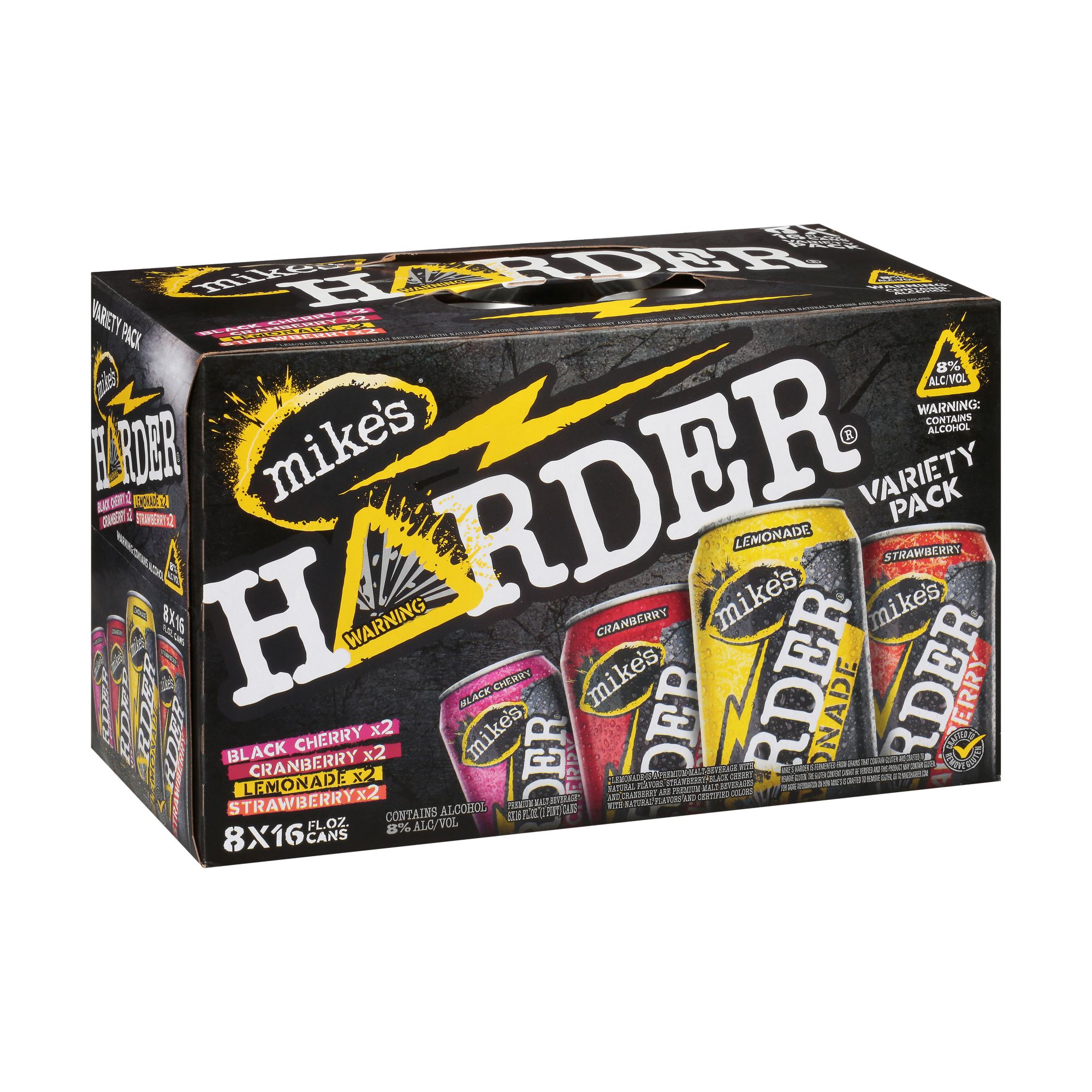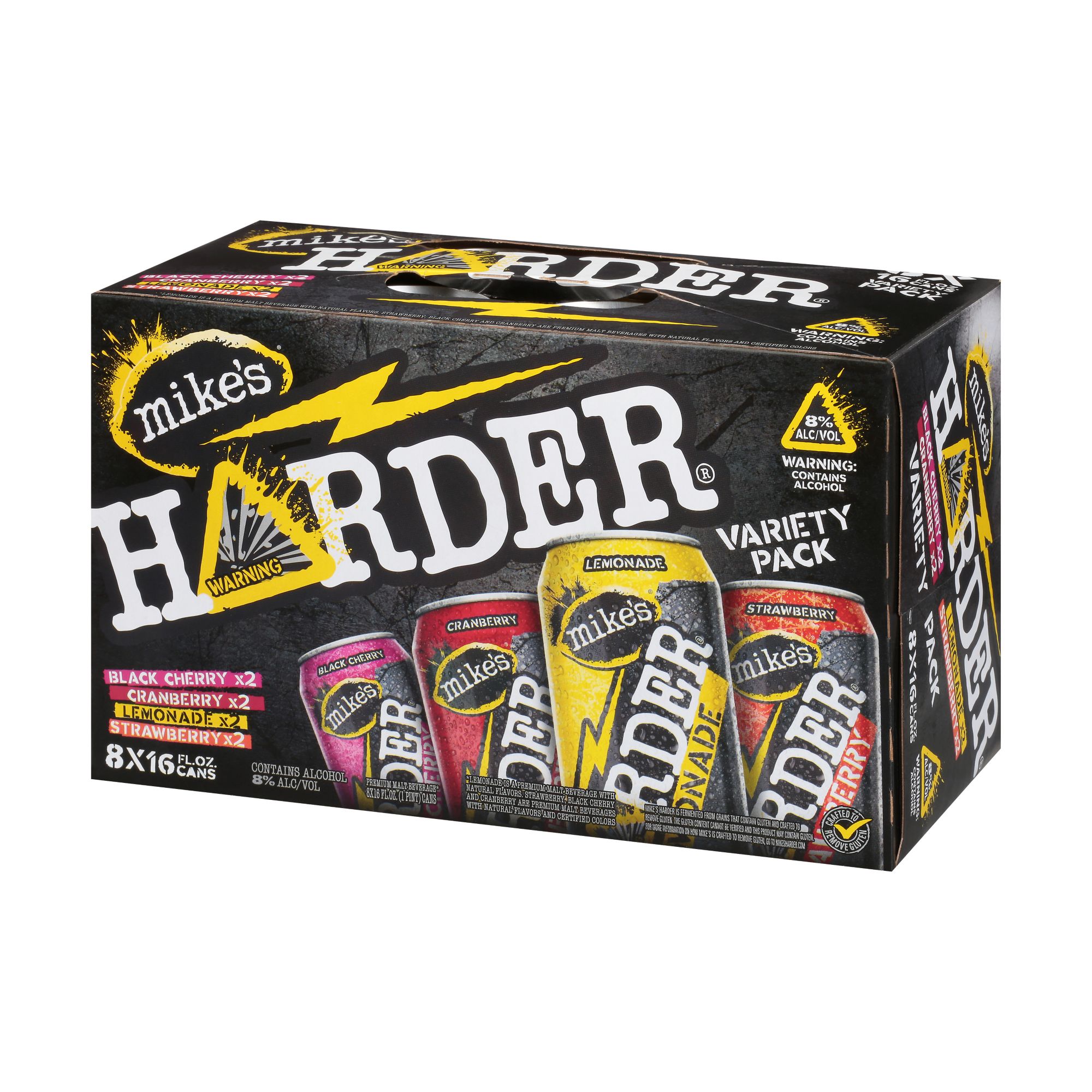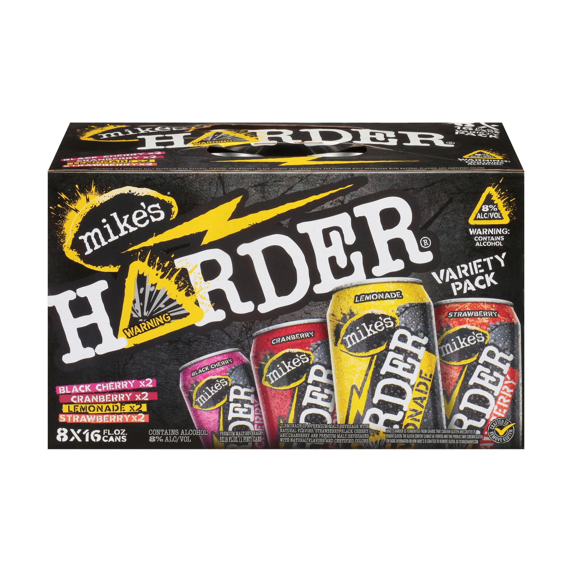 This pack includes Black Cherry - 2, Cranberry - 2, Lemonade - 2, Strawberry - 2. Premium malt beverage (Lemonade is a premium malt beverage with natural flavors. Strawberry, Black Cherry and Cranberry are premium malt beverages with natural flavors and certified colors). Flavored ale. Mike's Harder is fermented from grains that contain gluten and crafted to remove gluten. The gluten content cannot be verified and this product may contain gluten. For more information on how Mike's is crafted to remove gluten, go to mikesharder.com. Crafted to remove gluten. mikesharder.com. A strong opinion is hard to find. Gove us yours at mikesharder.com. Please recycle. 8% alc/vol. 16.