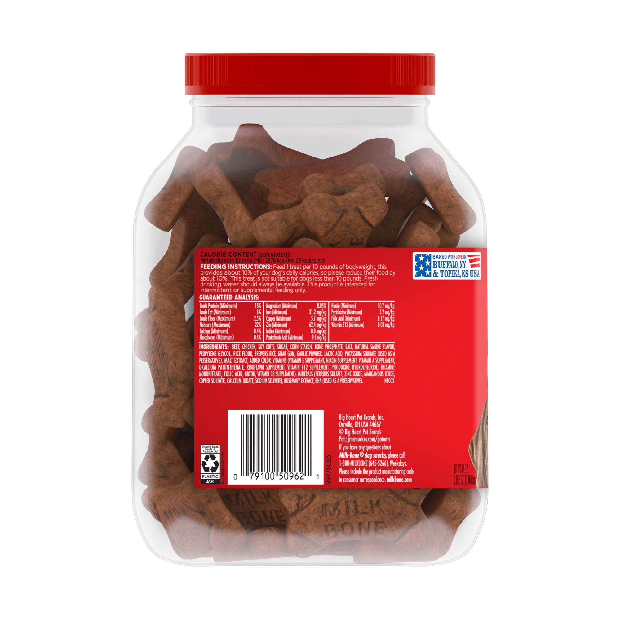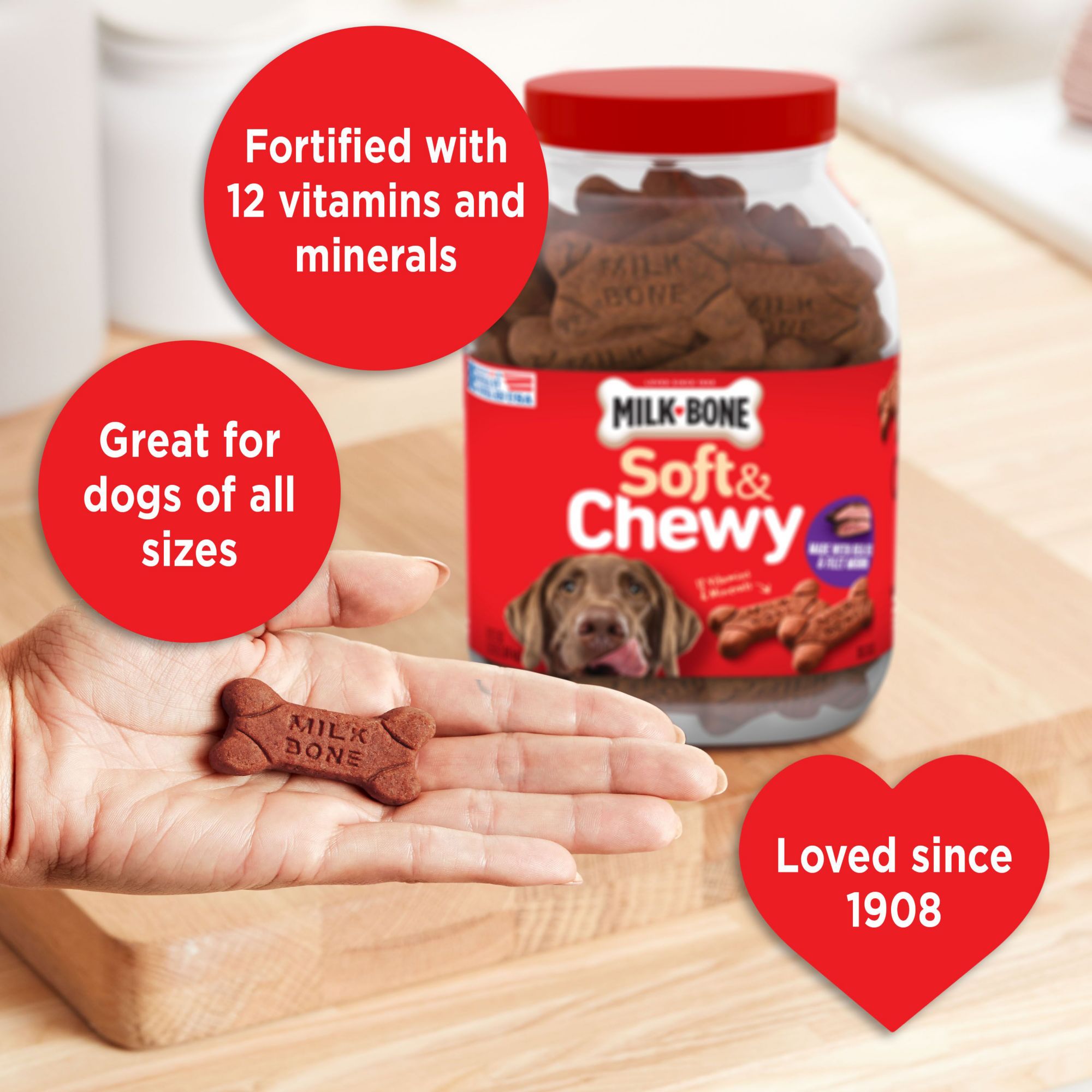 Loved since 1908 Contains one (1) 37-oz. container of Milk-Bone Soft & Chewy Beef & Filet Mignon Recipe With Chuck Roast dog treats