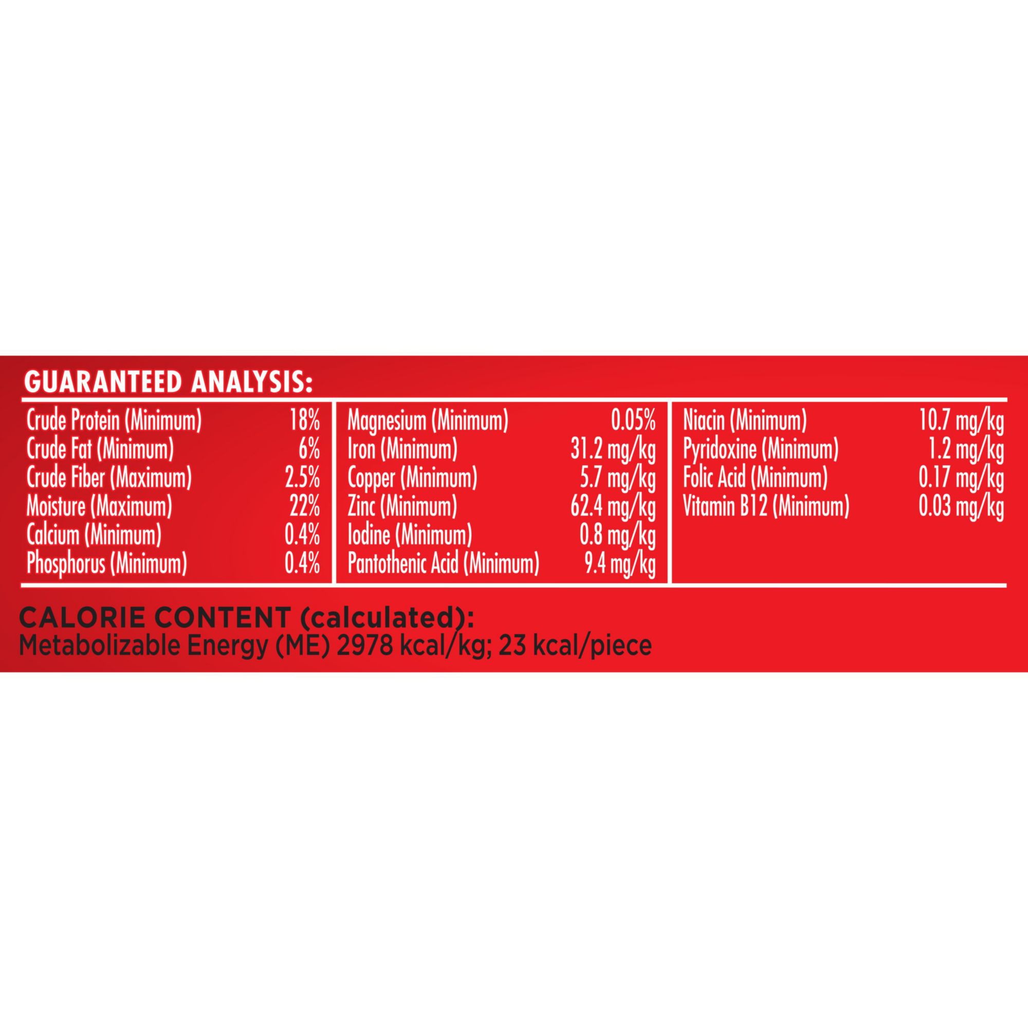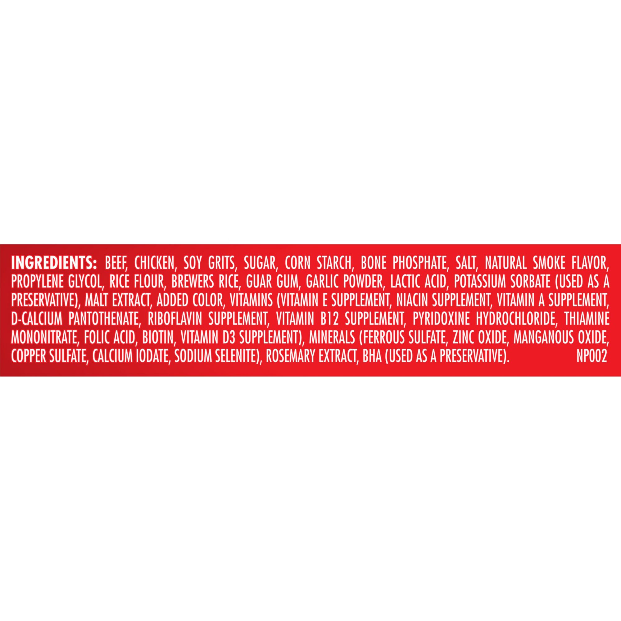 Beef, Chicken, Soy Grits, Sugar, Corn Starch, Filet Mignon, Chuck Roast, Dicalcium Phosphate, Salt, Natural Smoke Flavor, Propylene Glycol, Rice Flour, Guar Gum, Brewers Rice, Lactic Acid, Garlic Powder, Potassium Sorbate (used As A Preservative), Vitamins (vitamin E Supplement, Niacin Supplement, Vitamin A Supplement, D-calcium Pantothenate, Riboflavin Supplement, Pyridoxine Hydrochloride, Thiamine Mononitrate, Vitamin D3 Supplement, Folic Acid, Biotin, Vitamin B12 Supplement), Minerals (ferrous Sulfate, Zinc Oxide, Manganous Oxide, Copper Sulfate, Calcium Iodate, Sodium Selenite), Red 40, Yellow 5, Bha (used As A Preservative), Blue 2