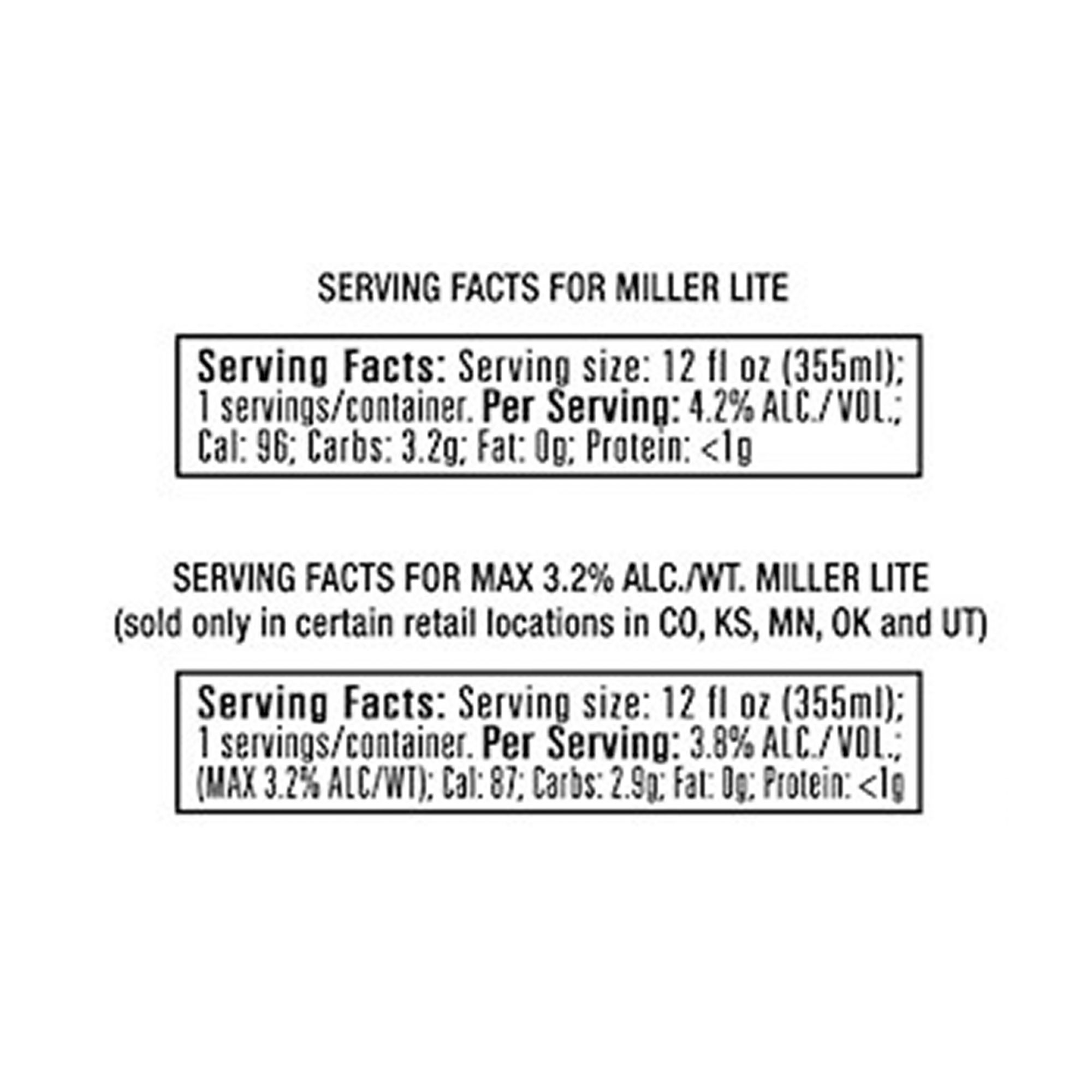 Only 96 calories per 12 fl. oz. A fine pilsner beer. Great beer. Great responsibility. Fine Pilsner Taste: Inside is a fine pilsner beer, brewed with the highest quality ingredients. The secret is Miller Lite's special triple hops brewing recipe. They use choice hops from the Pacific Northwest as well as noble Saaz hops and deliver more taste, aroma and color with only 96 calories. Since 1855. Contains no additives or preservatives. Sold only in certain retail locations in CO, KS, MN, OK and UT. For consumer questions call 1-800-Miller6. Please recycle. Please do not litter. 4.2% alc/vol. 8.4.