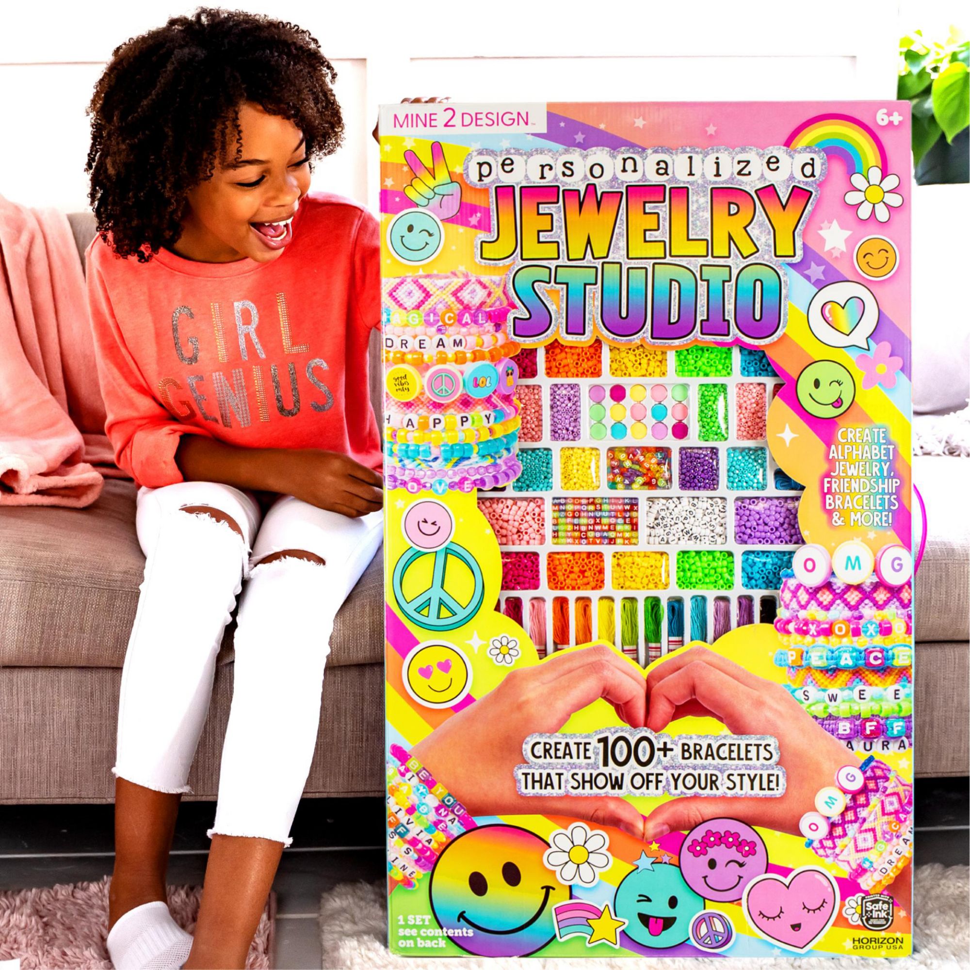 Spell out your style with the Mine 2 Design Personalized Jewelry Studio. Complete with thousands of colorful beads — including every letter of the alphabet — and a vibrant assortment of three different types of cording, this DIY bracelet-making kit has everything you need to create over 100 accessories to wear and share. Jump right in and start creating or follow the easy-to-understand instructions to learn how to master the trendiest friendship bracelet designs — from macramé to chevrons, knotted diagonals, and more. Create custom beads by sticking tons of positivity stickers onto the flat, circular beads to design one-of-a-kind accessories — or mix and match any of the shimmering diamond beads with mini pony beads for magical color schemes and patterns. Personalize your accessories with the letter beads — string your name, a monogram, or even fun phrases like “BFF” or “Dream Big” for the perfect Y2K style. Beading and braiding are great for strengthening fine motor skills and encouraging self-expression, all while having fun. Whether you’re looking for a sweet sleepover activity or a boredom buster, this bead kit is perfect for any aspiring fashion designer age 6+.