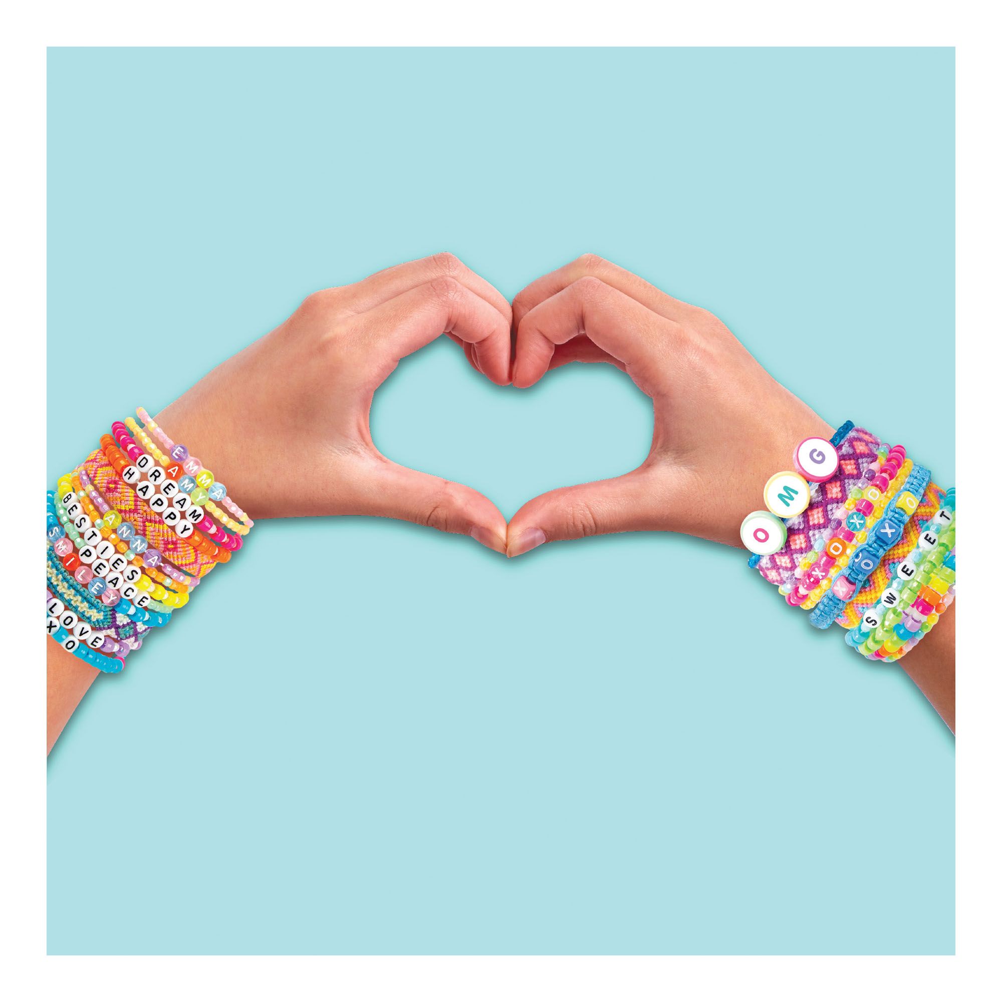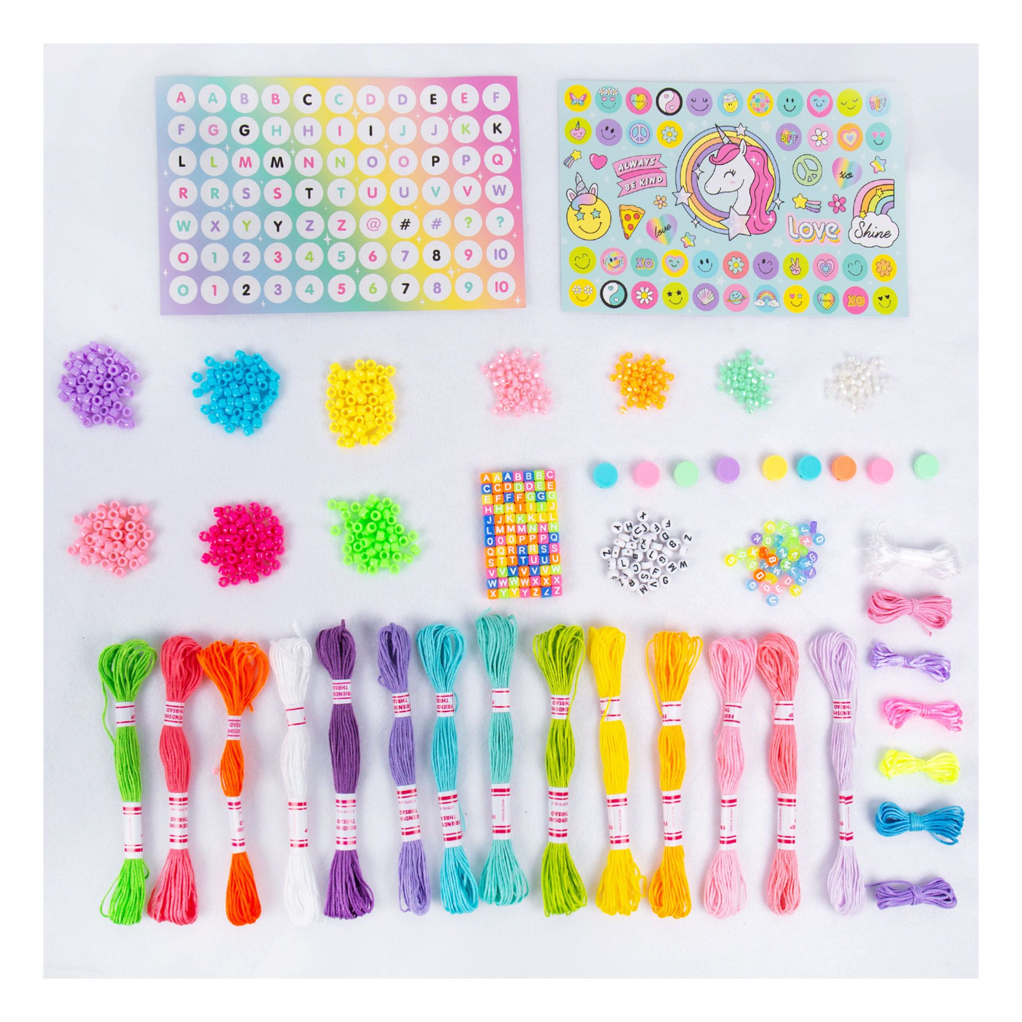 Includes 2565 assorted colorful beads, 318 alphabet beads, ten bundles of elastic, bead sticker sheet, three polyester cording bundles (2 yds. each), 14 friendship thread bundles (8.75 yds. each), three satin cording bundles (1 yd. each), easy-to-follow project guide