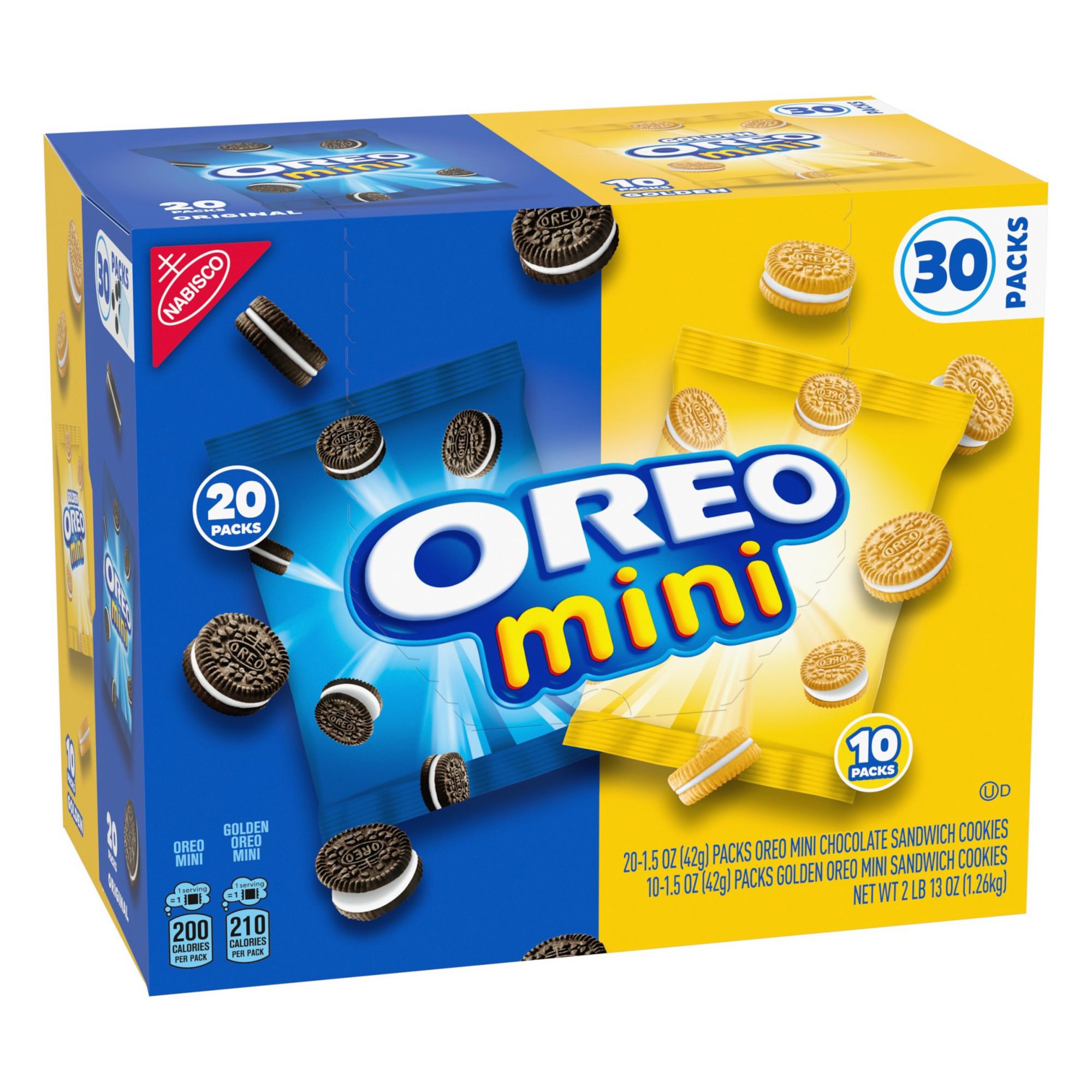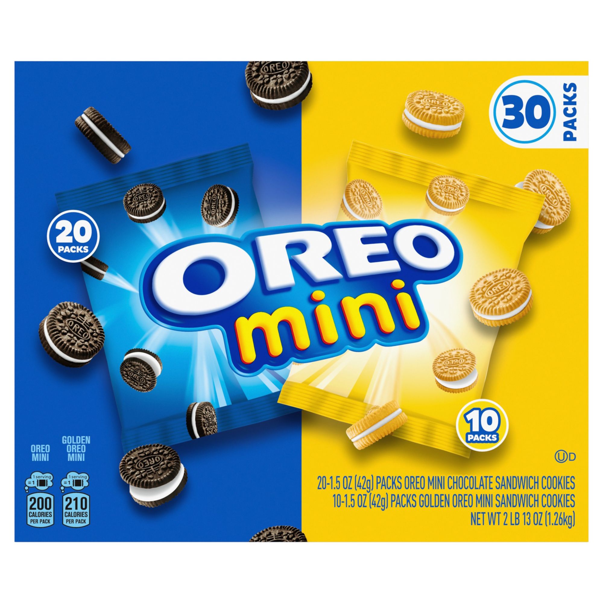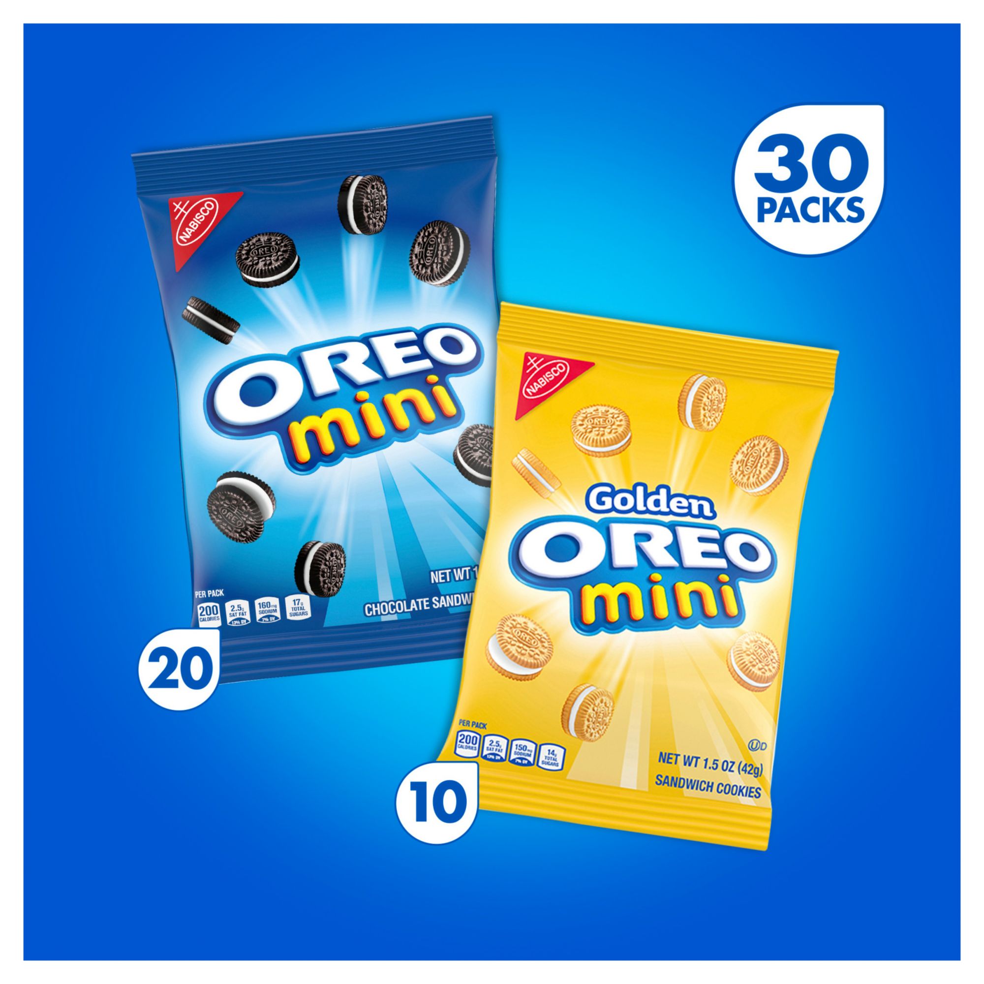 Includes 20 Original Oreo Mini cookies and 10 Golden Oreo Mini cookies snack packs