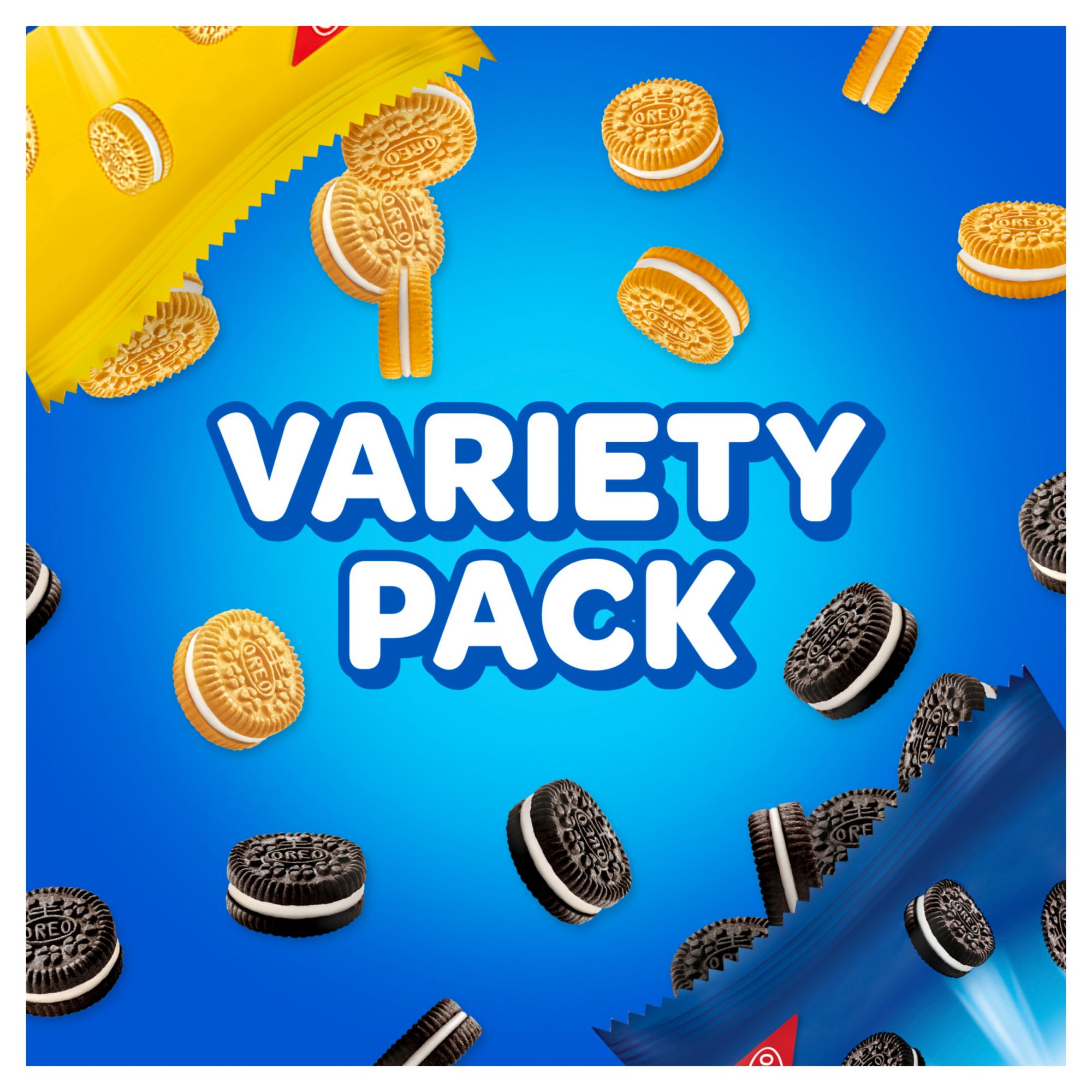 Oreo Mini Mix Variety Pack Cookies are a delicious mix of Original Oreo and Golden Oreo bite sized cookies. These mini cookies are the best of both worlds featuring both chocolate sandwich cookies and golden sandwich cookies, both filled with classic Oreo creme. Reach for a mini version of original Oreo cookies when you want that classic Oreo flavor in bite-sized cookies or go for mini Golden Oreo sandwich cookies when you want a snack with a lighter touch of sweetness. Mini Oreo snack packs of sandwich cookies are great for sharing as party snacks with friends and family or topping your favorite ice cream for an exciting twist on dessert. Mini Oreo snacks are delicious with or without a glass of milk and mini Oreo sandwich cookies make great lunchbox snack cookies to enjoy at school or work. Individually packed, these cookie snack packs are great for on the go lifestyles as cookies for kids and adults who are on the move. With 20 packs of Original Oreo Mini Sandwich Cookies and 10 packs of Golden Oreo Mini Sandwich Cookies (30 total Oreo snack packs), this snack cookies variety pack makes sure your shelf of sweet snacks has an on the go snack for every member of the family to enjoy.