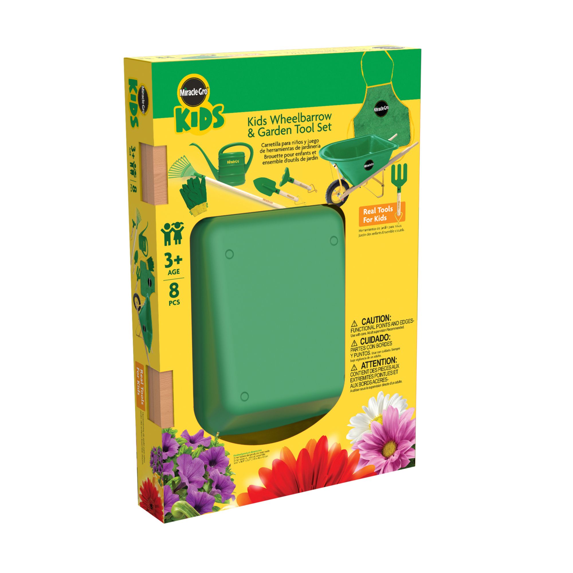 The Miracle-Gro Wheelbarrow and garden toolset is the perfect educational toy for young gardeners. Gardening is a wonderful way to enhance a child's playtime. Our Miracle-Gro Wheelbarrow and gardening set, specially designed for kids and proudly showcasing the brand's iconic colors, offer your child hours of joy while fostering skill development. Featuring handles tailored for small hands, it's both easy and safe to grip. Perfect for introducing youngsters to the joys of gardening or letting them assist with outdoor tasks. With this wheelbarrow, every garden moment becomes a delightful and educational journey.