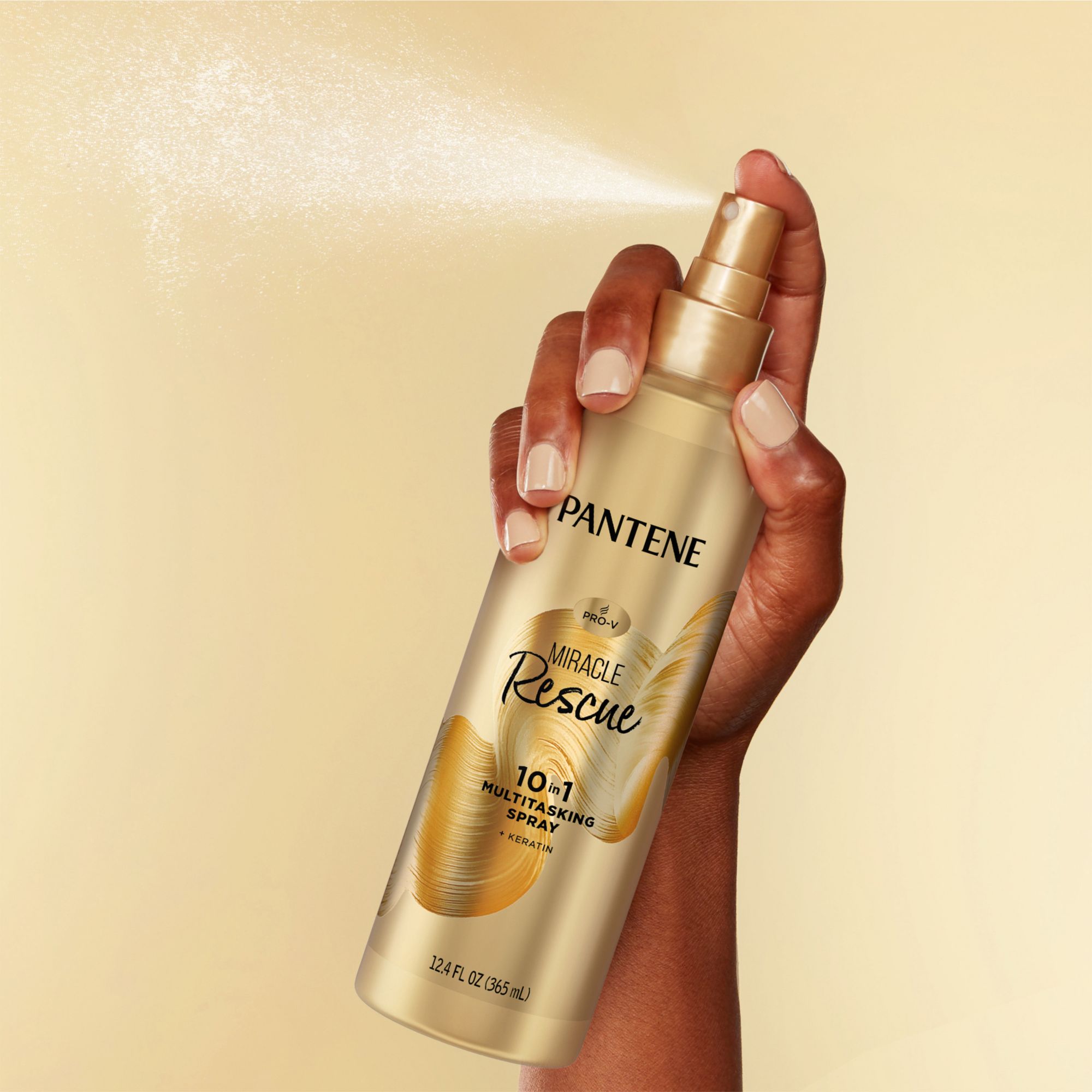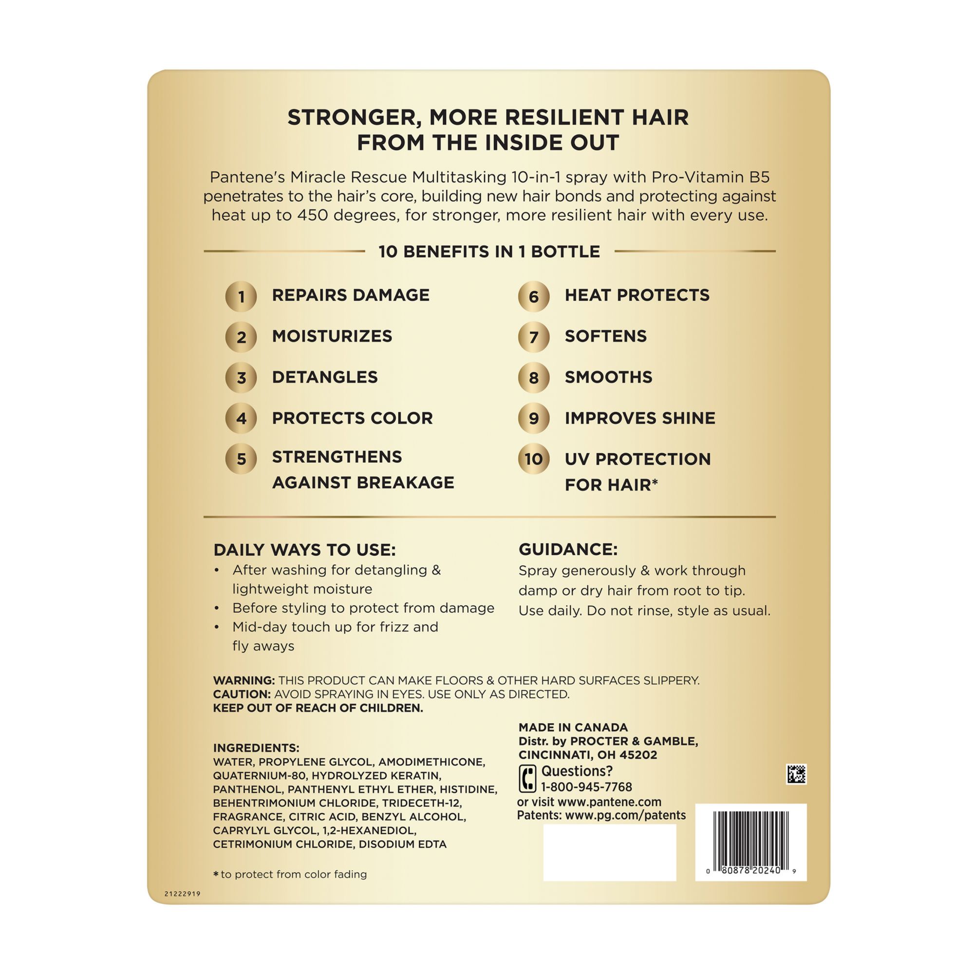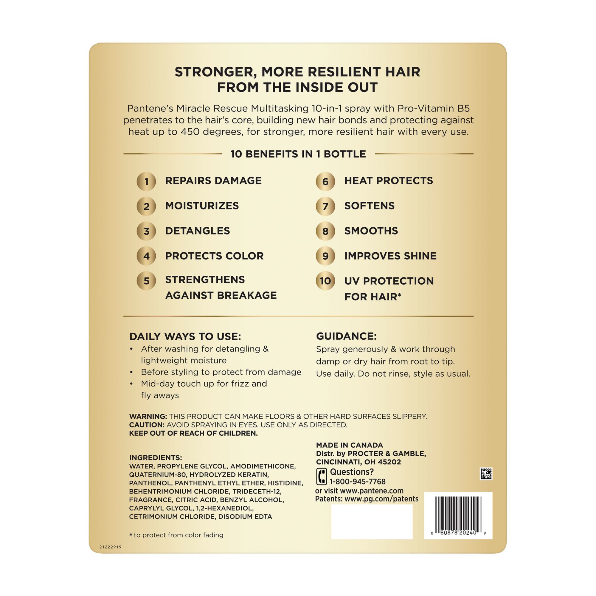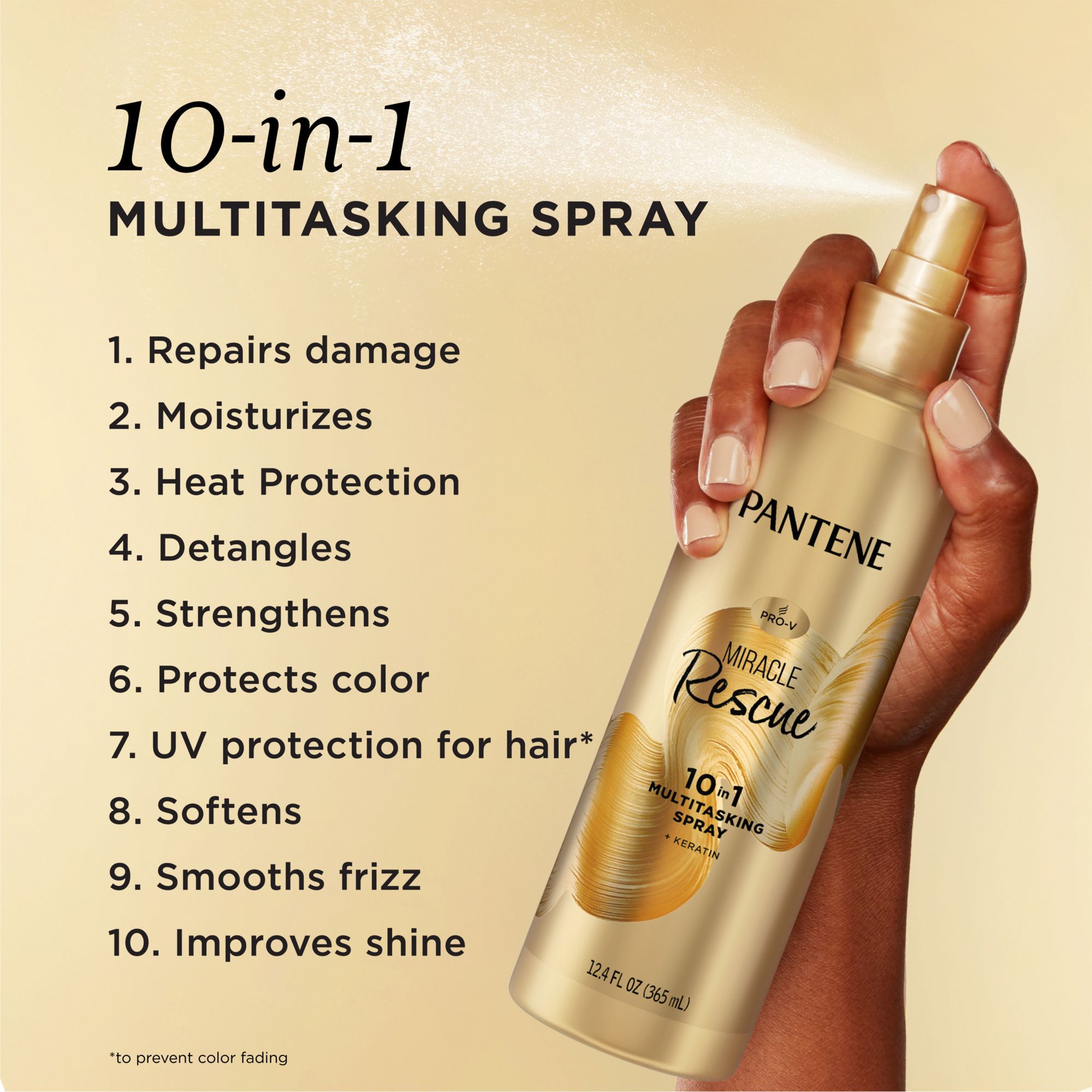 Your daily 10 in 1 multi-tasking spray and keratin treatment. Enriched with Pro-Vitamin B5 and Keratin, the 10 in 1 Multitasking Spray protects hair bonds to improve hair resilience for visible results with no weigh down. This lightweight spray has 10 benefits in 1 bottle! 1. Repairs damage, 2. Moisturizes, 3. 450 degrees Heat protection, 4. Detangles, 5. Strengthens, 6. Protects color, 7. UV protection for hair*, 8. Softens, 9. Smooths frizz, 10. Improves shine. Luxury hair repair without the $60 price tag. Directions: Spray generously and work through damp or dry hair from root to tip. Use daily. Do not rinse. Style as usual. Pro-V Tip: You can use the 10 In 1 Multi-Tasking Spray + Keratin as a treatment on damp or dry hair or use as a styler to protect from heat. For best results, pair with Pantene Miracle Rescue Deep Conditioner. Create more great days. Which is why Pantene is committed to making the best possible hair care-safe and effective-in the best possible way. Since 1945, when Swiss doctors first discovered the nurturing, hair-boosting benefits of Pantene's Pro-Vitamin B5, they've made healthy hair a reality for hundreds of millions of people around the globe. *To Protect From Color Fading.