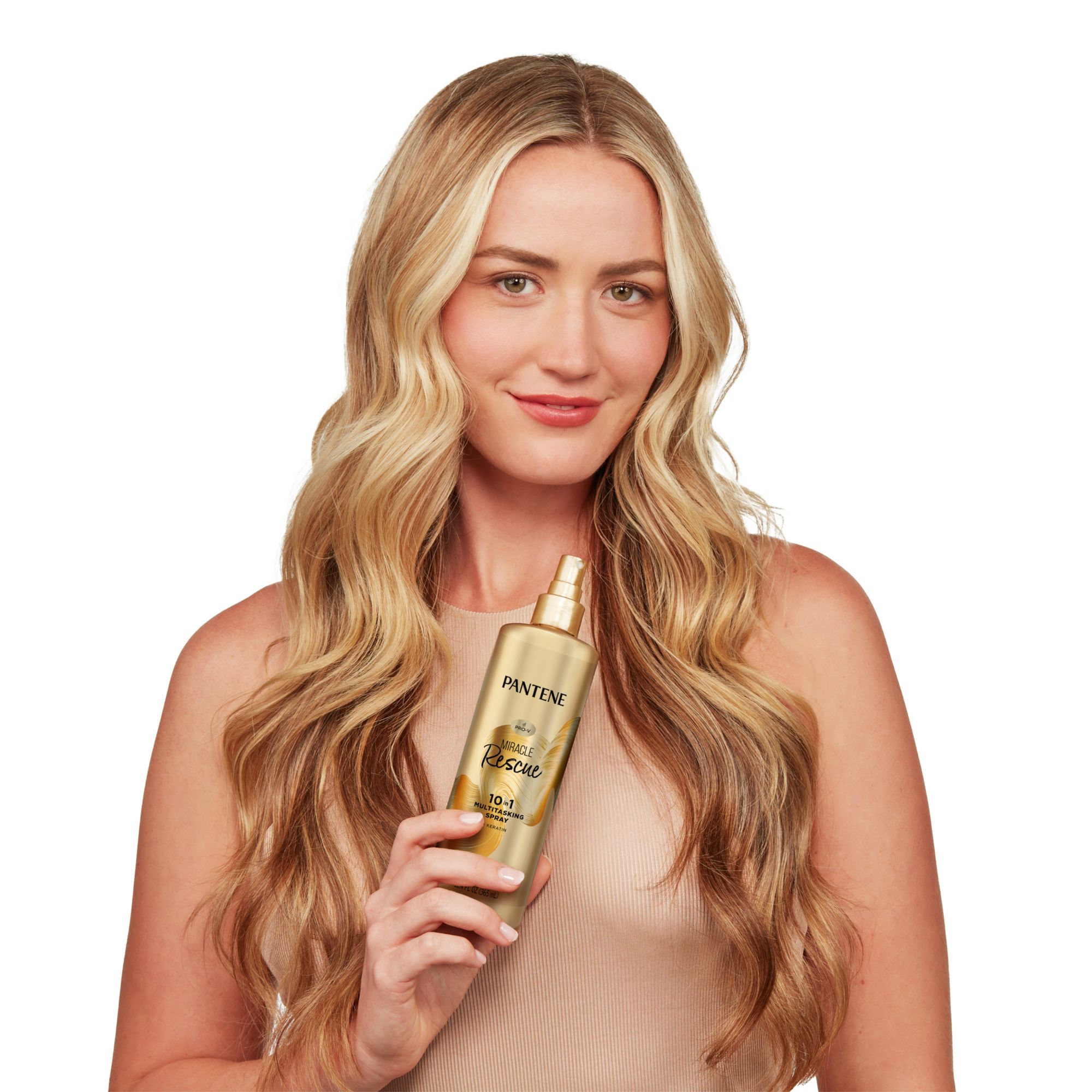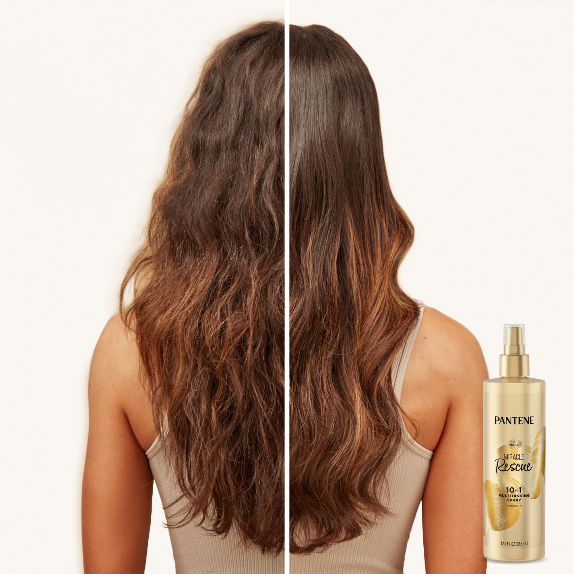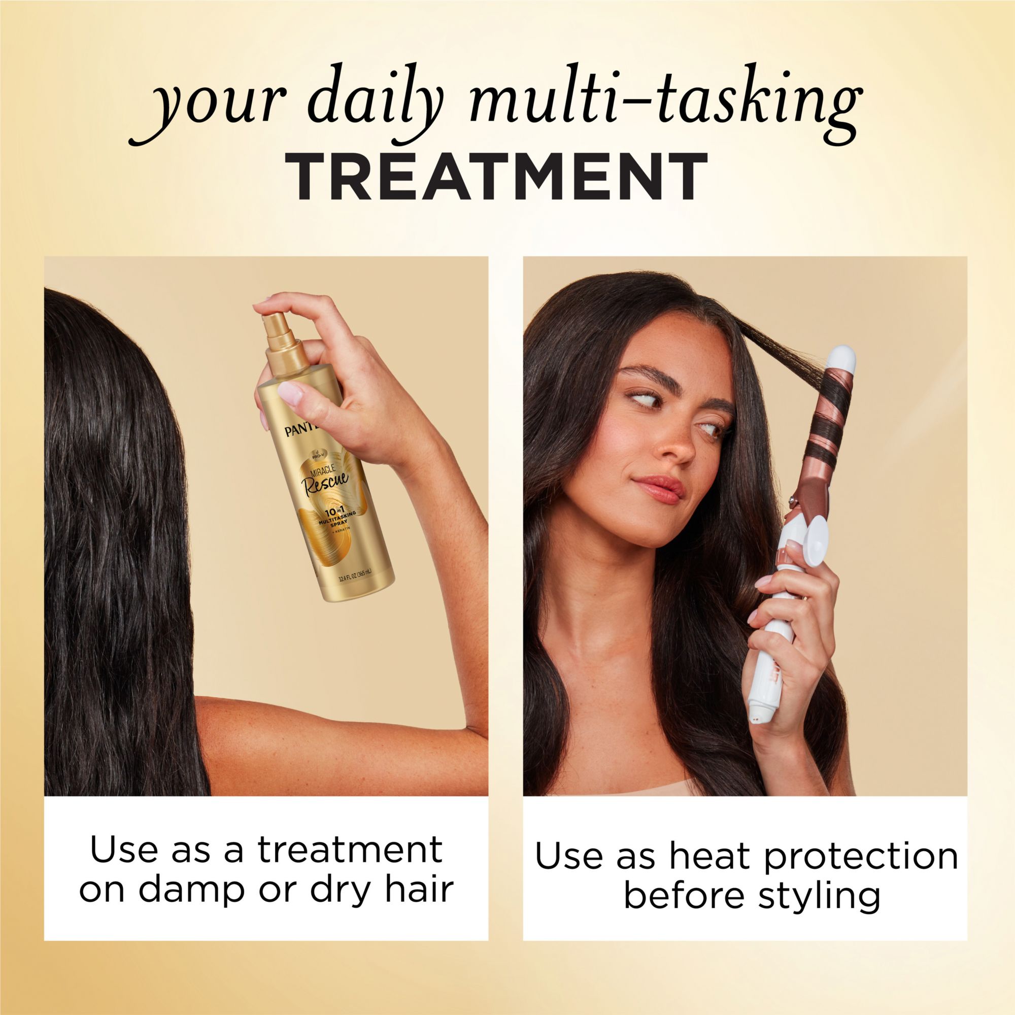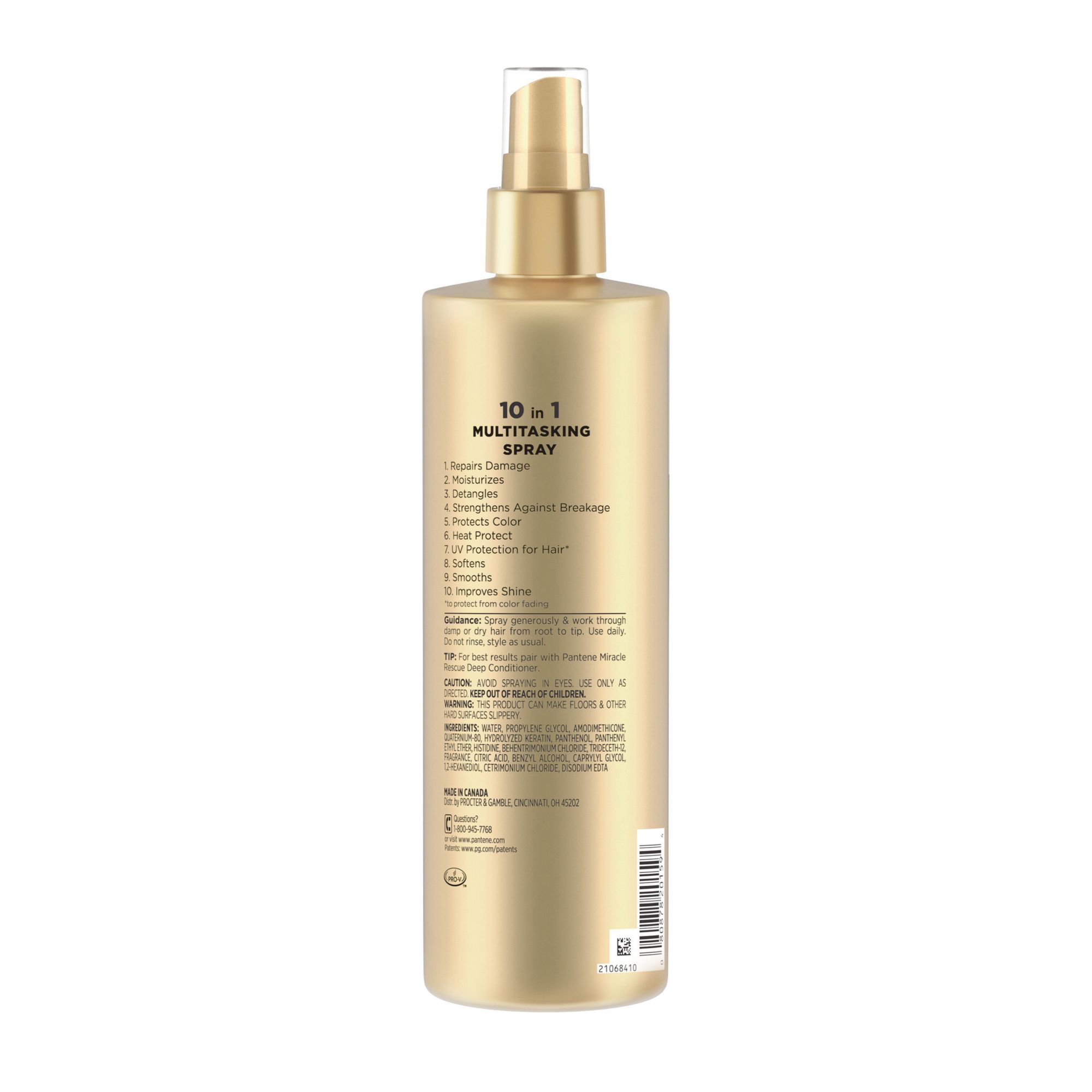 Your daily 10 in 1 multi-tasking spray and keratin treatment. Enriched with Pro-Vitamin B5 and Keratin, the 10 in 1 Multitasking Spray protects hair bonds to improve hair resilience for visible results with no weigh down. This lightweight spray has 10 benefits in 1 bottle! 1. Repairs damage, 2. Moisturizes, 3. 450 degrees Heat protection, 4. Detangles, 5. Strengthens, 6. Protects color, 7. UV protection for hair*, 8. Softens, 9. Smooths frizz, 10. Improves shine. Luxury hair repair without the $60 price tag. Directions: Spray generously and work through damp or dry hair from root to tip. Use daily. Do not rinse. Style as usual. Pro-V Tip: You can use the 10 In 1 Multi-Tasking Spray + Keratin as a treatment on damp or dry hair or use as a styler to protect from heat. For best results, pair with Pantene Miracle Rescue Deep Conditioner. Create more great days. Which is why Pantene is committed to making the best possible hair care-safe and effective-in the best possible way. Since 1945, when Swiss doctors first discovered the nurturing, hair-boosting benefits of Pantene's Pro-Vitamin B5, they've made healthy hair a reality for hundreds of millions of people around the globe. *To Protect From Color Fading.