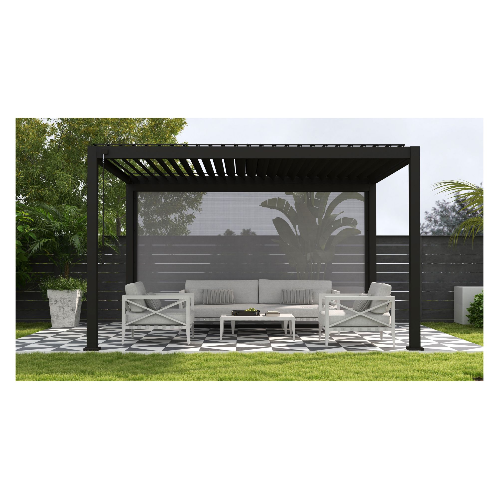 The Mirador 100% aluminum louvered pergola system is the ultimate extension of your living space outdoors. The patented adjustable louvered pergola design allows you to utilize your outdoor space whether the sun is shinning or its raining. You control the amount of sunlight you want with our premium ergonomically designed louver wand. If precipitation starts to fall, you do not have to retreat indoors. Simply close the louver roof and let the integrated guttering system protect you from the elements. Whether you are covering a seating area, hot tub, or even your favorite BBQ grill, Mirador is the perfect choice. Invite your neighbors, family, and friends over for a day of relaxation under your new pergola. The innovative design and engineered elements received the prestigious 2020 Red Dot award. There are no visible fasteners to distract from its sleek appearance. Step-by-step assembly and installation instructions are easy to understand and helpful videos are available as well. Includes one privacy screen with purchase.