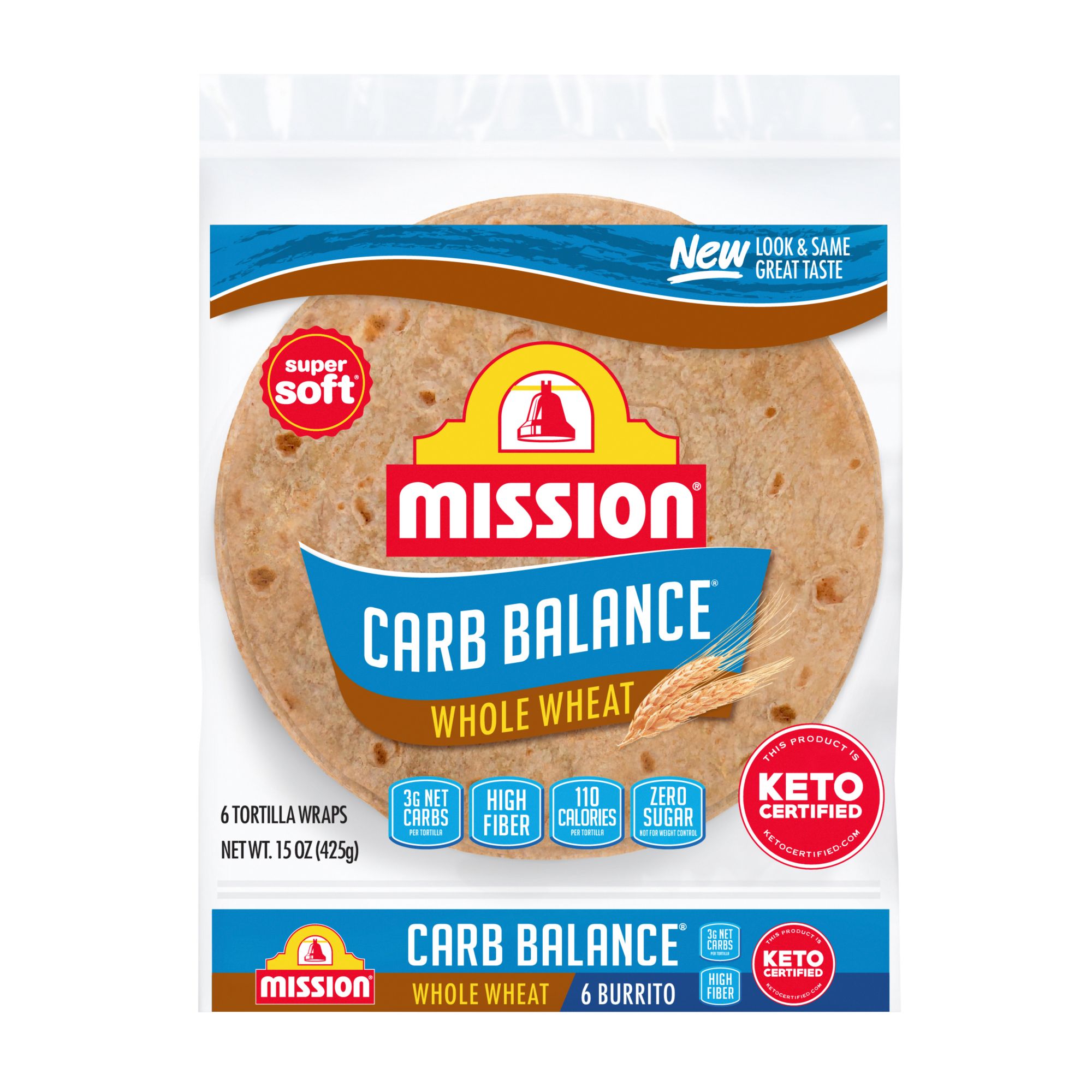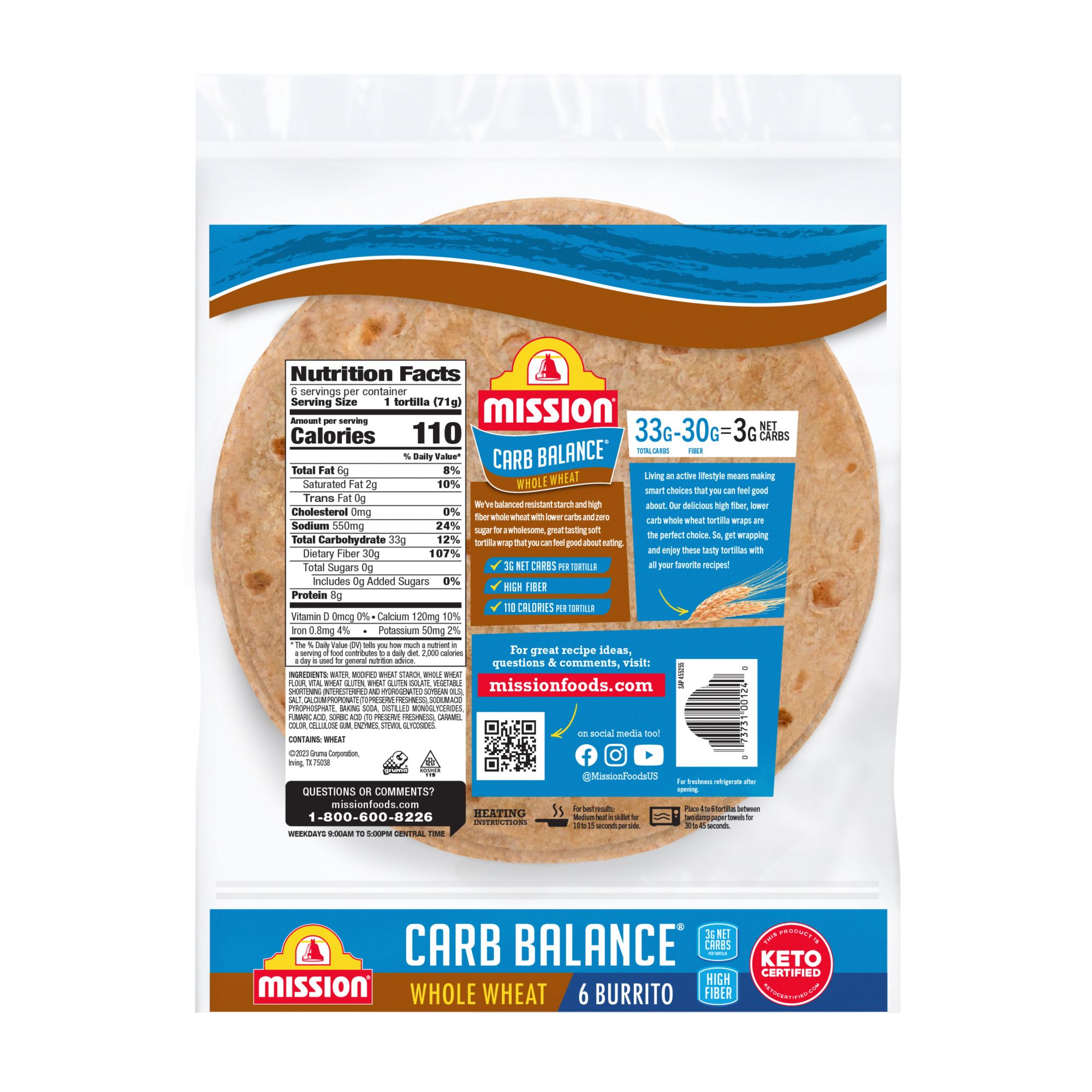 Mission Carb Balance Whole Wheat tortillas wraps are Super Soft. Cutting carbs doesn't mean cutting back on great taste. Especially with Mission Carb Balance Whole Wheat tortilla wraps. Packed full of authentic Mission flavor and the highest quality ingredients. These Mission Carb Balance Whole Wheat super soft tortilla wraps will add a tasty twist to all your recipes. Mission Carb Balance Whole Wheat tortilla wraps are burrito size and each package contains six wraps per package. Each Mission Carb Balance Whole Wheat tortilla wrap has only 3g Net carbs per servicing. They have high fiber, zero added sugar and are Keto-certified. Mission Carb Balance tortillas have just 110 calories per tortilla wrap and Mission Carb Balance Whole Wheat tortilla wrap are part of a Keto-friendly diet and have zero cholesterol. Enjoy Mission Carb Balance Whole Wheat tortilla wraps at any meal, breakfast, lunch dinner or just a snack and let’s get wrapping and enjoy.