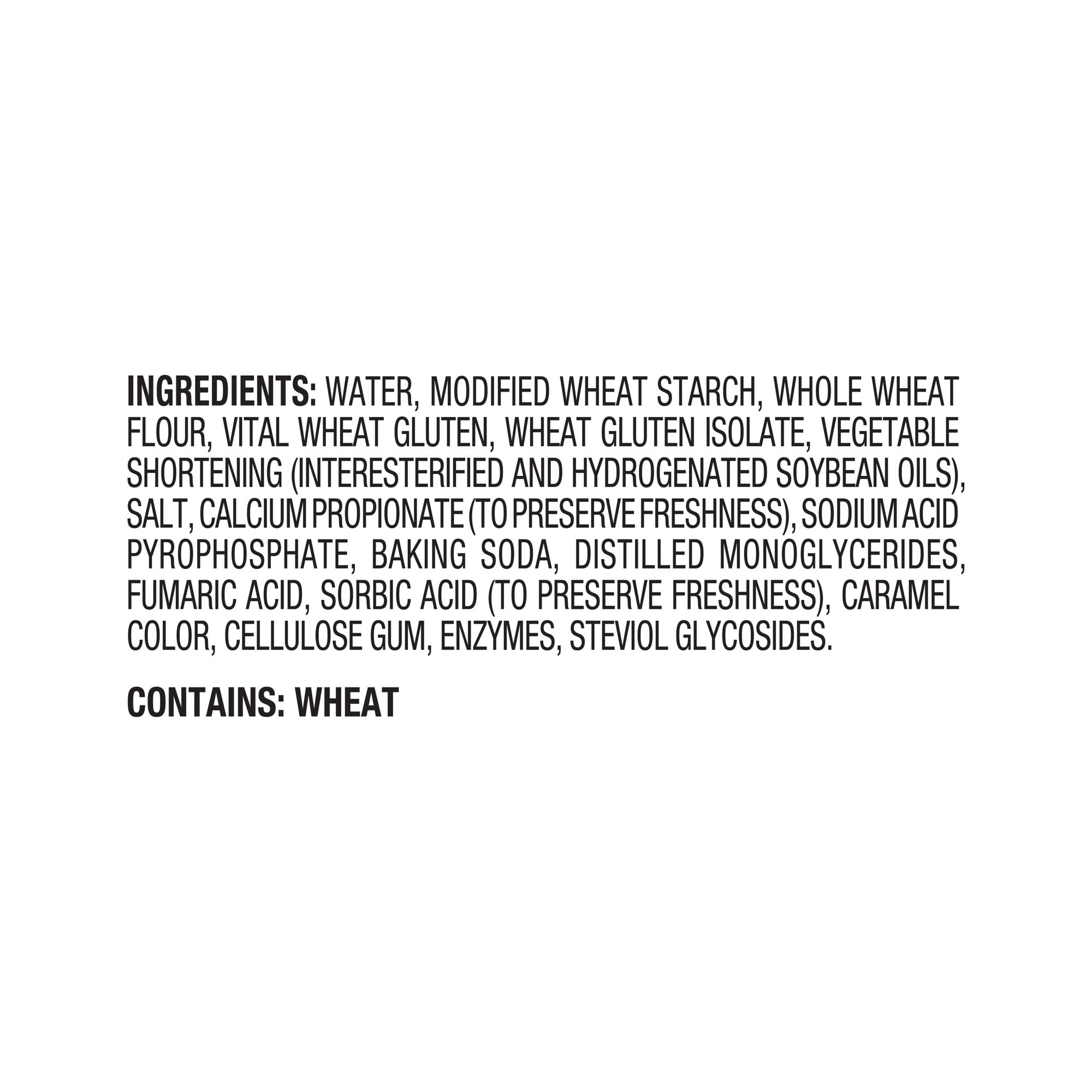 Ingredients Water, Modified Wheat Starch, Whole Wheat Flour, Vital Wheat Gluten, Wheat Gluten Isolate, Vegetable Shortening (Interestified And Hydrogentated Soybean Oils), Salt, Calcium Propionate (To Preserve Freshness), Sodium Acod Pyrophosphate, Baking Soda, Distrilled Monoglycerides, Fuamric Acid, Sorbic Acid (To Preserve Freshness), Caramel Color, Cellulose Gum, Enzymes, Steviol Glycosides. Contains: Wheat.
