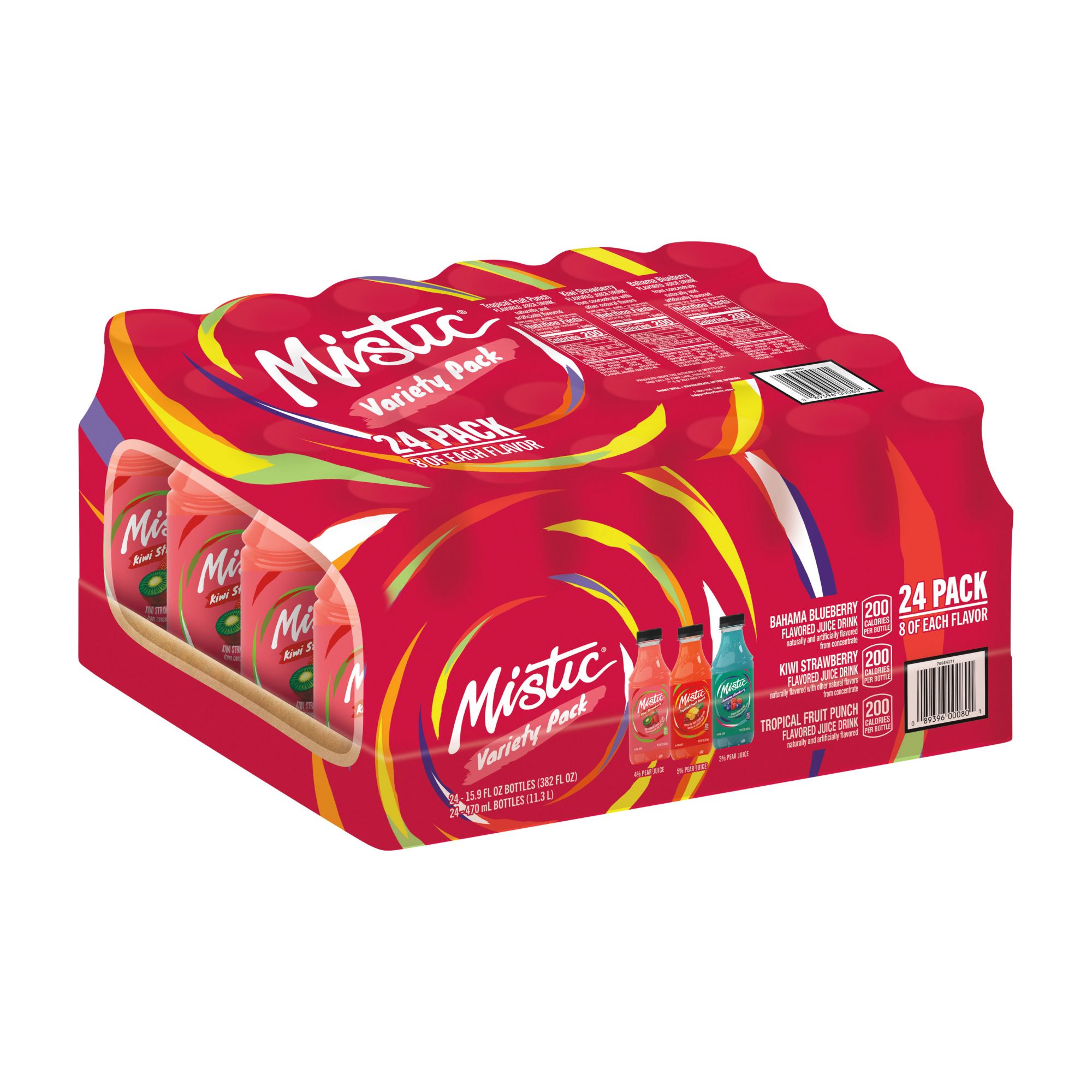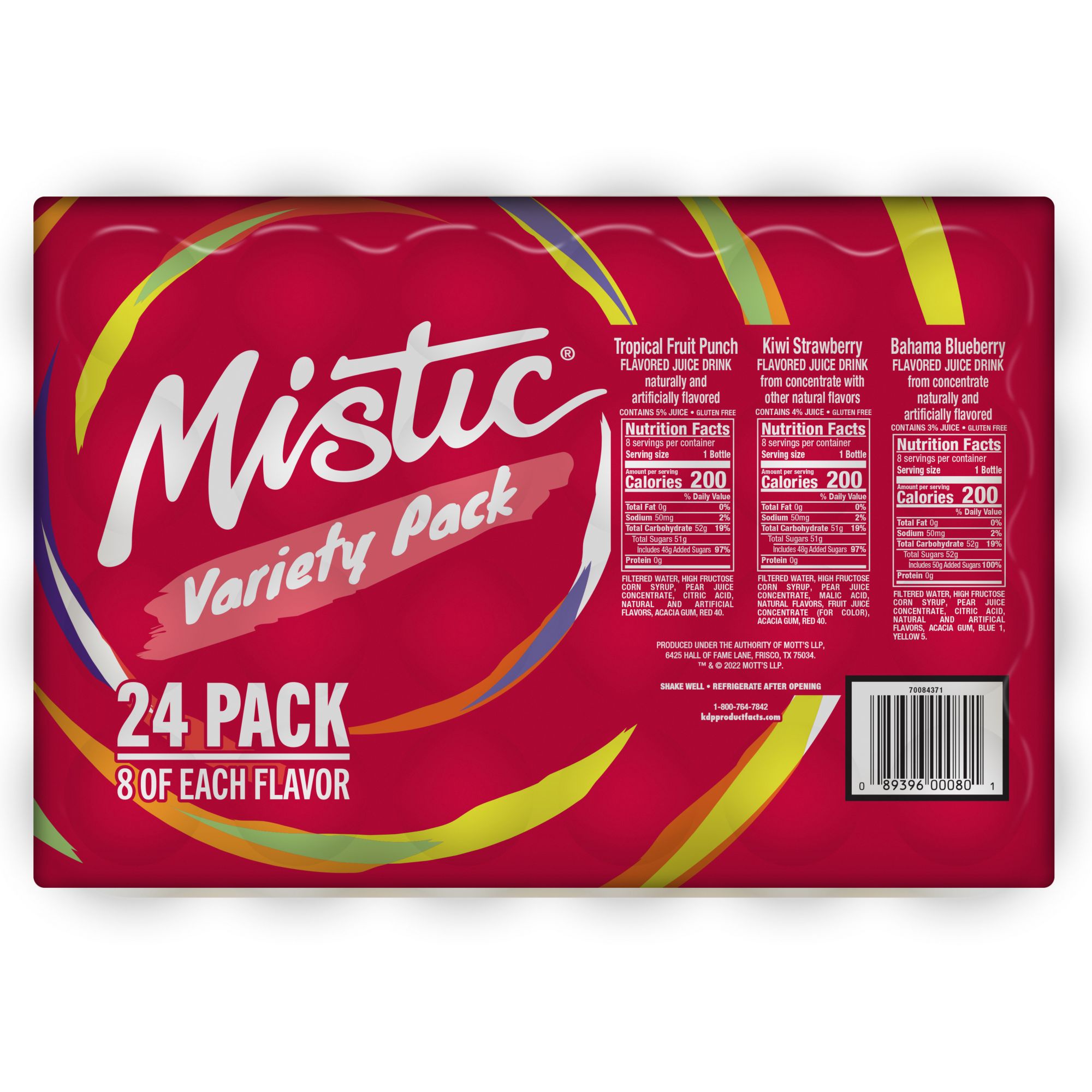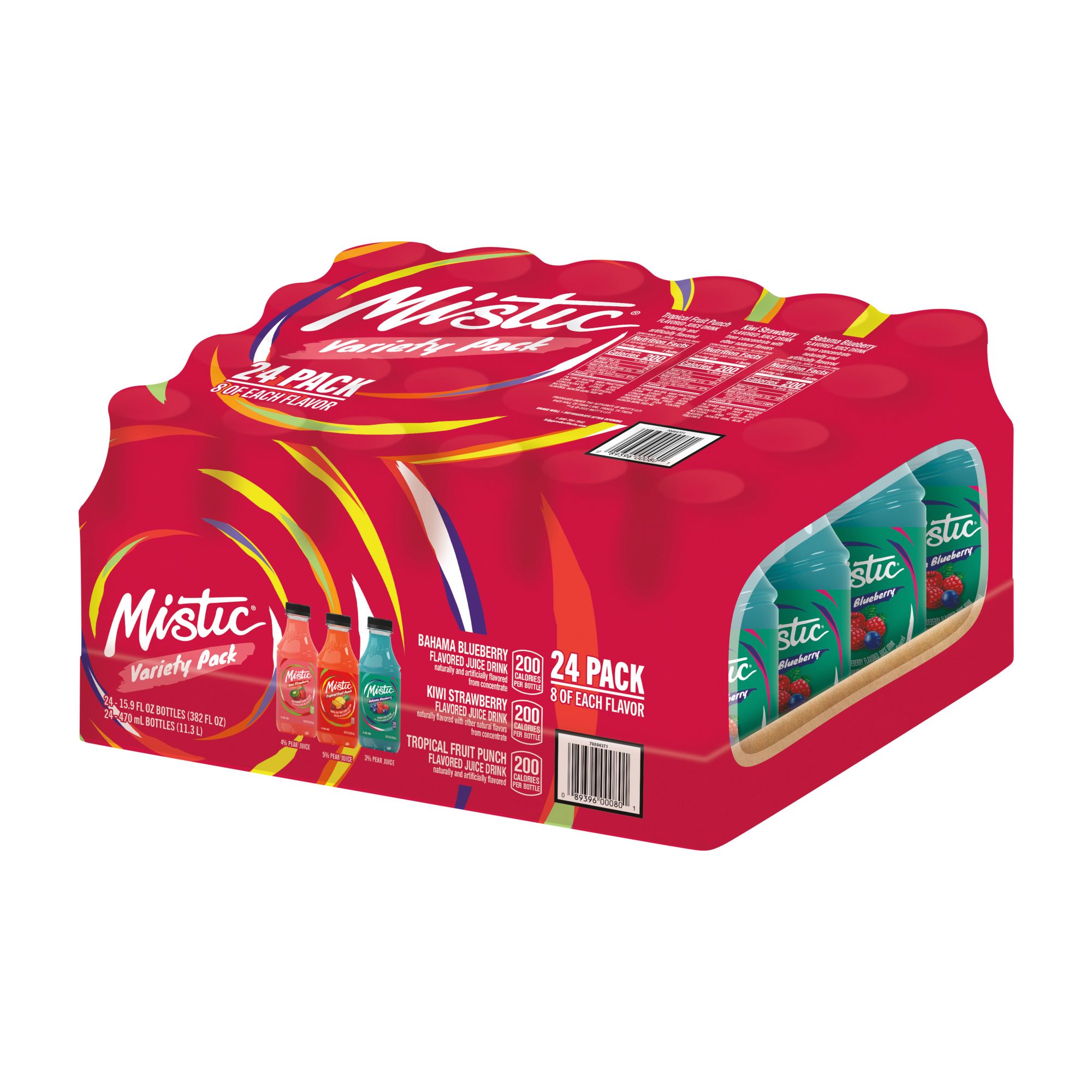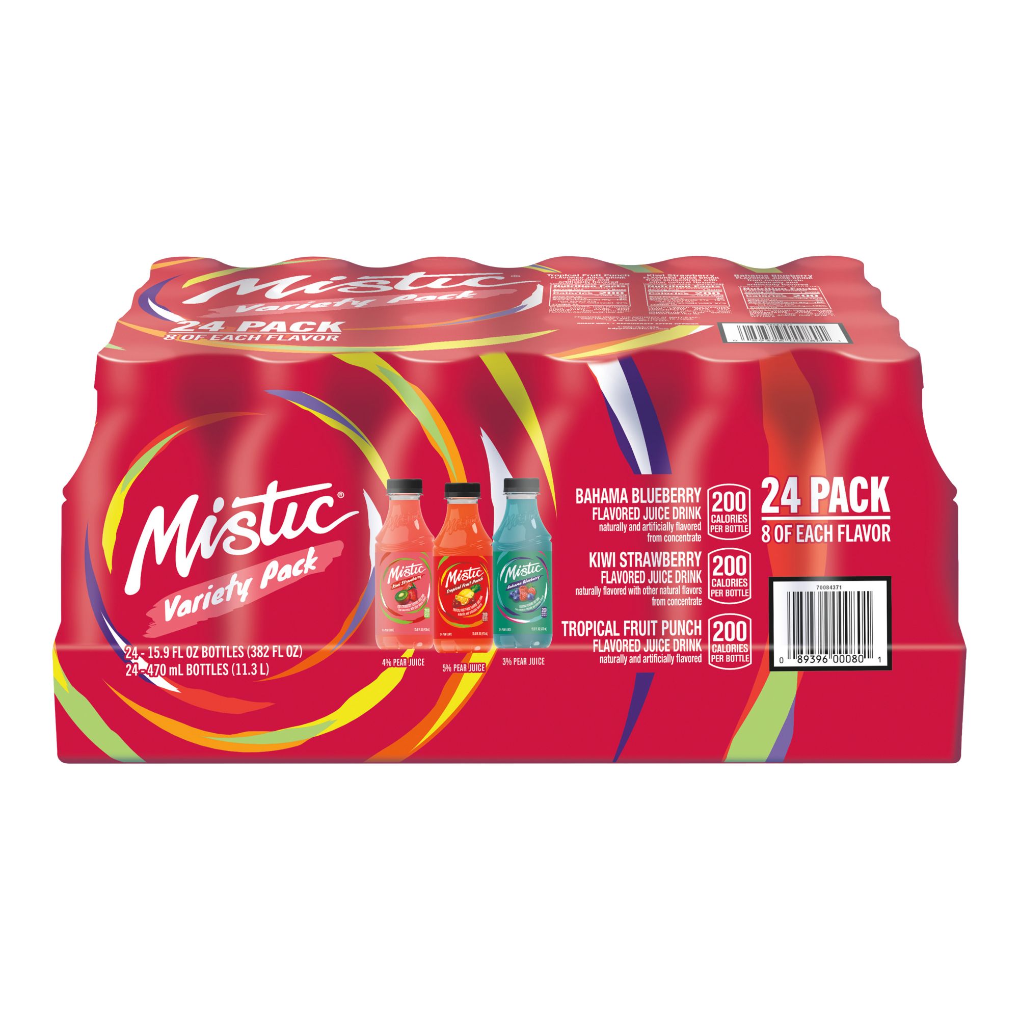Get swept up in a storm of mouth-watering, bold fruit flavors with the Mistic Tropical Drink Variety Pack. Mistic is packed with the delicious taste of premium fruit juices and delivers unique combinations of fun and refreshment. Grab a bottle and make every day Mistic! This variety pack contains twenty four total bottles, including eight bottles of Tropical Fruit Punch, eight bottles of Bahama Blueberry, and eight bottles of Kiwi Strawberry.