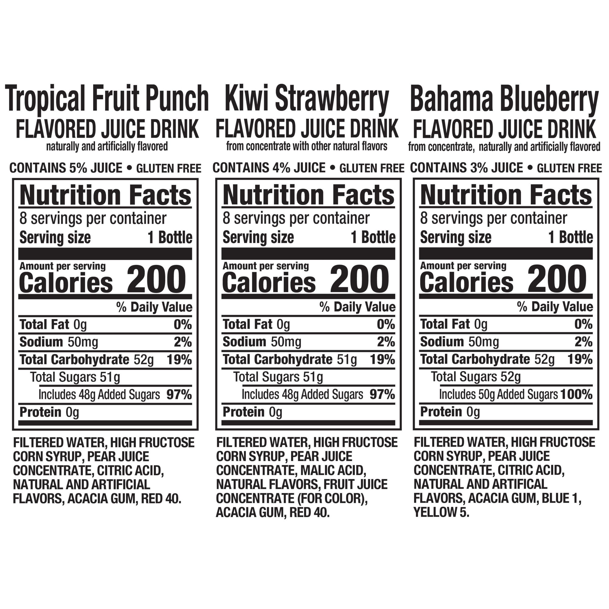 Ingredients: Tropical Fruit Punch Flavored Juice Drink Ingredients: Filtered Water, High Fructose Corn Syrup, Pear Juice Concentrate, Citric Acid, Natural And Artificial Flavors, Acacia Gum, Red 40. Kiwi Strawberry Flavored Juice Drink Ingredients: Filtered Water, High Fructose Corn Syrup, Pear Juice Concentrate, Malic Acid, Natural Flavors, Fruit Juice Concentrate (For Color), Acacia Gum, Red 40. Bahama Blueberry Flavored Juice Drink Ingredients: Filtered Water, High Fructose Corn Syrup, Pear Juice Concentrate, Citric Acid, Natural And Artifical Flavors, Acacia Gum, Blue 1, Yellow 5.