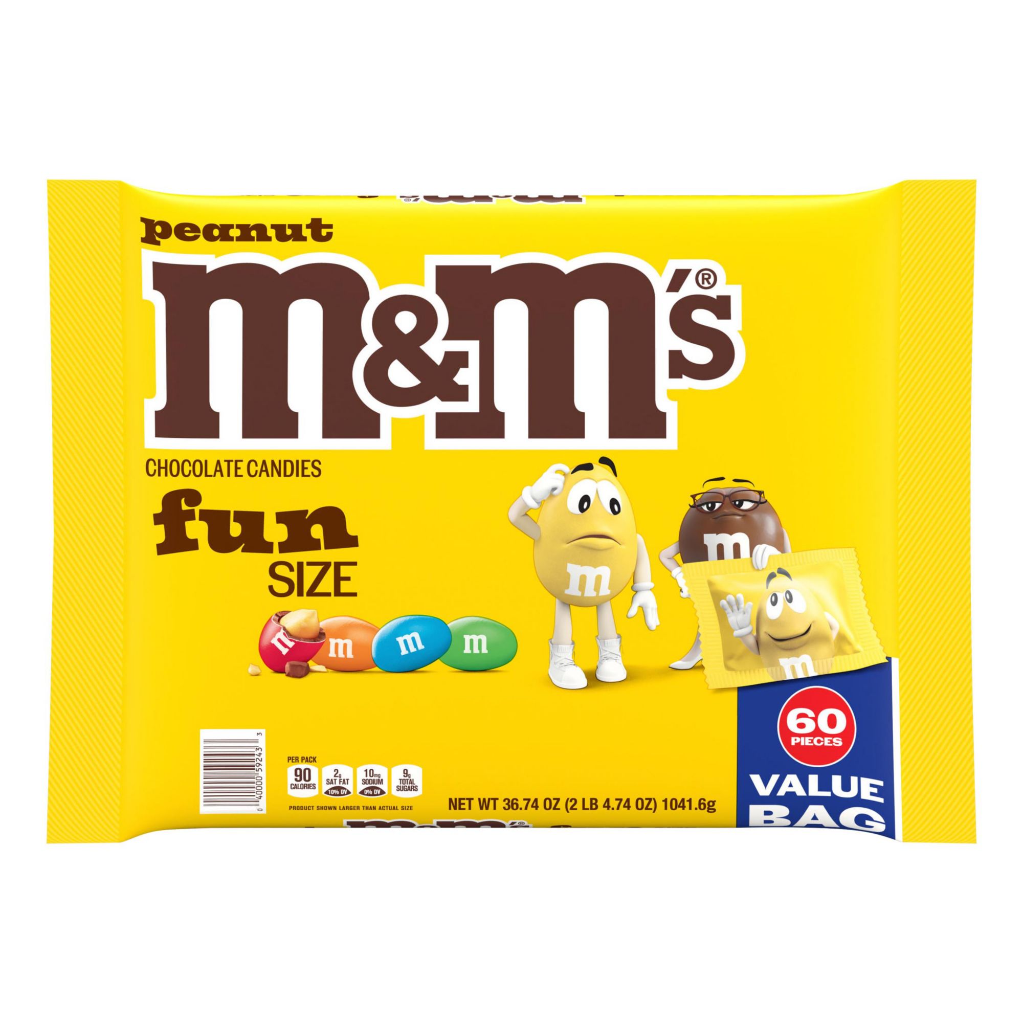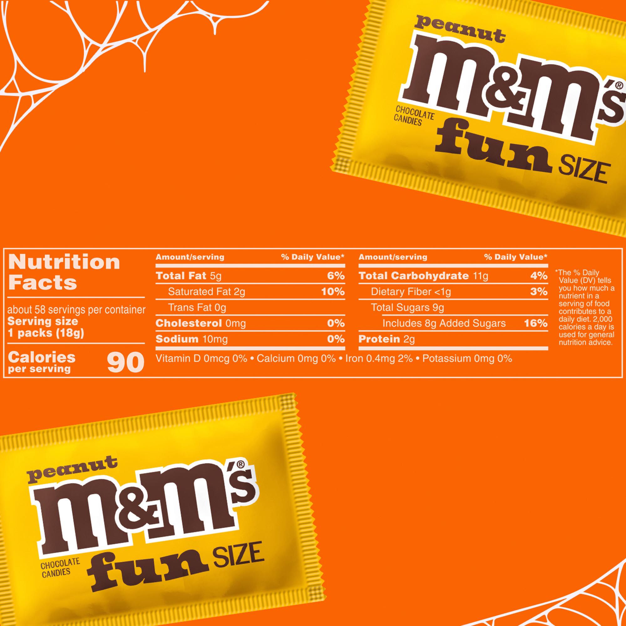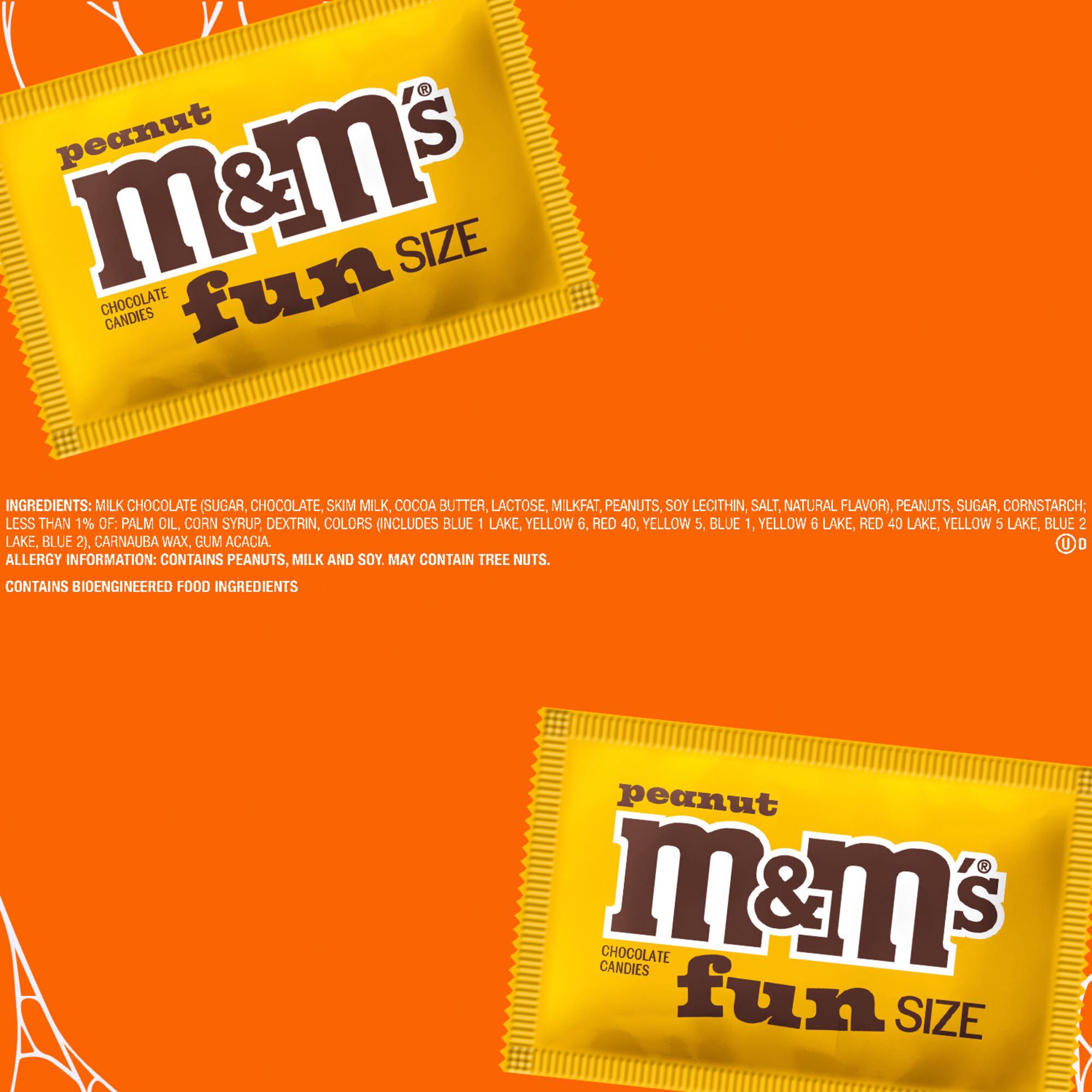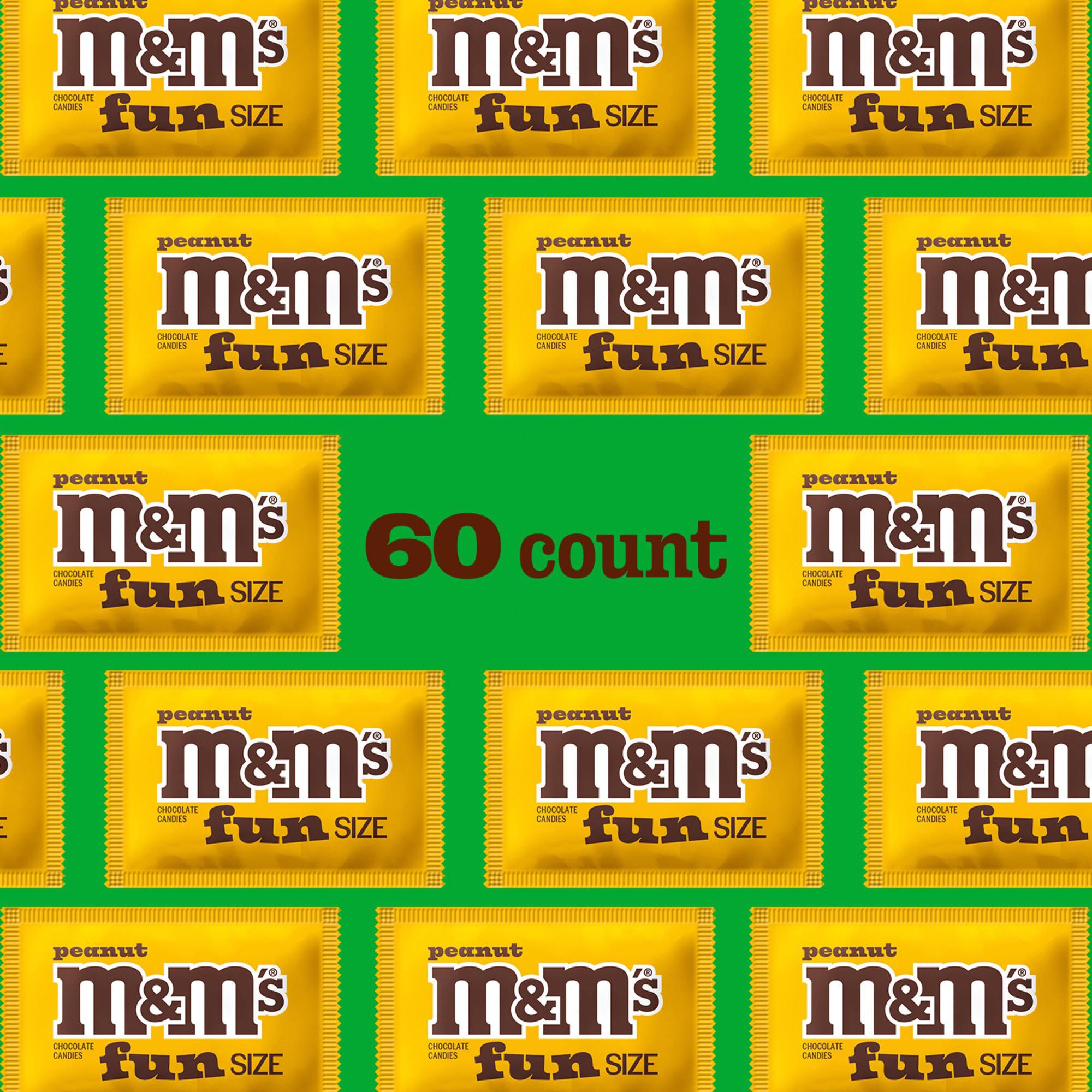 Contains one (1) 36.74 ounce, 60-count bulk bag of M&M'S Fun Size Peanut Milk Chocolate Halloween Candy