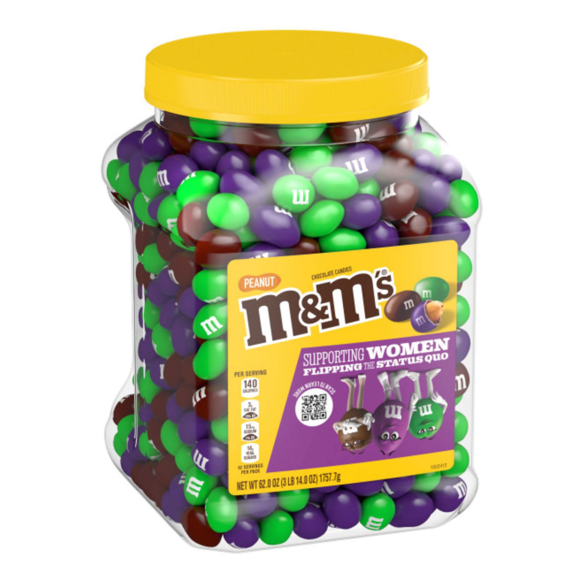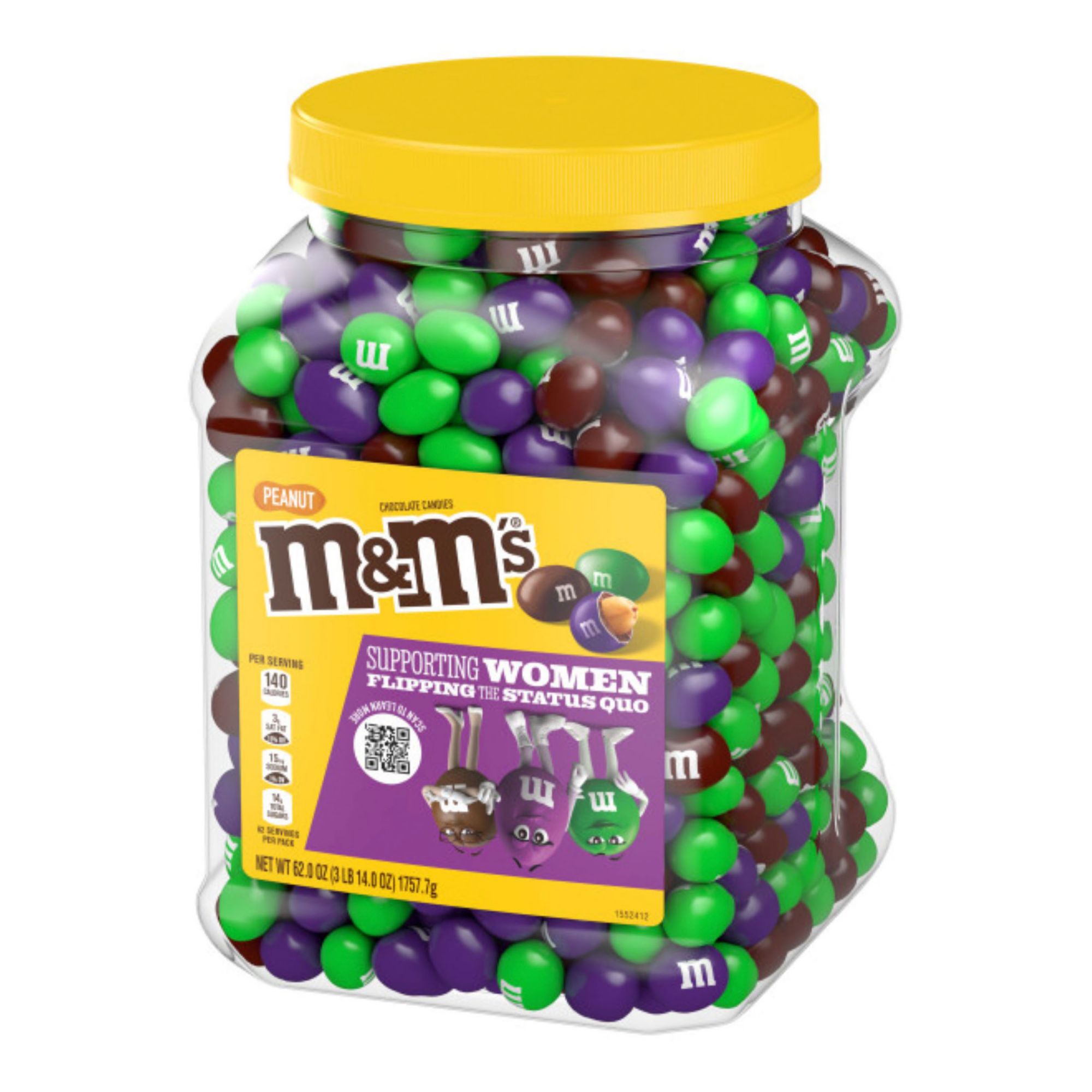 Flipping the packs of M&M's Peanut and Milk Chocolate candy in support of women who are ‘Flipping the Status Quo” and reshaping success Enjoy real milk chocolate and roasted peanut candy covered in a limited edition assortment of brown, green, and purple candy shells in honor of M&M’s female characters M&M's Peanut & Milk Chocolates are perfect to fill candy dishes, party favor, or gift basket For every bulk chocolate candy jar of M&M'S Peanut & Milk Chocolate candy sold, $1 will be donated towards supporting female creators to keep flipping the status quo Includes One 3.87 lbs. resealable bulk candy jar of M&M's Flipping the Status Quo Peanut Milk Chocolate Candy