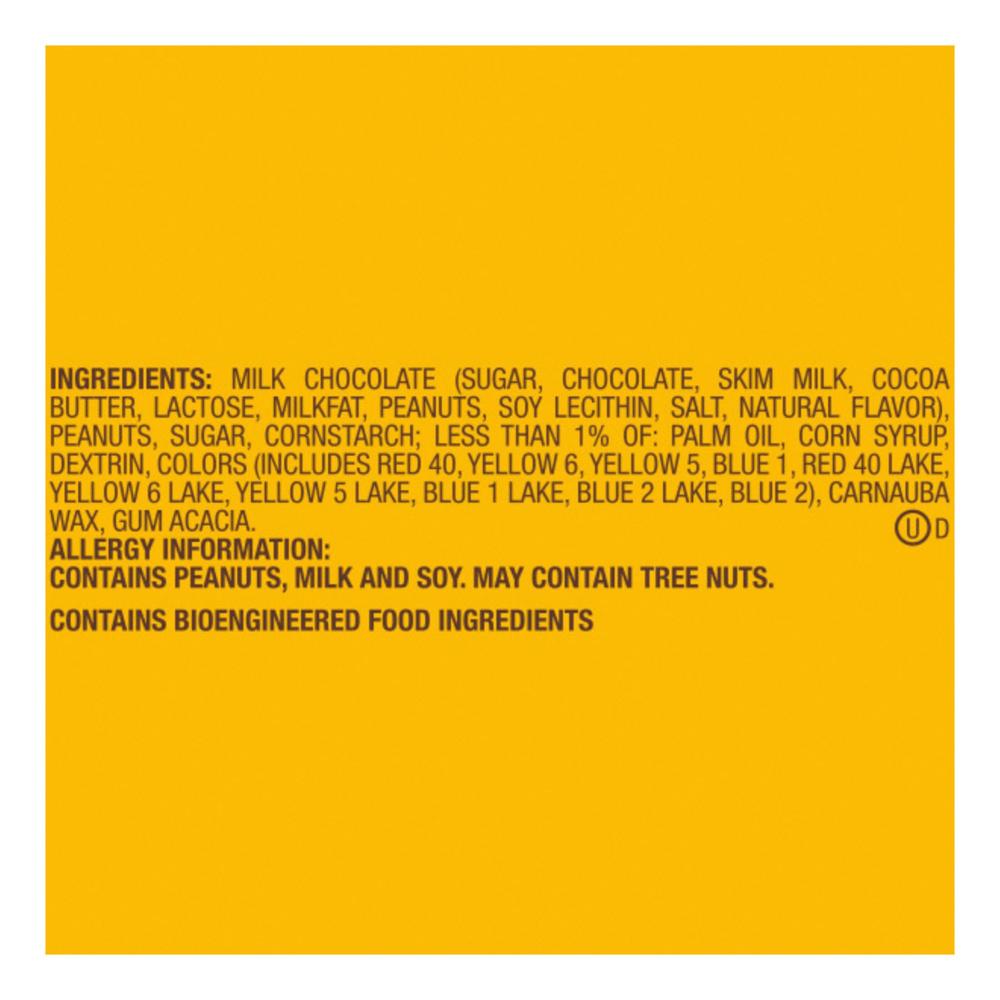 Milk Chocolate, Peanuts, Sugar, Cornstarch; Less Than 1% Of: Palm Oil, Corn Syrup, Dextrin, Colors (Includes Red 40, Yellow 6, Yellow 5, Blue 1, Red 40 Lake, Yellow 6 Lake, Yellow 5 Lake, Blue 1 Lake, Blue 2 Lake, Blue 2), Carnauba Wax, Gum Acacia.