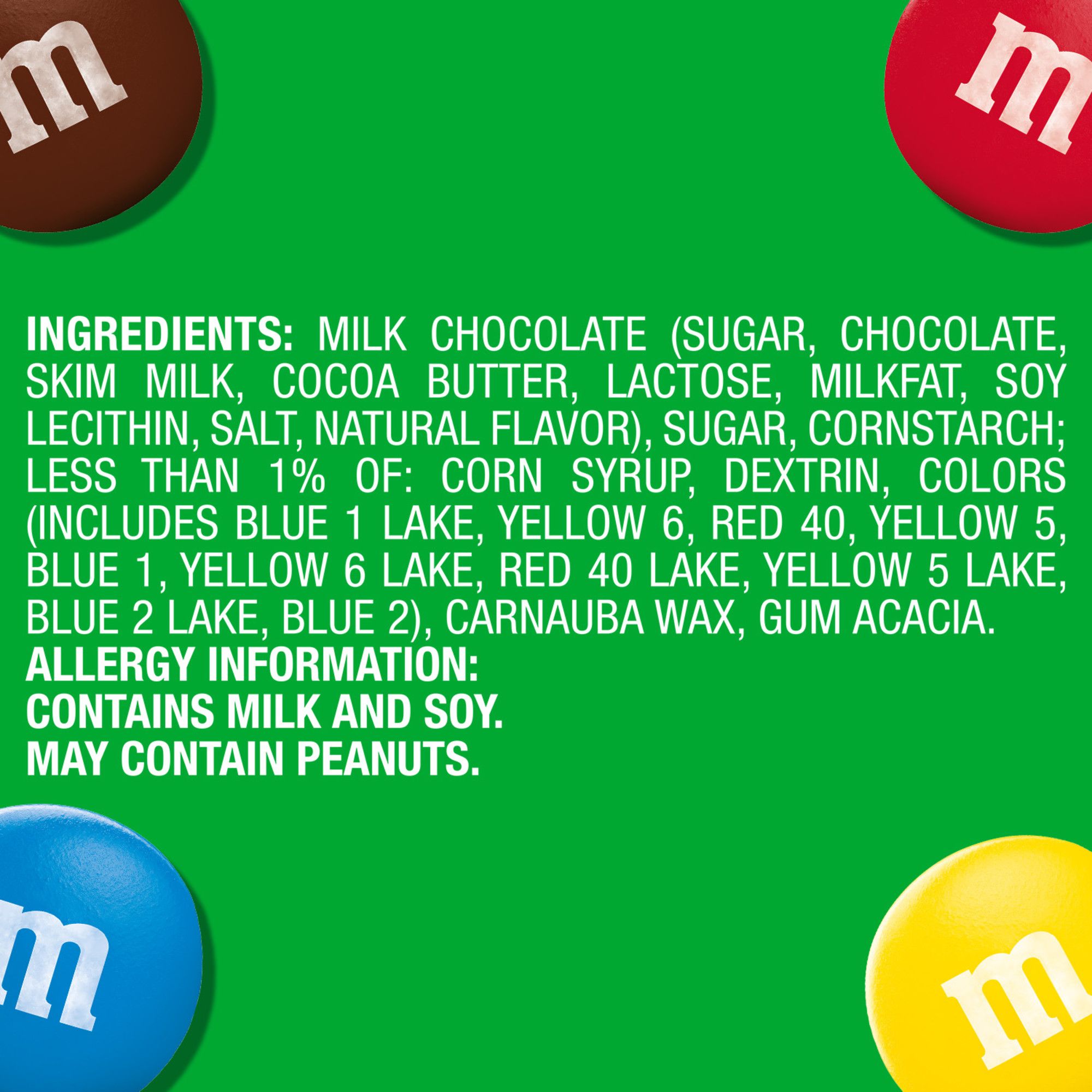 Ingredients: Milk Chocolate (Sugar, Chocolate, Skim Milk, Cocoa Butter, Lactose, Milkfat, Soy Lecithin, Salt, Artificial Flavors), Sugar, Cornstarch, Less than 1% - Corn Syrup, Dextrin, Coloring (Includes Blue 1 Lake, Red 40 Lake, Yellow 6, Yellow 5, Red 40, Blue 1, Blue 2 Lake, Yellow 6 Lake, Yellow 5 Lake, Blue 2), Gum Acacia.