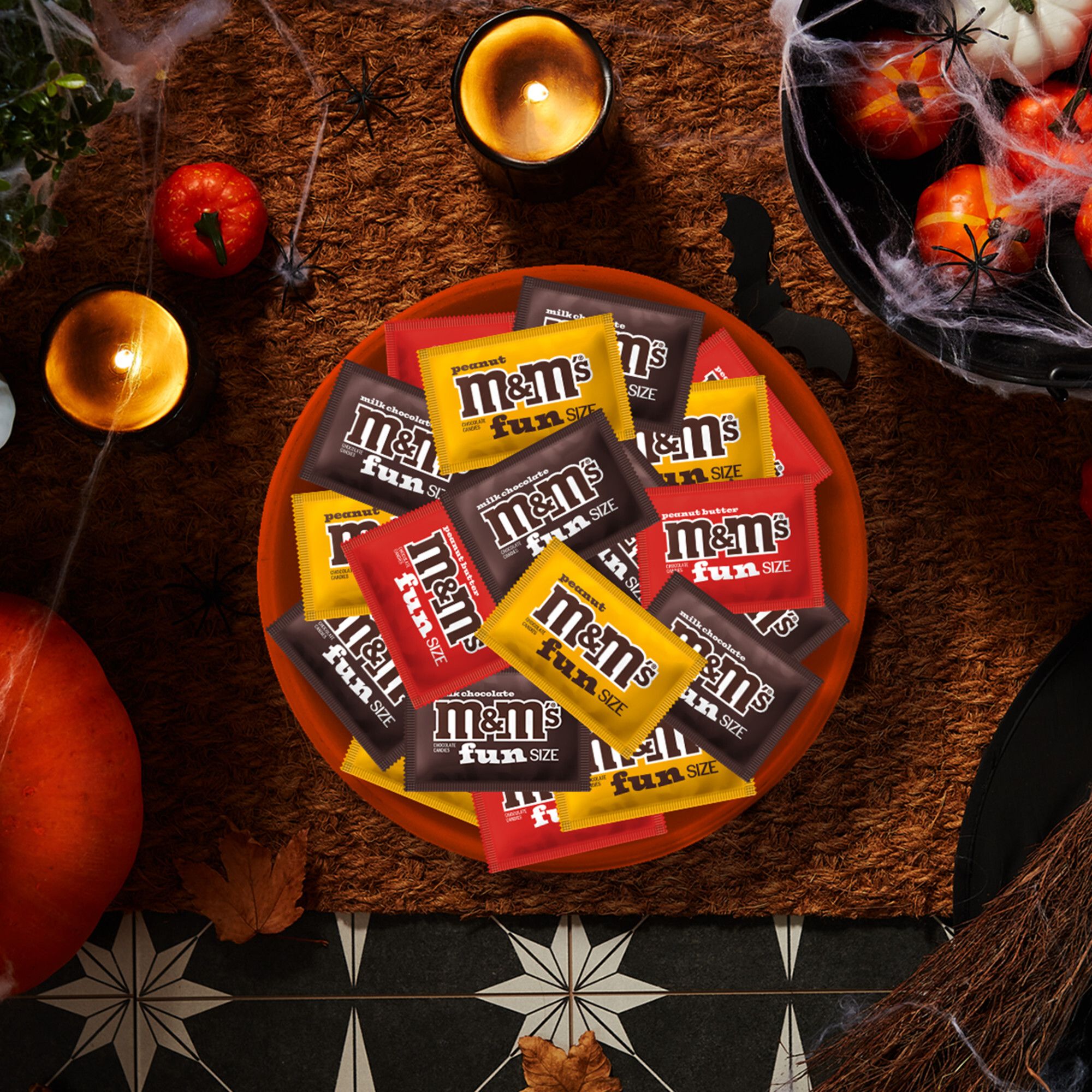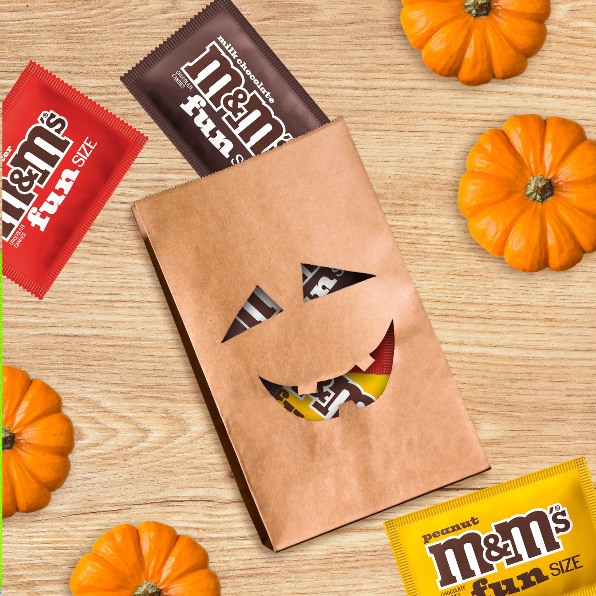 This Halloween bulk candy bag features individually wrapped fun size assorted M&M'S Milk Chocolate, Peanut, and Peanut Butter Chocolate Candy