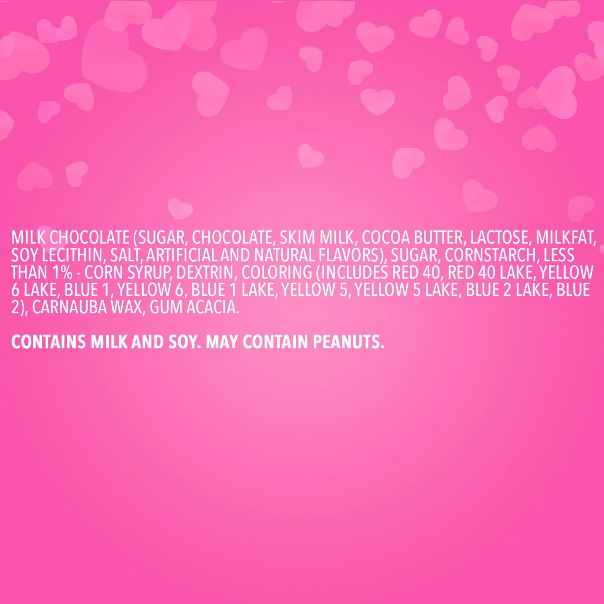 Ingredients: Milk Chocolate (Sugar, Chocolate, Skim Milk, Cocoa Butter, Lactose, Milkfat, Soy Lecithin, Salt, Natural Flavor), Sugar, Cornstarch; Less Than 1% Of: Corn Syrup, Dextrin, Colors (Includes Red 40, Red 40 Lake, Yellow 6 Lake, Blue 1, Yellow 6, Blue 1 Lake, Yellow 5, Yellow 5 Lake, Blue 2 Lake, Blue 2), Carnauba Wax, Gum Acacia.