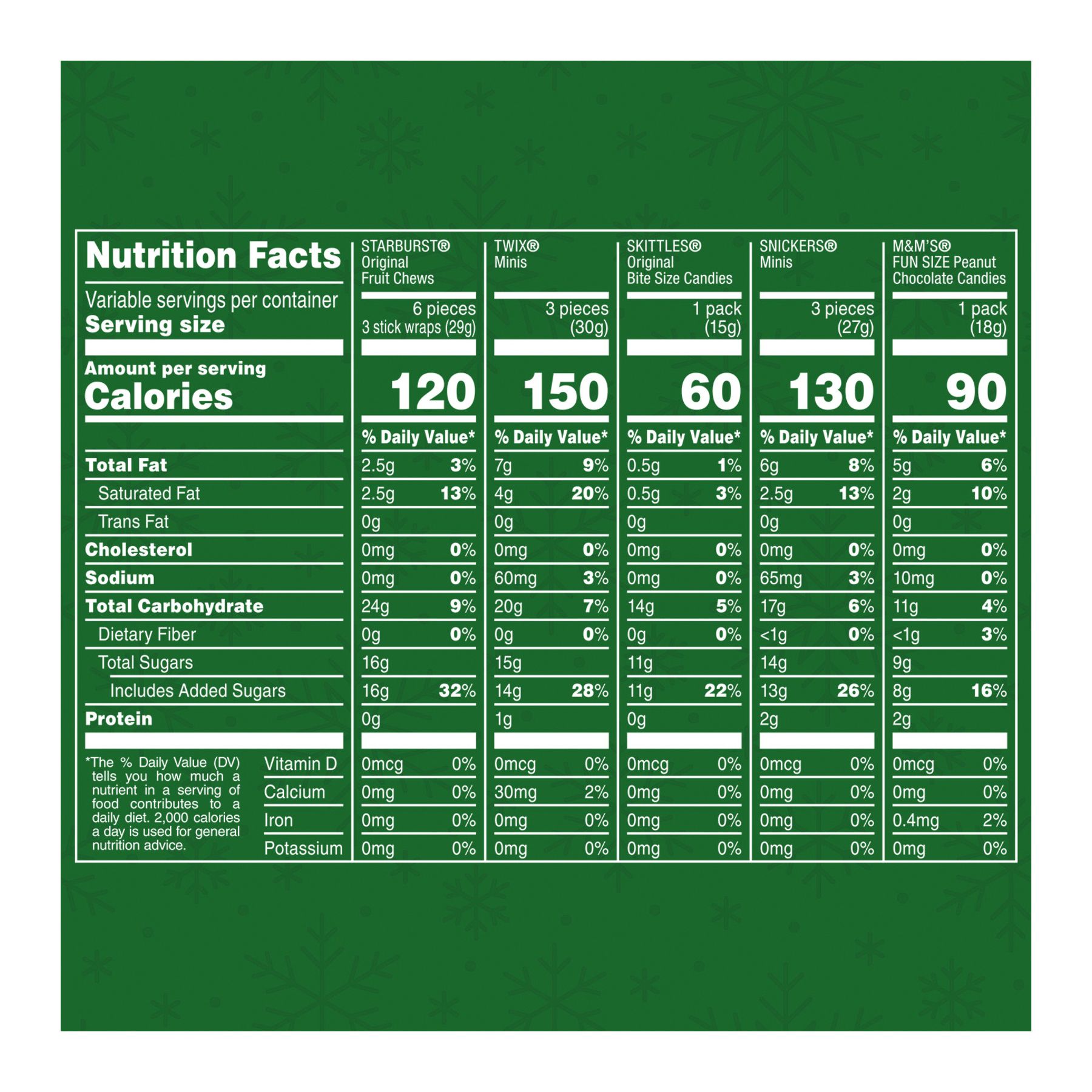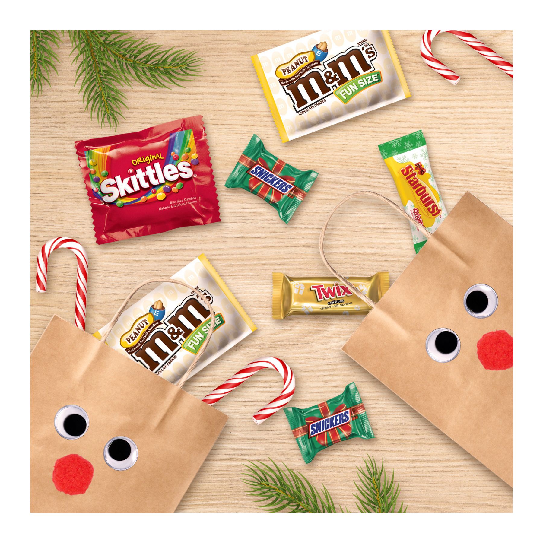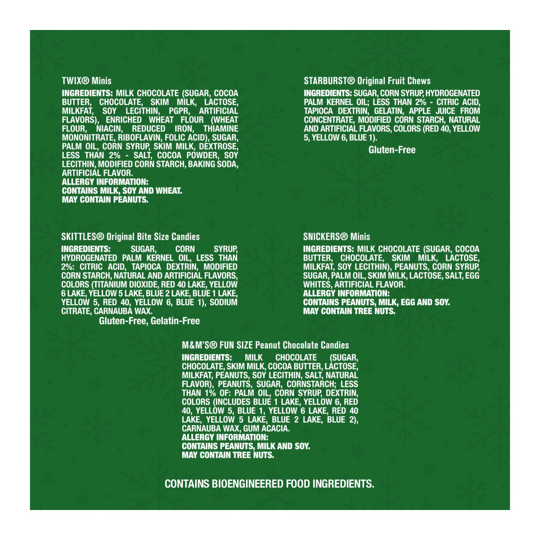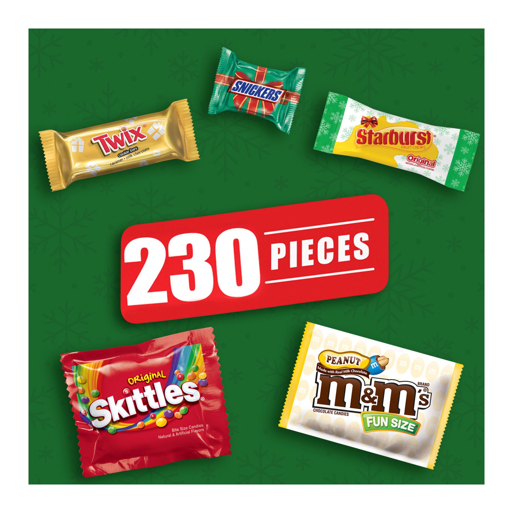 Contains one 96.75 ounce, 230-piece bulk candy bag of M&M'S, Snickers, Twix, Skittles and Starburst Christmas Candy Variety Pack