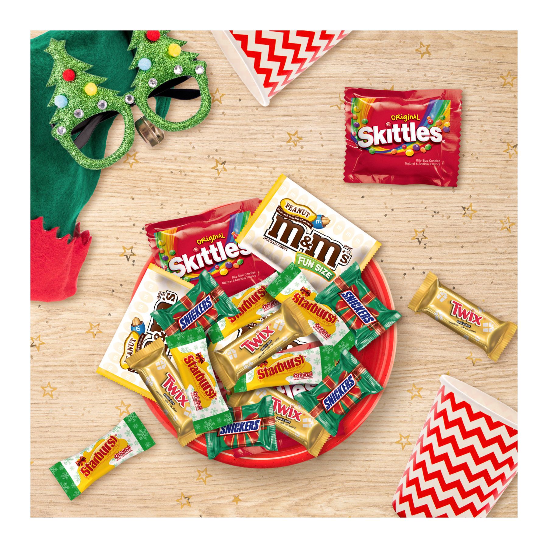 This milk chocolate and gummy candy Christmas assortment includes individually wrapped fun size and mini packs of Snickers Milk Chocolate Bars, Twix Caramel Chocolate Bars, Skittles Gummy Candy & Starburst Gummy Candy