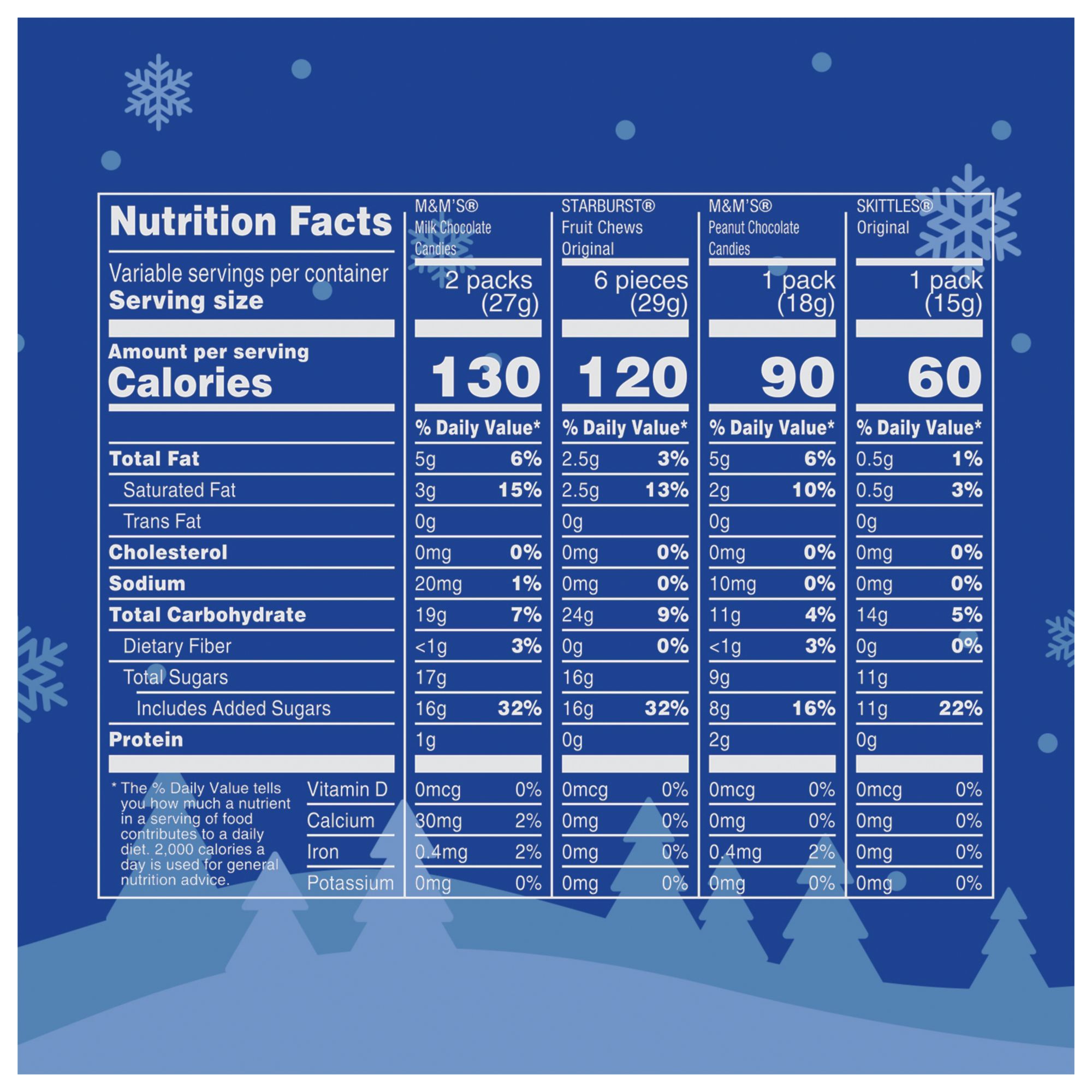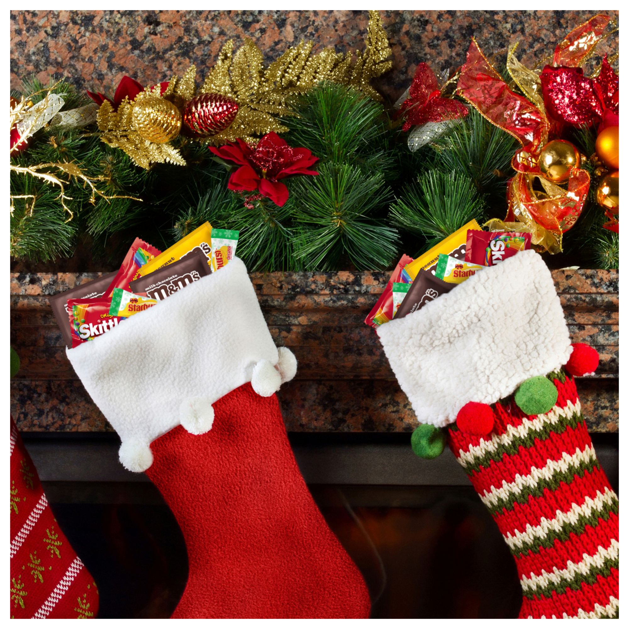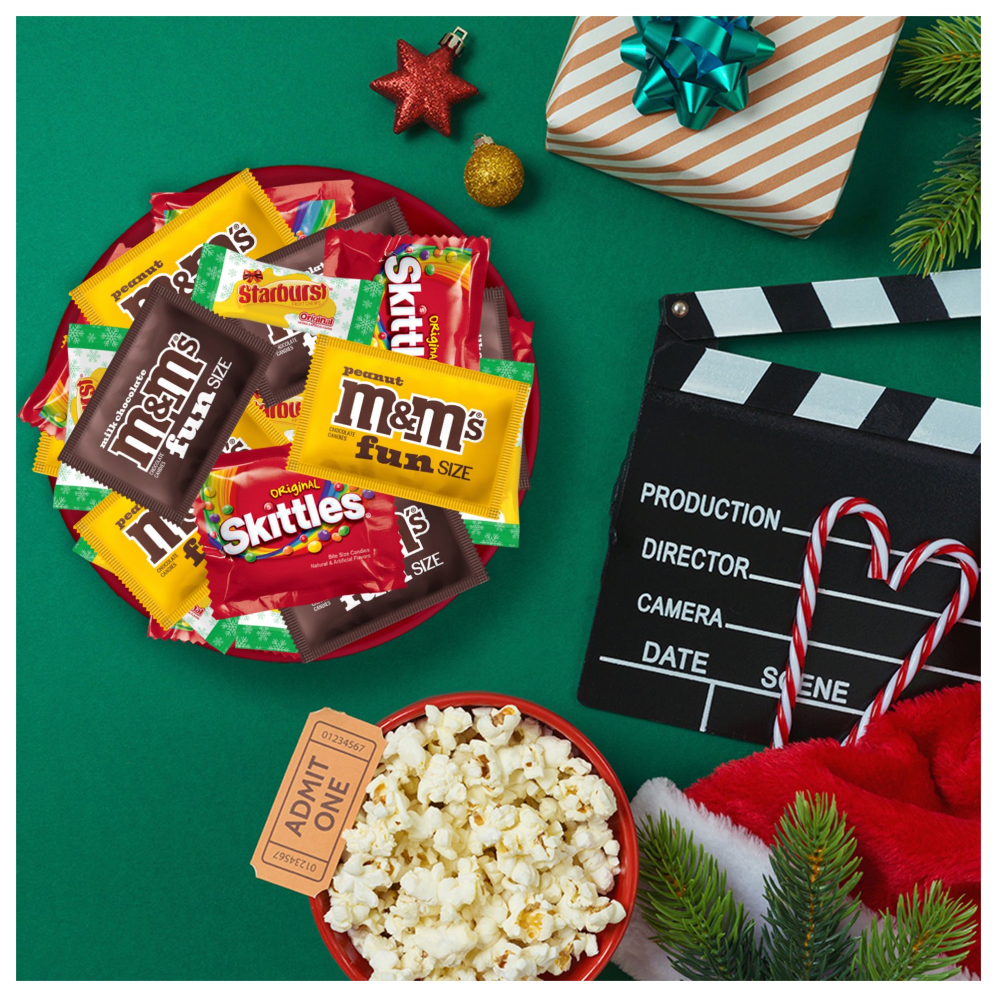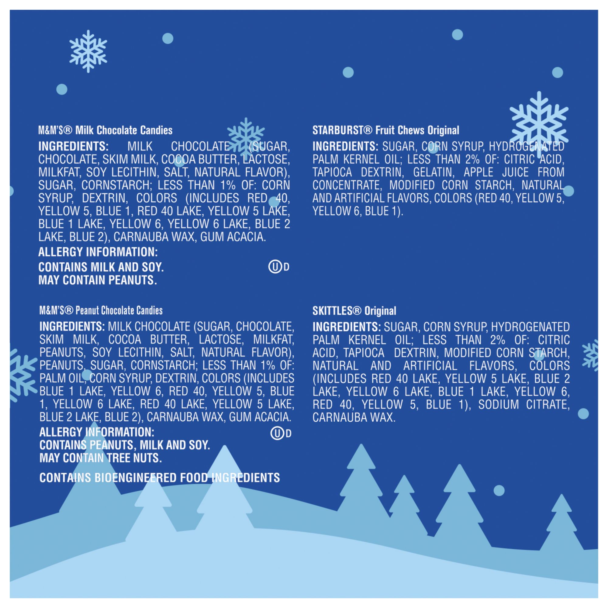 This milk chocolate and chewy candy Christmas assortment includes individually wrapped fun size M&M'S Milk Chocolate, M&M'S Peanut, Skittles Chewy Candy & Starburst Chewy Candy