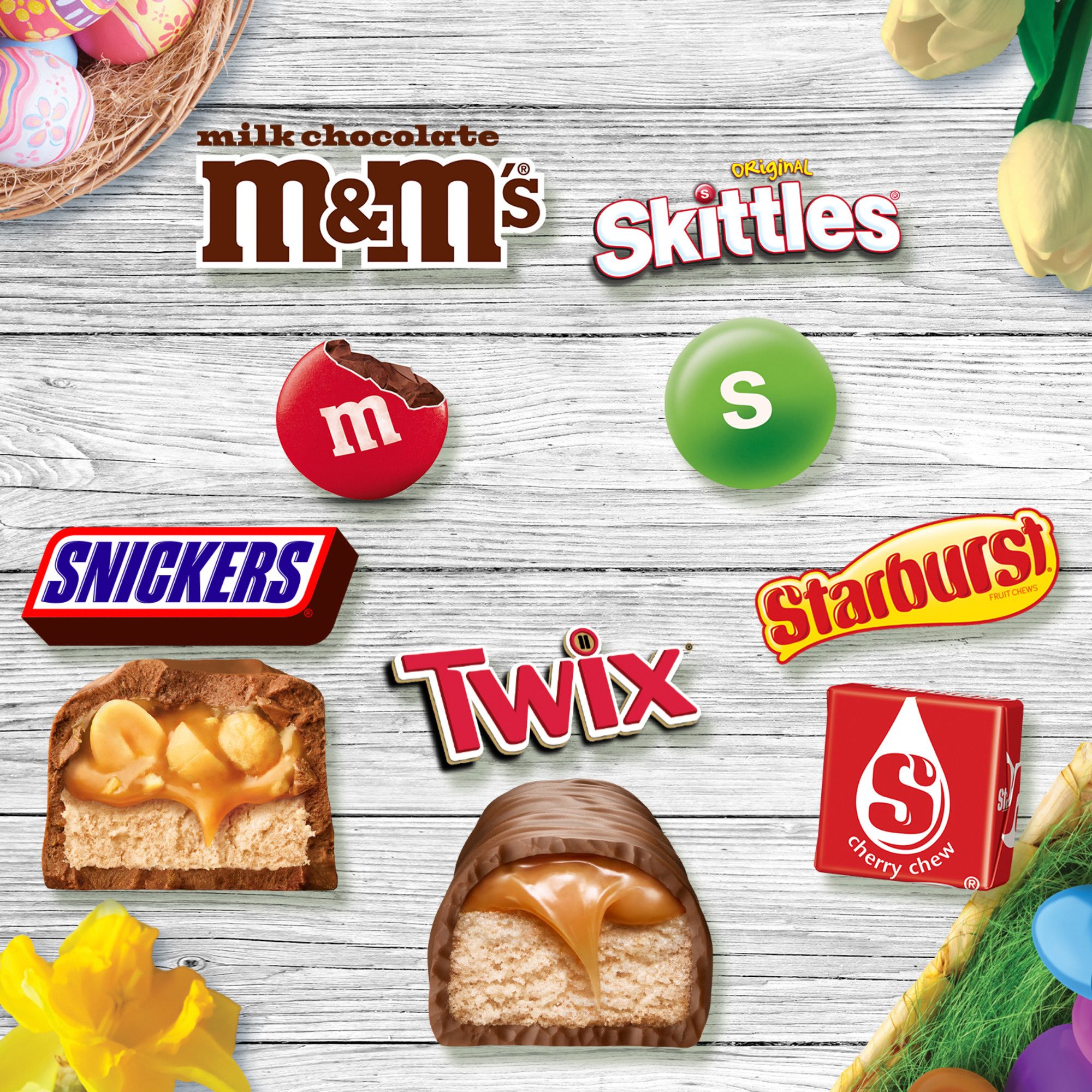 This Easter Egg Hunt essential includes fun size M&M's Milk Chocolate, Candy, mini Snickers Chocolate Bars, mini Twix Chocolate Bars, fun size Skittles Original Chewy Candy, and fun size Starburst Original Chewy Candy
