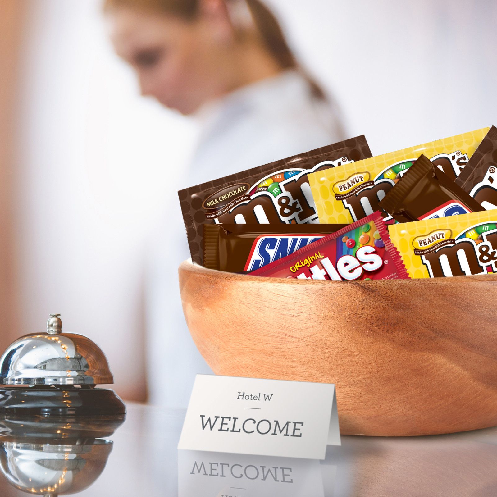 Includes 14 Snickers candy bars, 13 M&M's milk chocolate candy packs, 14 M&M's peanut chocolate candy packs, 11 Skittles original candy packs