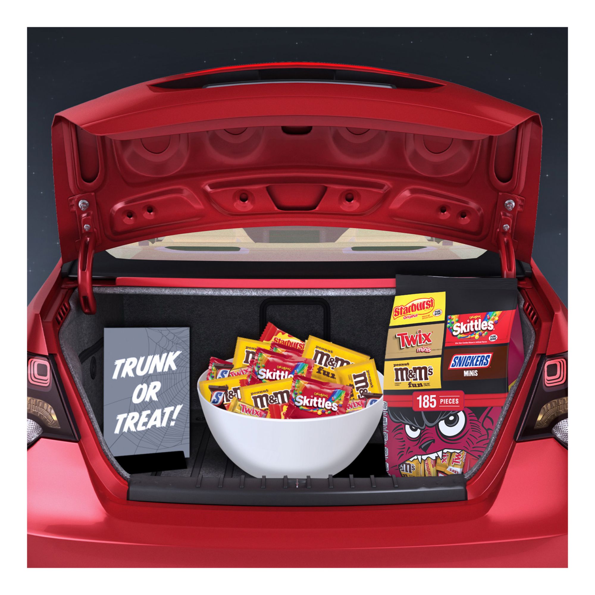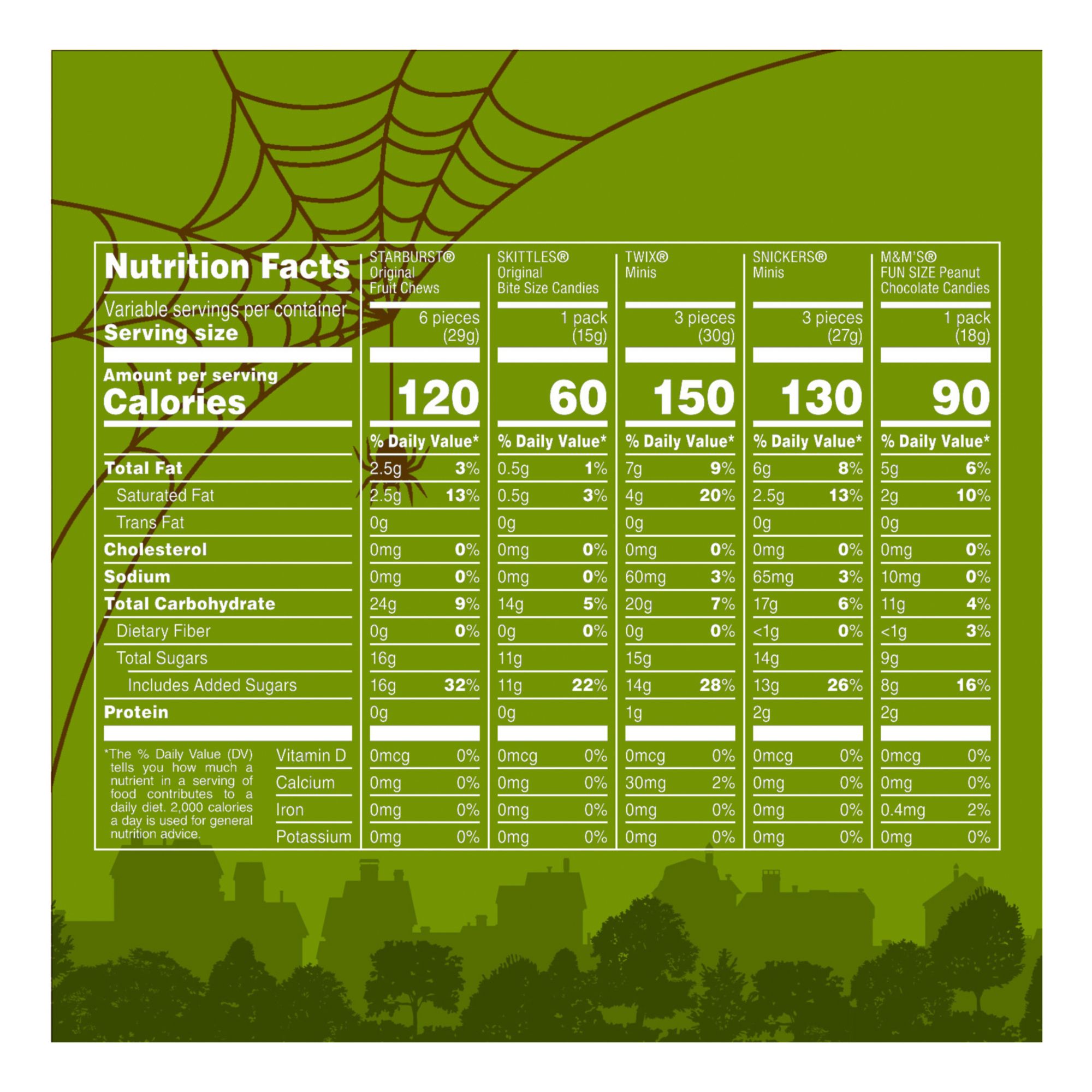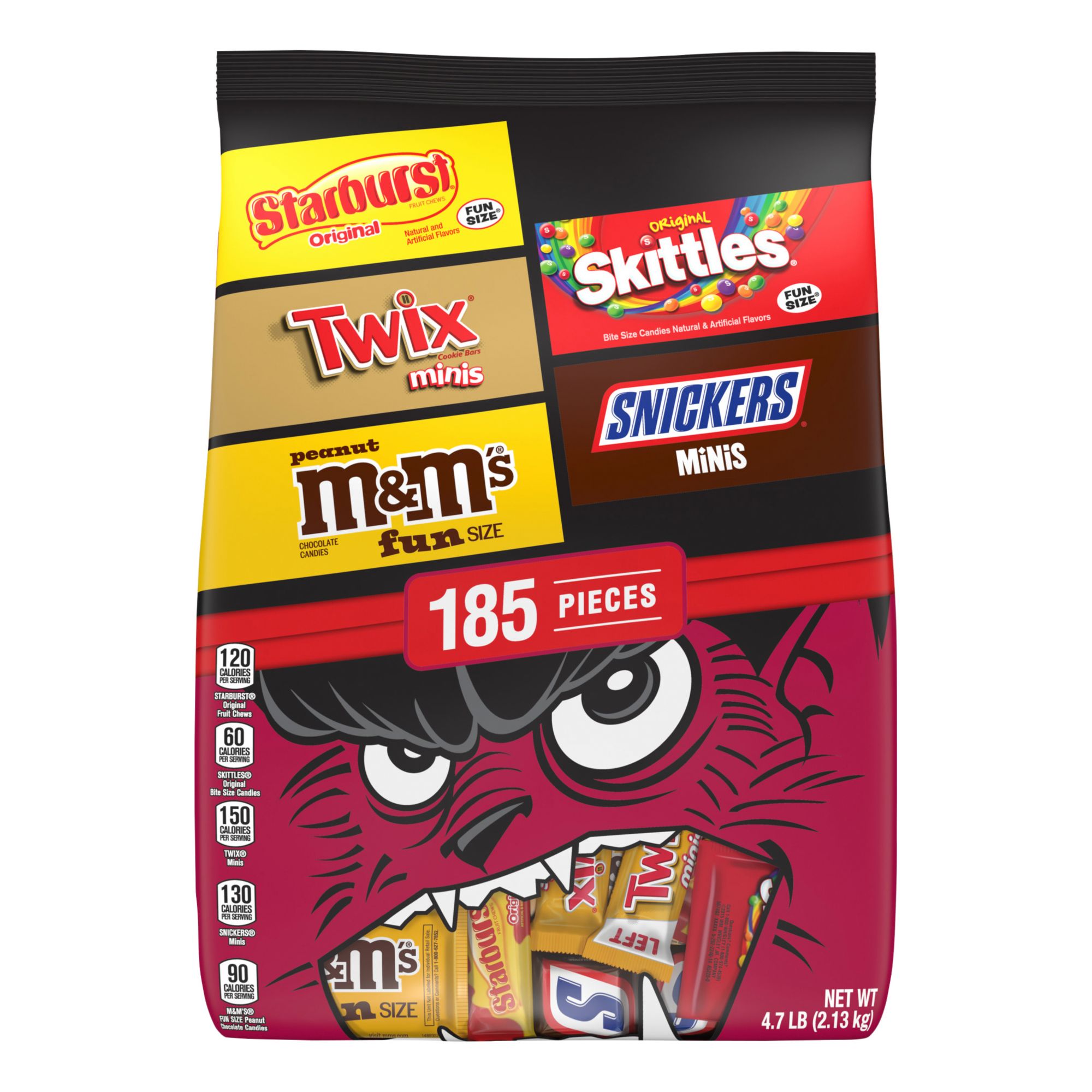 Contains one (1) 75.22-ounce, 185-piece bulk candy bag of individually wrapped M&M'S Peanut, Snickers, Starburst, Twix, and Skittles Halloween candy