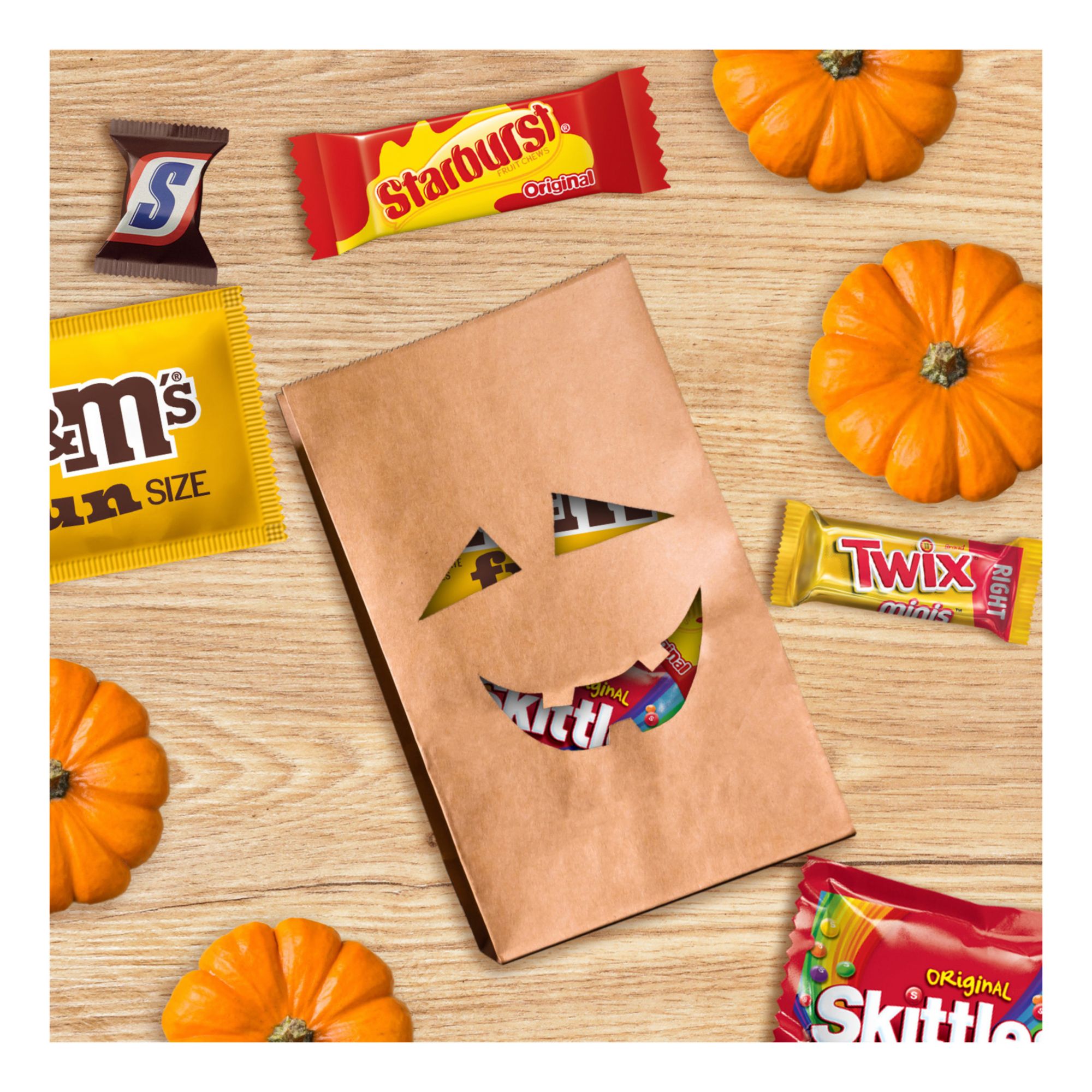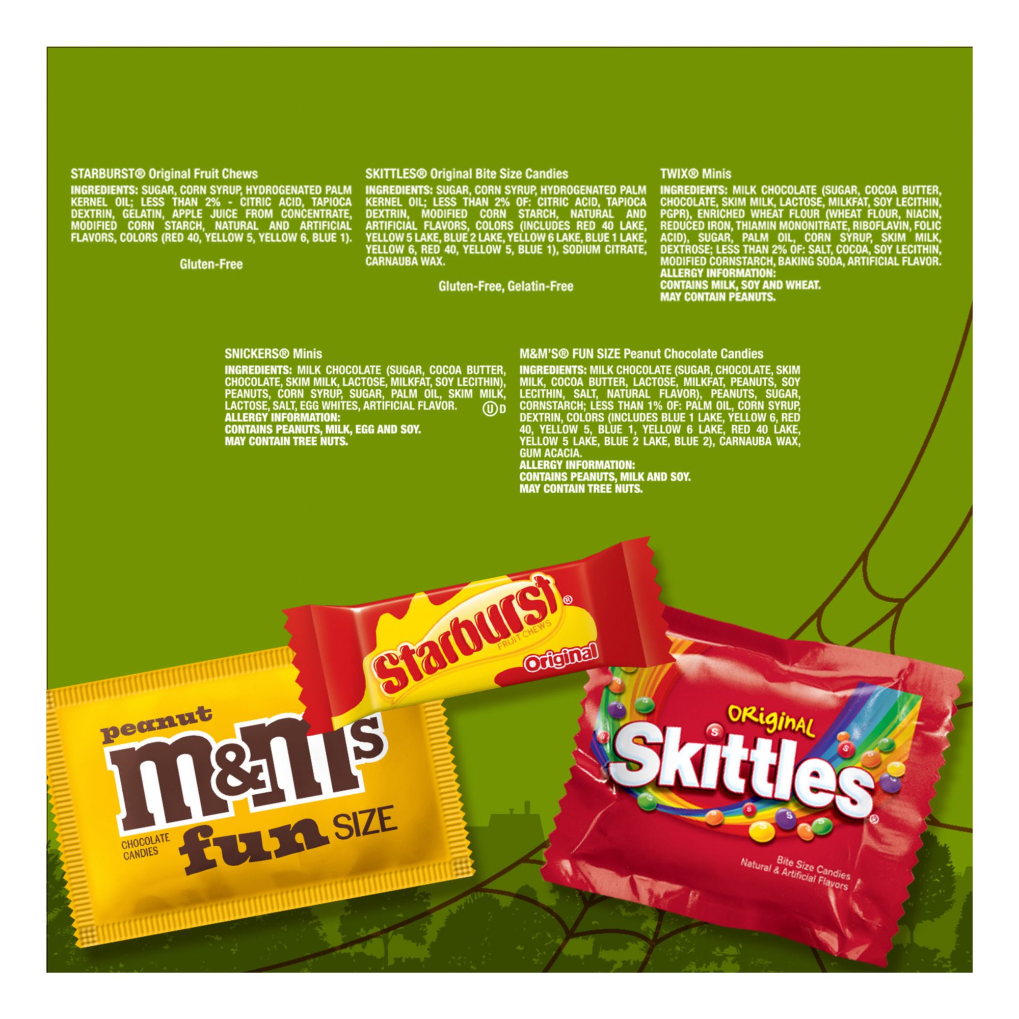 This Halloween bulk candy bag of trick or treat candy features individually wrapped Snickers Fun Size Milk Chocolate Bars, M&M'S Fun Size Peanut Milk Chocolate Candy, Twix Fun Size Milk Chocolate Bars, Skittles Originals Chewy Candy and Starburst Original Fun Size Fruit Candy Assortment