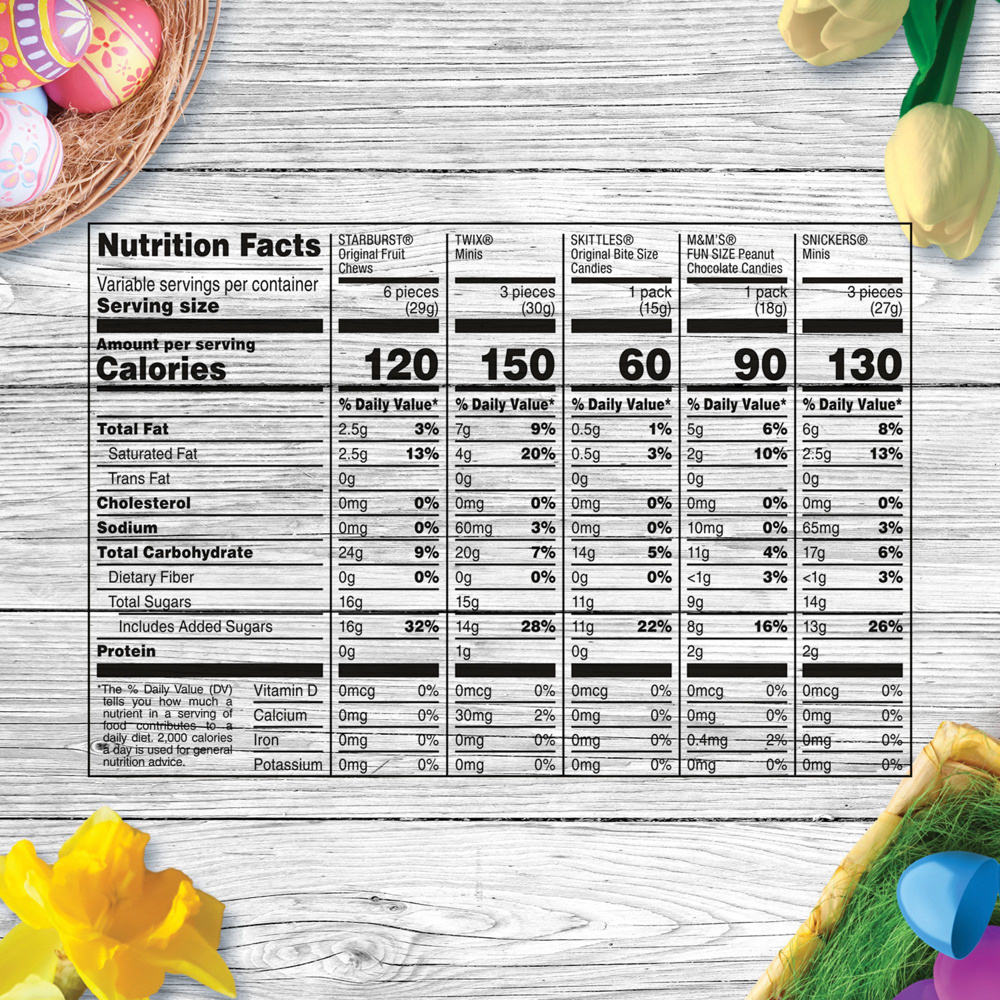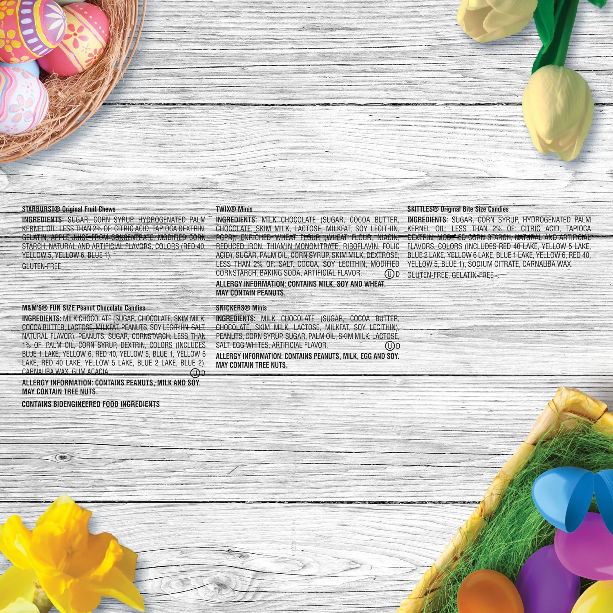 Ingredients: Starburst Original Fruit Chews Ingredients: Sugar, Corn Syrup, Hydrogenated Palm Kernel Oil; Less Than 2% Of: Citric Acid, Tapioca Dextrin, Gelatin, Apple Juice From Concentrate, Modified Corn Starch, Natural And Artificial Flavors, Colors (Red 40, Yellow 5, Yellow 6, Blue 1). Twix Minis Ingredients: Milk Chocolate (Sugar, Cocoa Butter, Chocolate, Skim Milk, Lactose, Milkfat, Soy Lecithin, Pgpr), Enriched Wheat Flour (Wheat Flour, Niacin, Reduced Iron, Thiamin Mononitrate, Riboflavin, Folic Acid), Sugar, Palm Oil, Corn Syrup, Skim Milk, Dextrose; Less Than 2% Of: Salt, Cocoa, Soy Lecithin, Modified Cornstarch, Baking Soda, Artificial Flavor. Skittles Original Bite Size Candies Ingredients: Sugar, Corn Syrup, Hydrogenated Palm Kernel Oil; Less Than 2% Of: Citric Acid, Tapioca Dextrin, Modified Corn Starch, Natural And Artificial Flavors, Colors (Includes Red 40 Lake, Yellow 5 Lake, Blue 2 Lake, Yellow 6 Lake, Blue 1 Lake, Yellow 6, Red 40, Yellow 5, Blue 1), Sodium Citrate, Carnauba Wax. M&m’s Fun Size Peanut Chocolate Candies Ingredients: Milk Chocolate (Sugar, Chocolate, Skim Milk, Cocoa Butter, Lactose, Milkfat, Peanuts, Soy Lecithin, Salt, Natural Flavor), Peanuts, Sugar, Cornstarch; Less Than 1% Of: Palm Oil, Corn Syrup, Dextrin, Colors (Includes Blue 1 Lake, Yellow 6, Red 40, Yellow 5, Blue 1, Yellow 6 Lake, Red 40 Lake, Yellow 5 Lake, Blue 2 Lake, Blue 2), Carnauba Wax, Gum Acacia. Snickers Minis Ingredients: Milk Chocolate (Sugar, Cocoa Butter, Chocolate, Skim Milk, Lactose, Milkfat, Soy Lecithin), Peanuts, Corn Syrup, Sugar, Palm Oil, Skim Milk, Lactose, Salt, Egg Whites, Artificial Flavor.