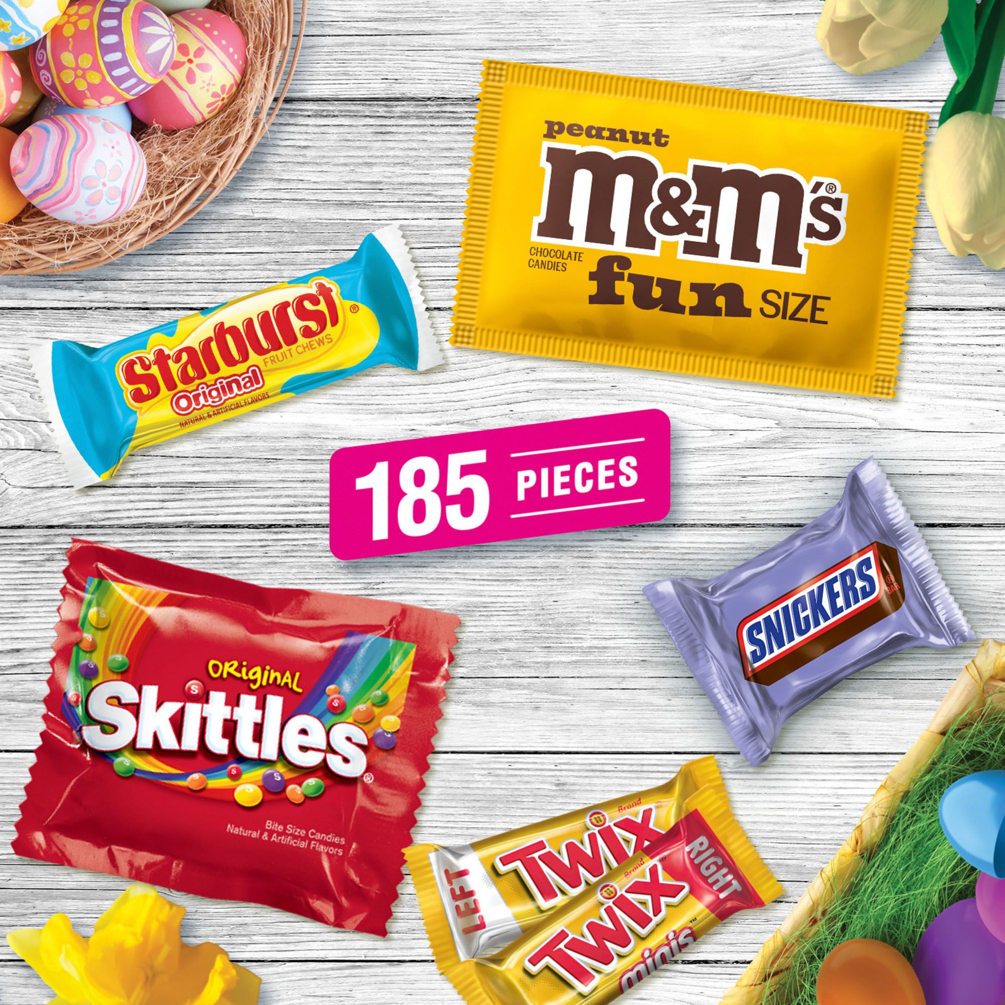 Contains one (1), 75.5 ounce, 185-count M&M'S, Snickers, Twix, Starburst & Skittles Easter Candy