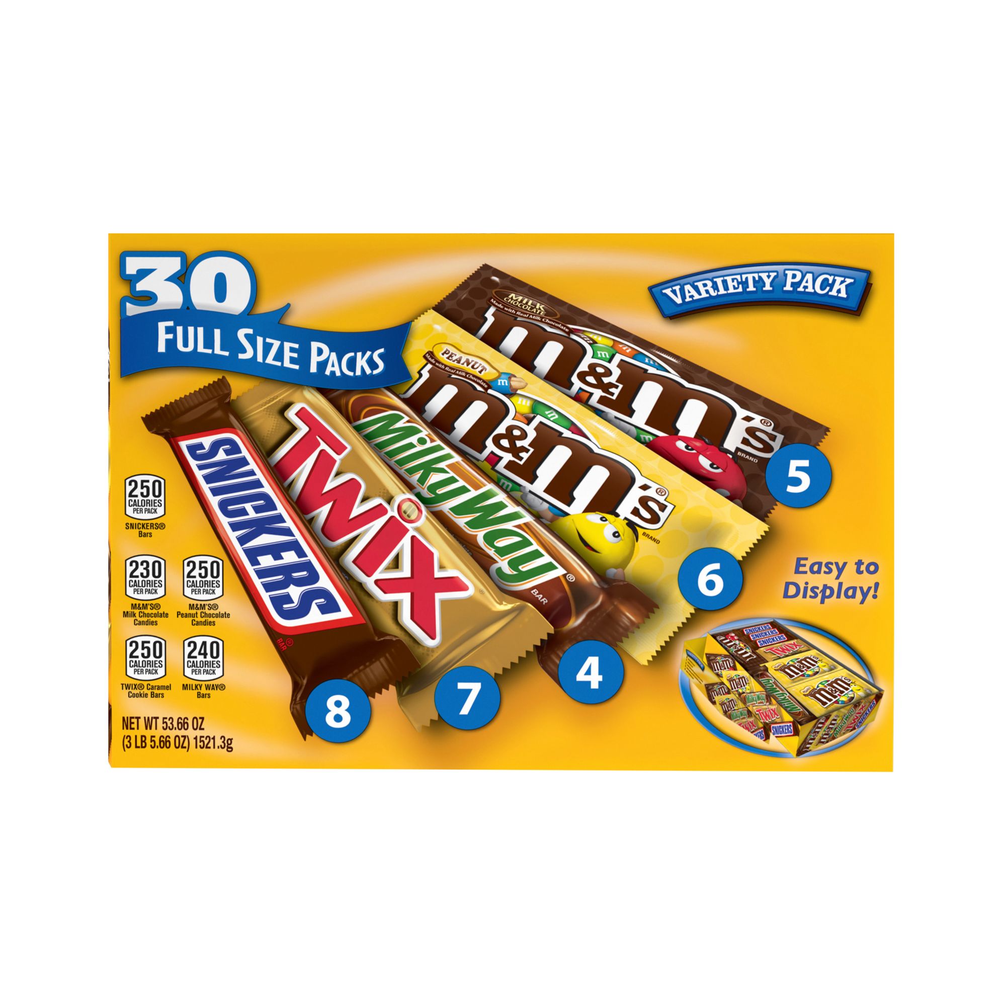 Contains one 53.66-ounce, 30-count box of full-size, individually wrapped (8) Snickers, (7) Twix, (6) M&M's Peanut Chocolate Candies, (5) M&M's Milk Chocolate Candies and (4) Milky Way Chocolate Candy Bars