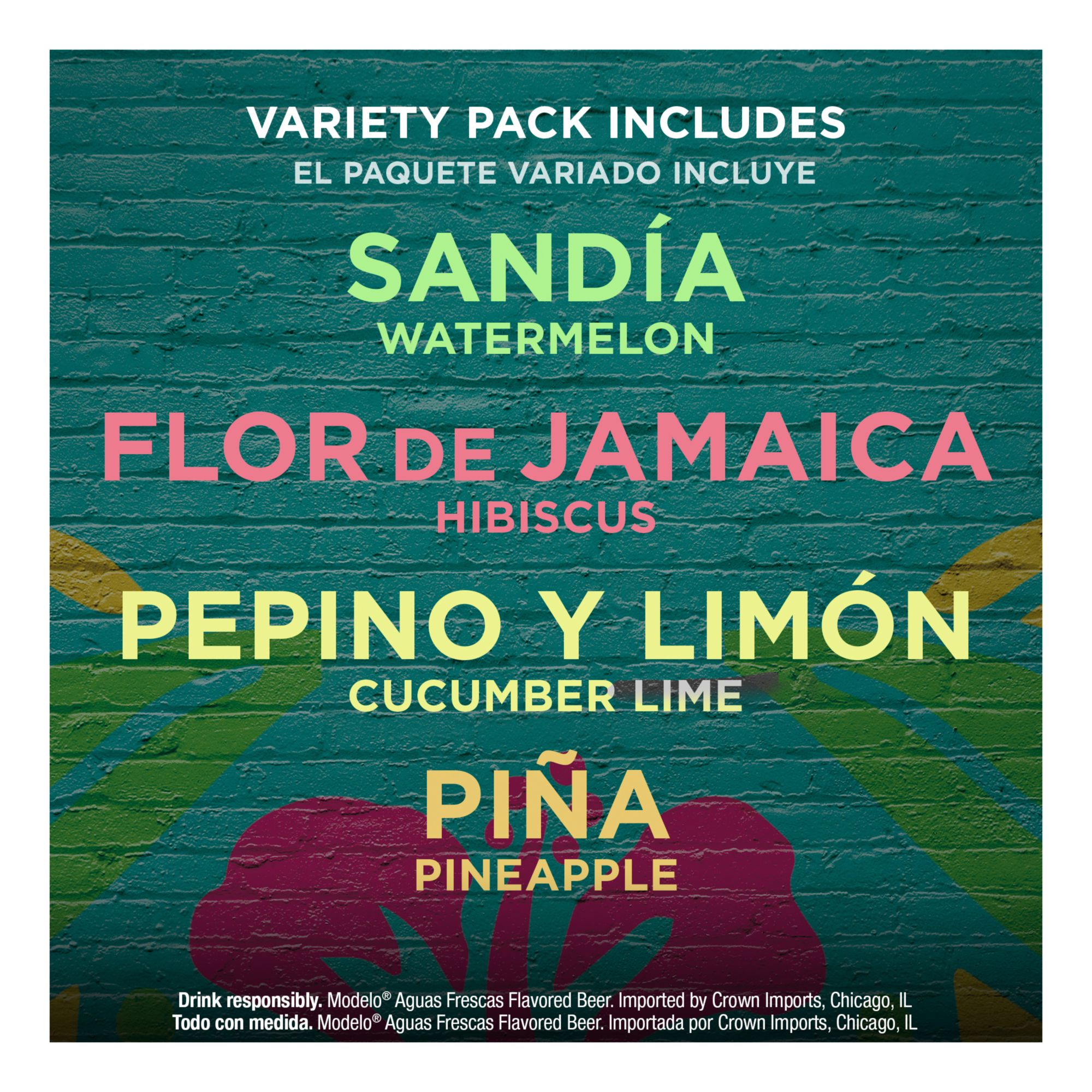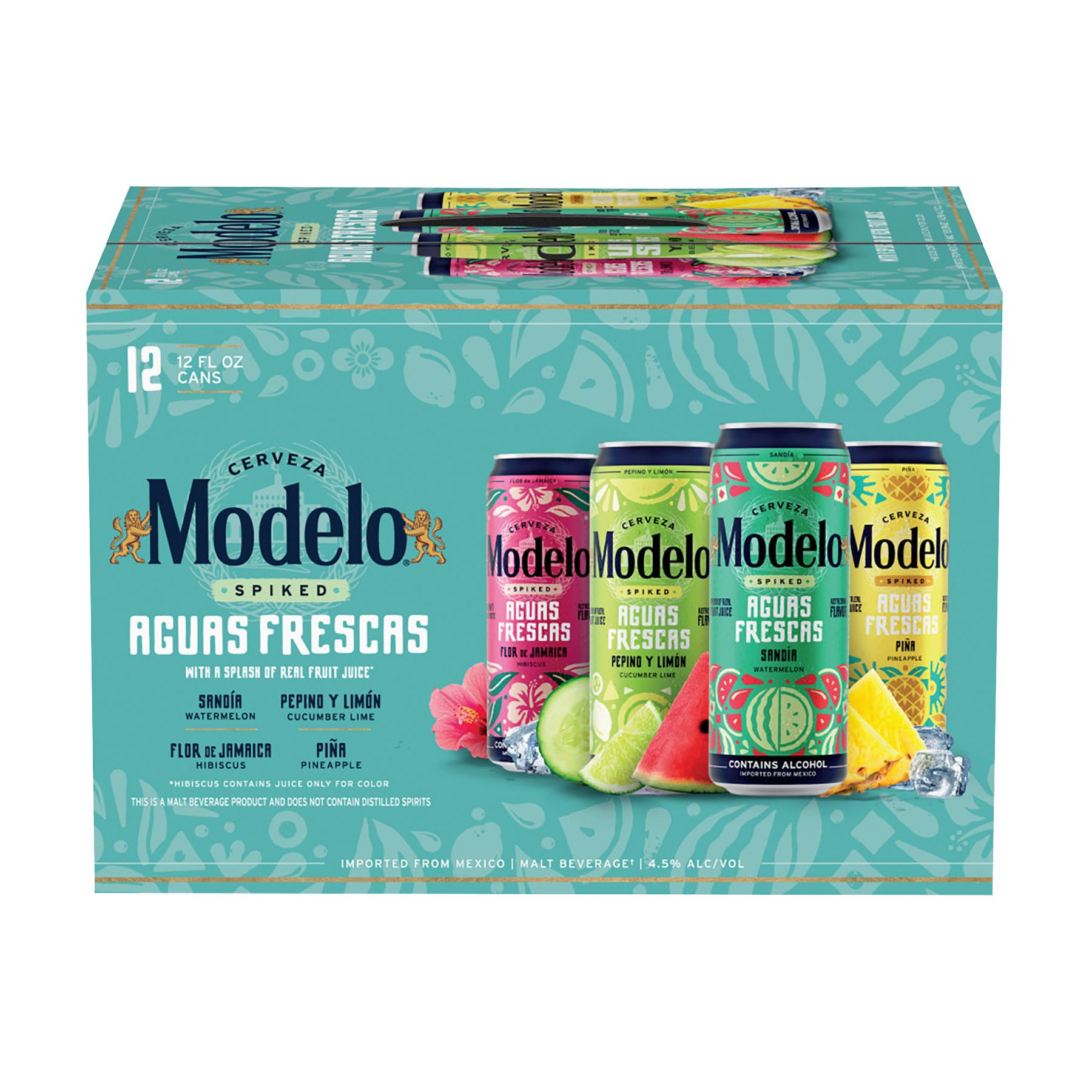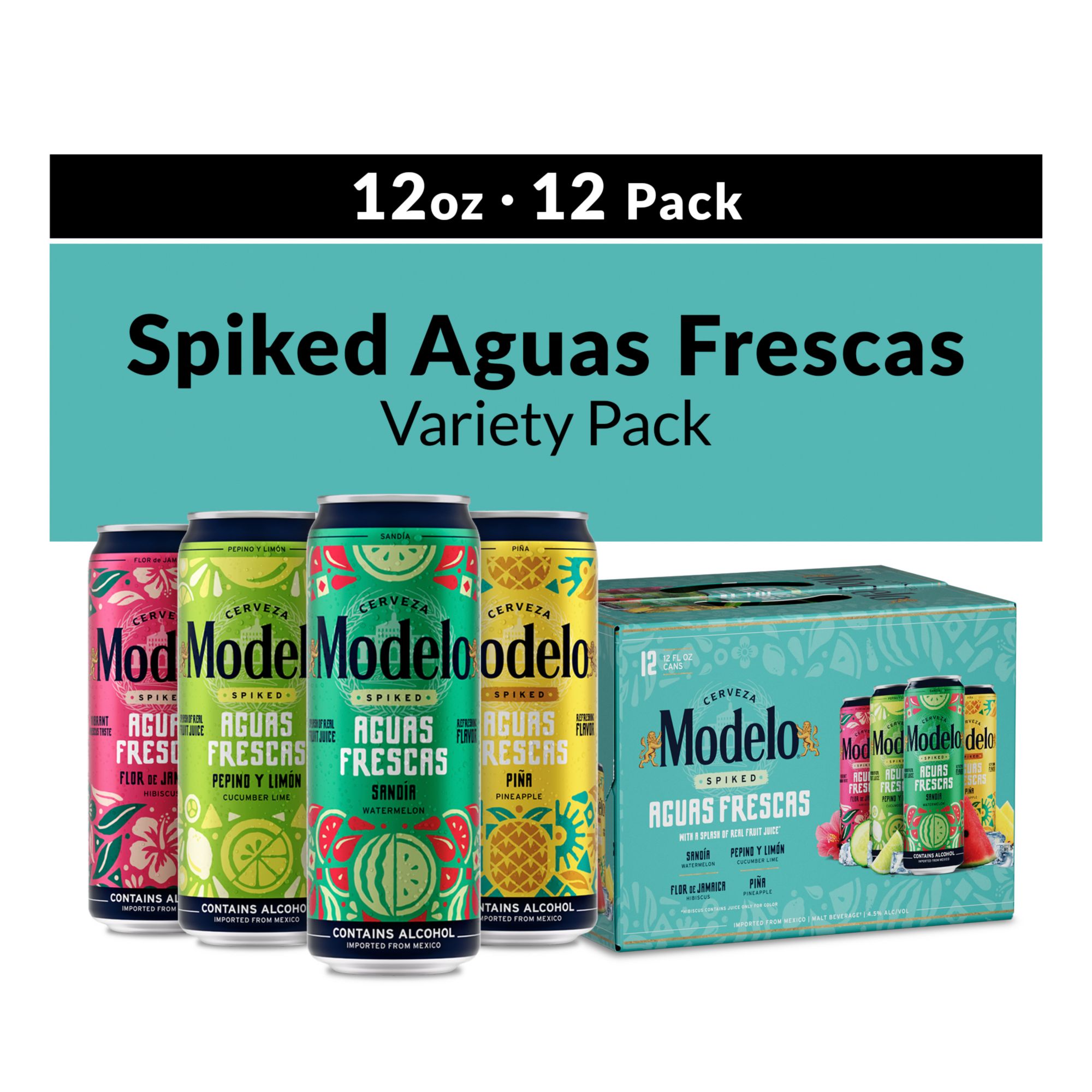 Modelo Spiked Aguas Frescas Variety Pack includes 12 slim cans of fruit-forward, flavored malt beverages, including Pina (Pineapple), Sandia (Watermelon), Pepino y Limon (Cucumber Lime), and Flor de Jamaica (Hibiscus) flavors. The lightly spiked, ready-to-drink beverages in this 12-pack are inspired by the traditional aguas frescas found in Mexico. With fewer than 200 calories* per can, a splash of real fruit juice**, and no artificial sweeteners or artificial flavors, they provide a lightly carbonated, full-flavored experience. *Not a low-calorie food. **Hibiscus contains juice only for color. Drink responsibly.
