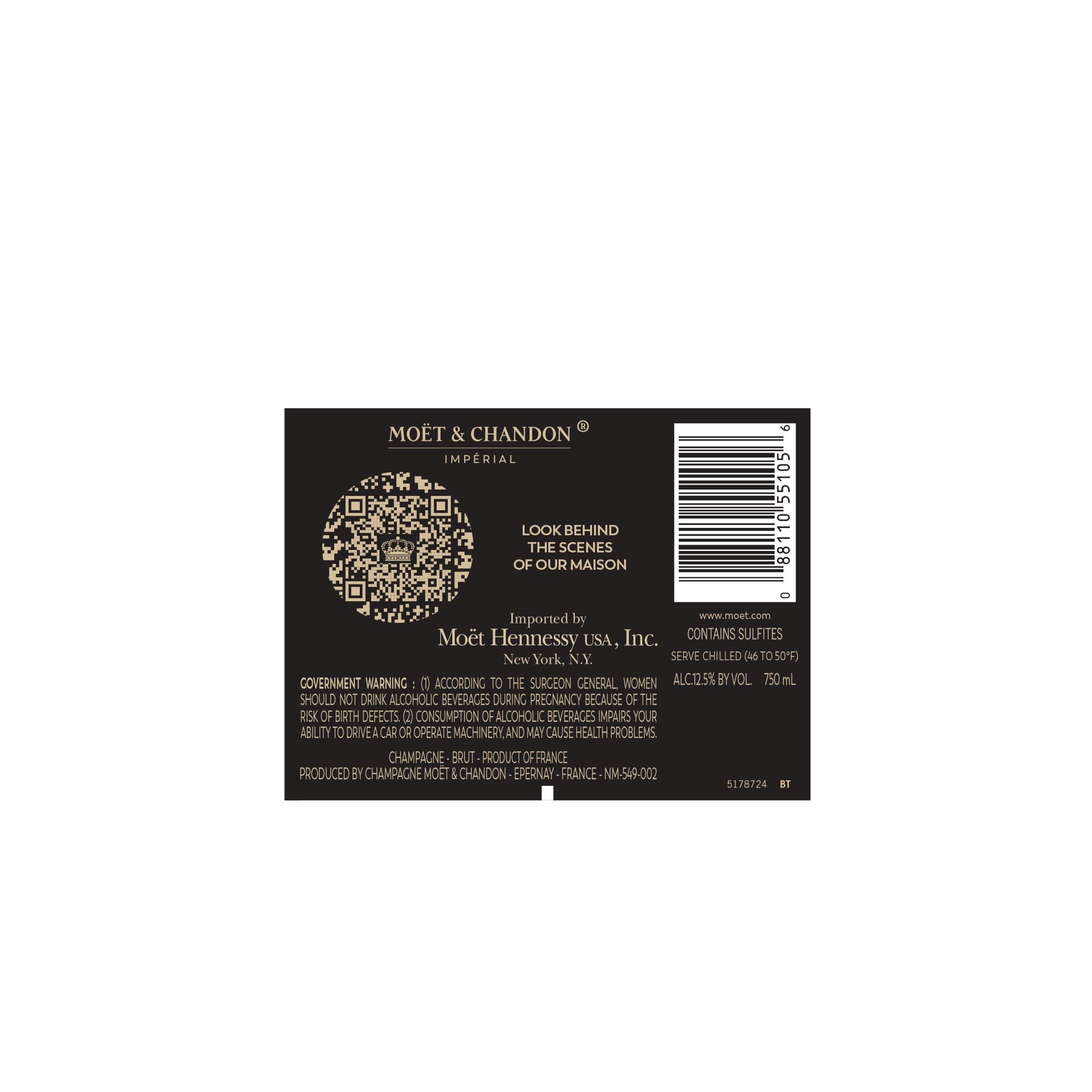Moet Imperial is the House's iconic champagne. Created in 1869, it embodies the unique Moet & Chandon style; a style that distinguishes itself by its bright fruitiness, seductive palate, and elegant maturity. Color: Golden straw yellow with green highlights. Bouquet: Vibrant intensity of green apple and citrus fruit; fresh mineral nuances and white flowers; elegant blonde notes of brioche and fresh nuts. Palate: Fresh white-fleshed fruits (pear, peach, apple) and vibrant citrus fruit brought to life with fine, lively bubbles and a bright finish.