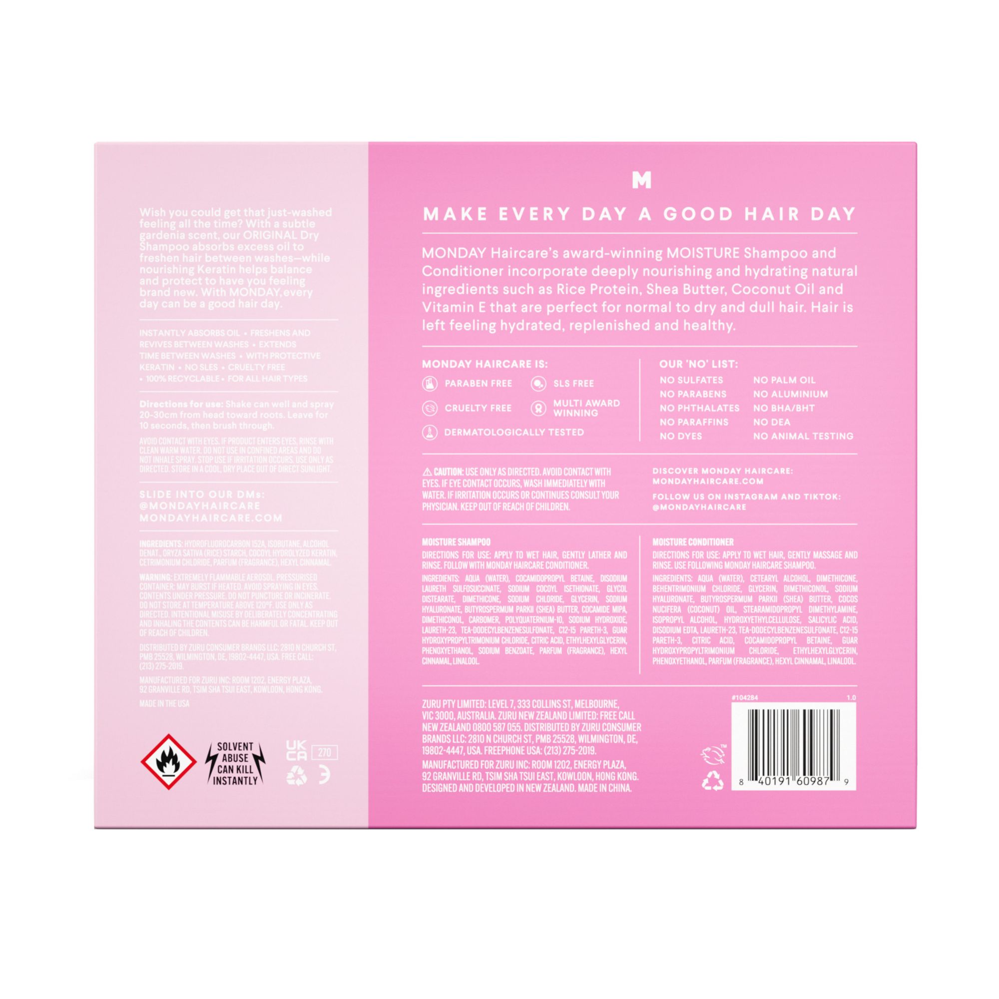 Make every day a good hair day. This trio of Monday's best-selling products makes for the ultimate everyday good-hair routine. Moisture shampoo and conditioner help to hydrate and replenish hair with hyaluronic acid, while original dry shampoo instantly refreshes and protects with hydrolyzed keratin Perfect for all hair types this three-step routine will leave hair hydrated, nourished and protected-for good hair every day.