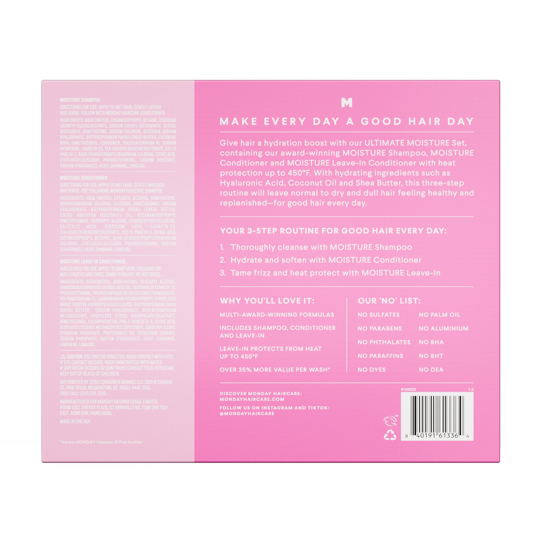 Make every day a good hair day. Give hair a hydration boost with Monday's ultimate moisture set, containing our award-winning moisture shampoo, moisture conditioner and moisture leave-in conditioner with heat protection up to 450 degrees F. With hydrating ingredients such as hyaluronic acid, coconut oil and shea butter, this three-step routine will leave normal to dry and dull hair feeling healthy and replenished-for good hair every day.