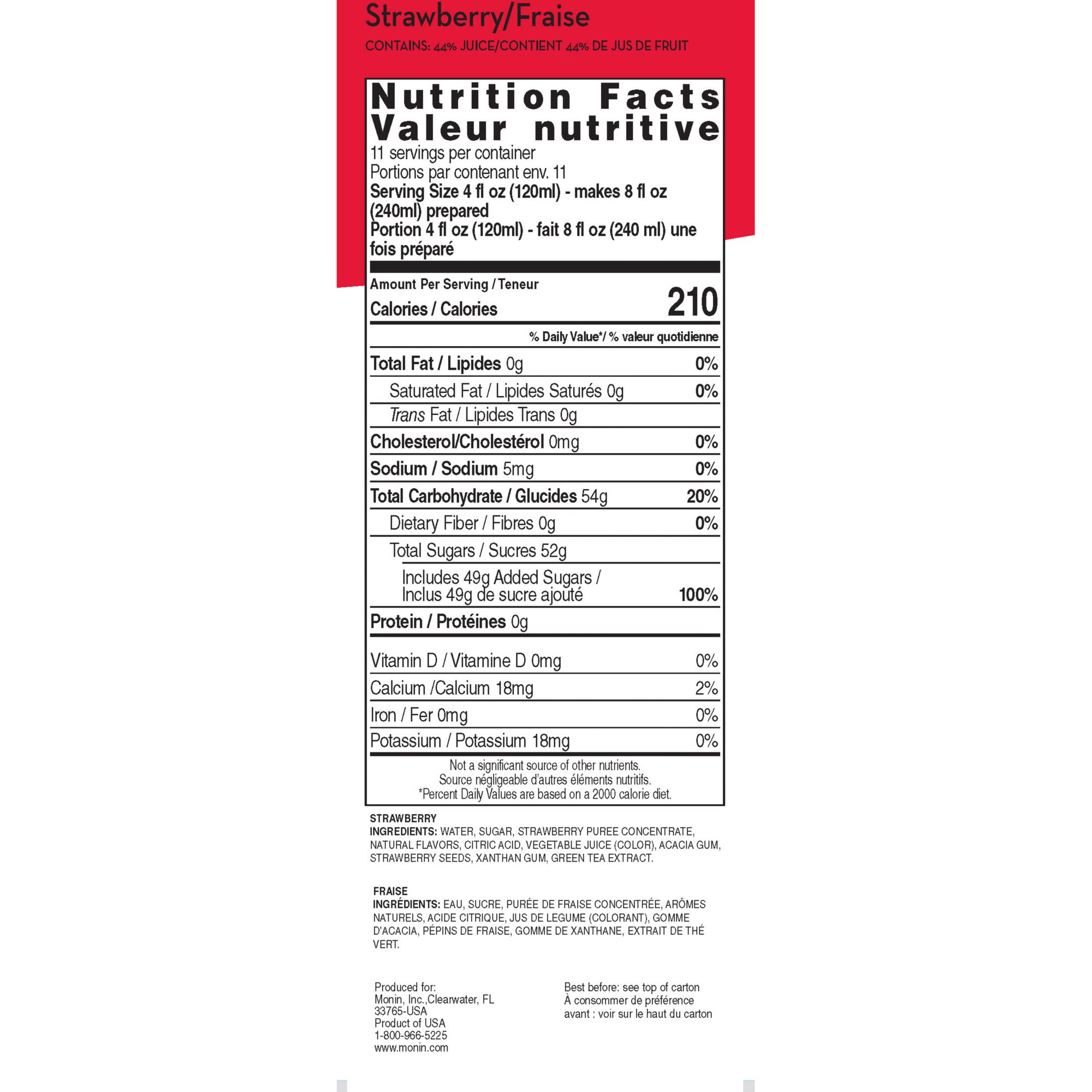 Fantastically fresh and fruity! When strawberry season arrives there is nothing better than the bright, bold and sweet flavors that those ripened strawberries bring. Extend that strawberry sensation all year long, and blend up delightful drinks for kids and adults with Monin Strawberry Fruit Smoothie Mix. Monin Strawberry Fruit Smoothie Mix makes it so easy to create sweet, juicy strawberry frozen drinks. Just pour over ice and blend for the perfect natural smoothie, made with real fruit and no artificial ingredients. Does not contain any artificial flavors, colors, sweeteners or preservatives. Monin Strawberry Fruit Smoothie Mix is also versatile for creating delicious frozen cocktails and mocktails, or simply add to lemonade and iced teas for a splash of natural flavor.