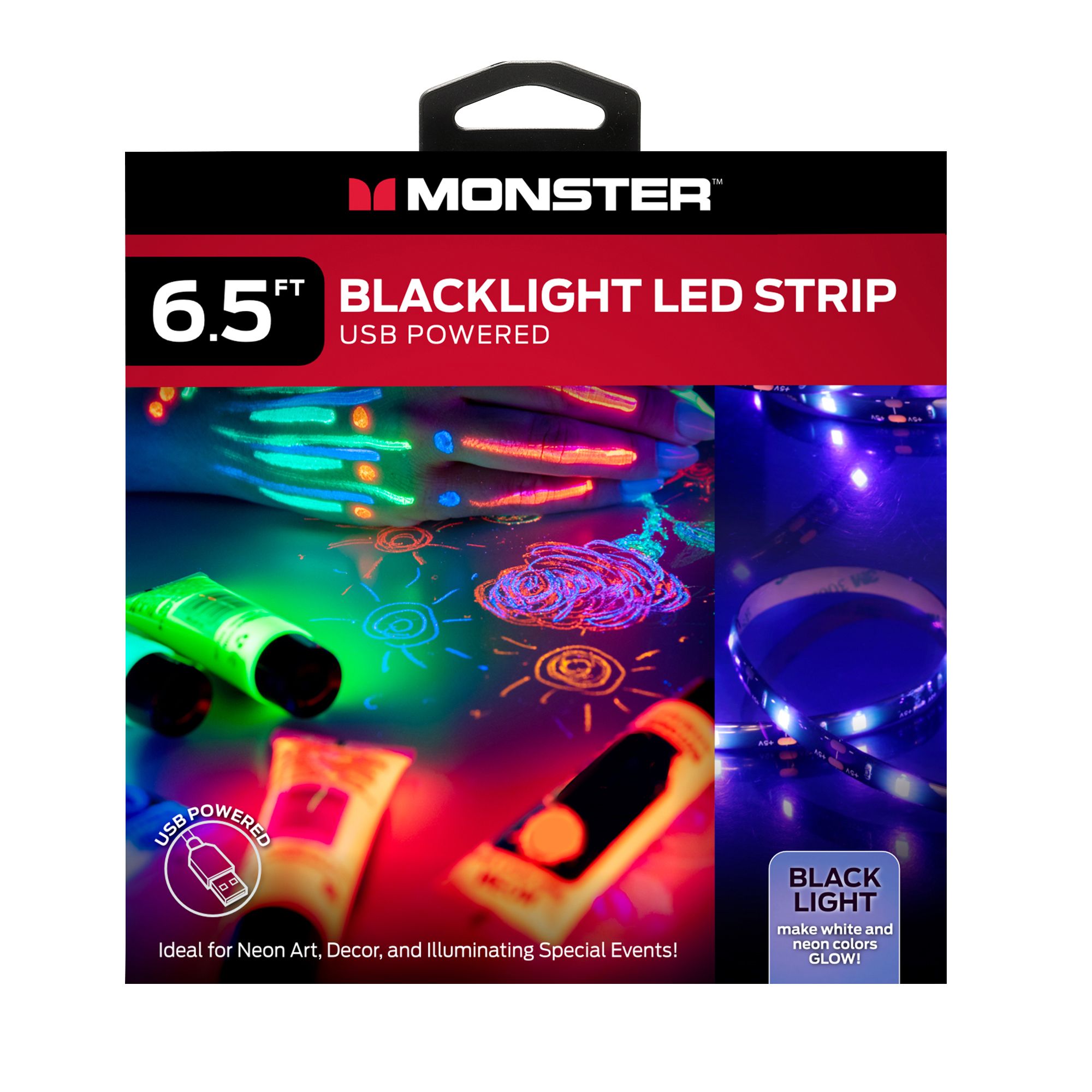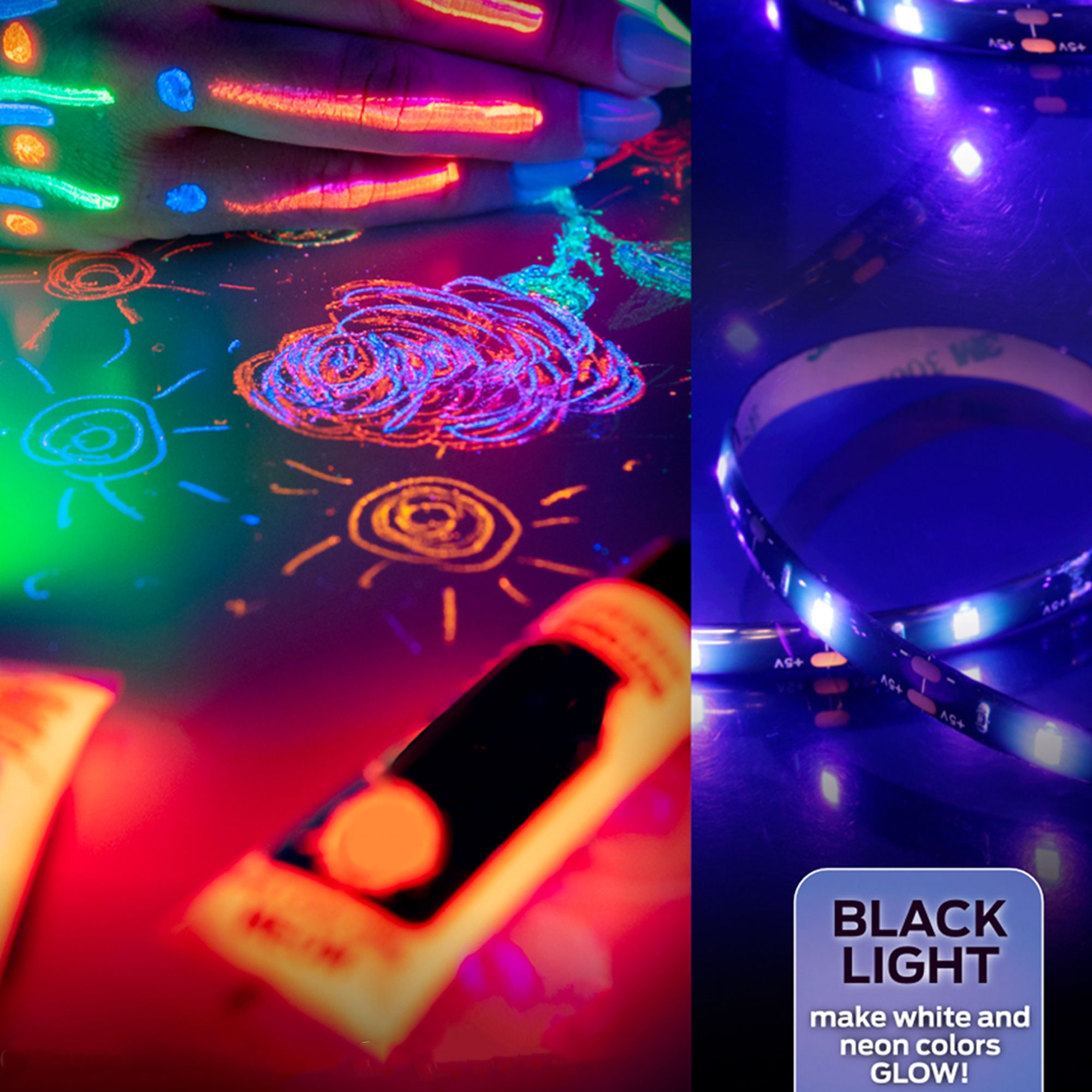 This strip creates the perfect ambient effect for your next party or special event. Thanks to the blacklight design you can make white and neon colors glow while effortlessly accenting decor. Simply apply the adhesive strip to any surface and cut to the desired length.
