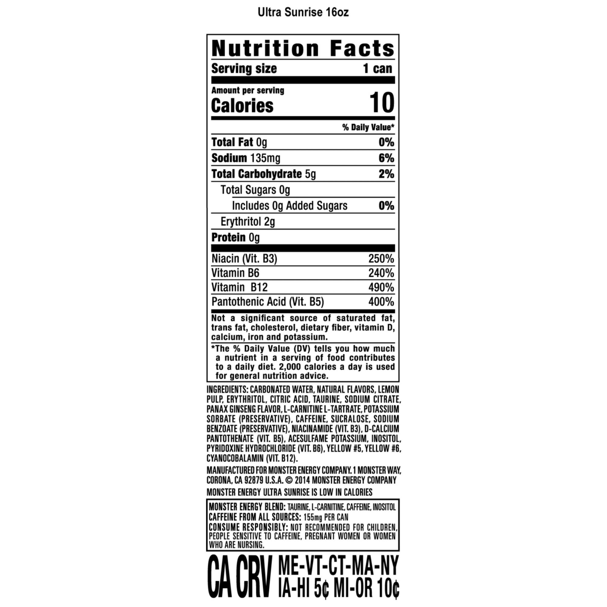 Ultra sunrise will get you started but is great anytime: light, crisp, and refreshing with a flavor all its own. Packed with a full load of our monster energy blend to keep the fire burning all day long. After all it's always sunrise somewhere. With a refreshing orange citrus flavor, taurine, panax ginseng extract, L-carnitine, caffeine, guarana extract, glucuronolactone, inositol. Zero Sugar. Zero Calories.