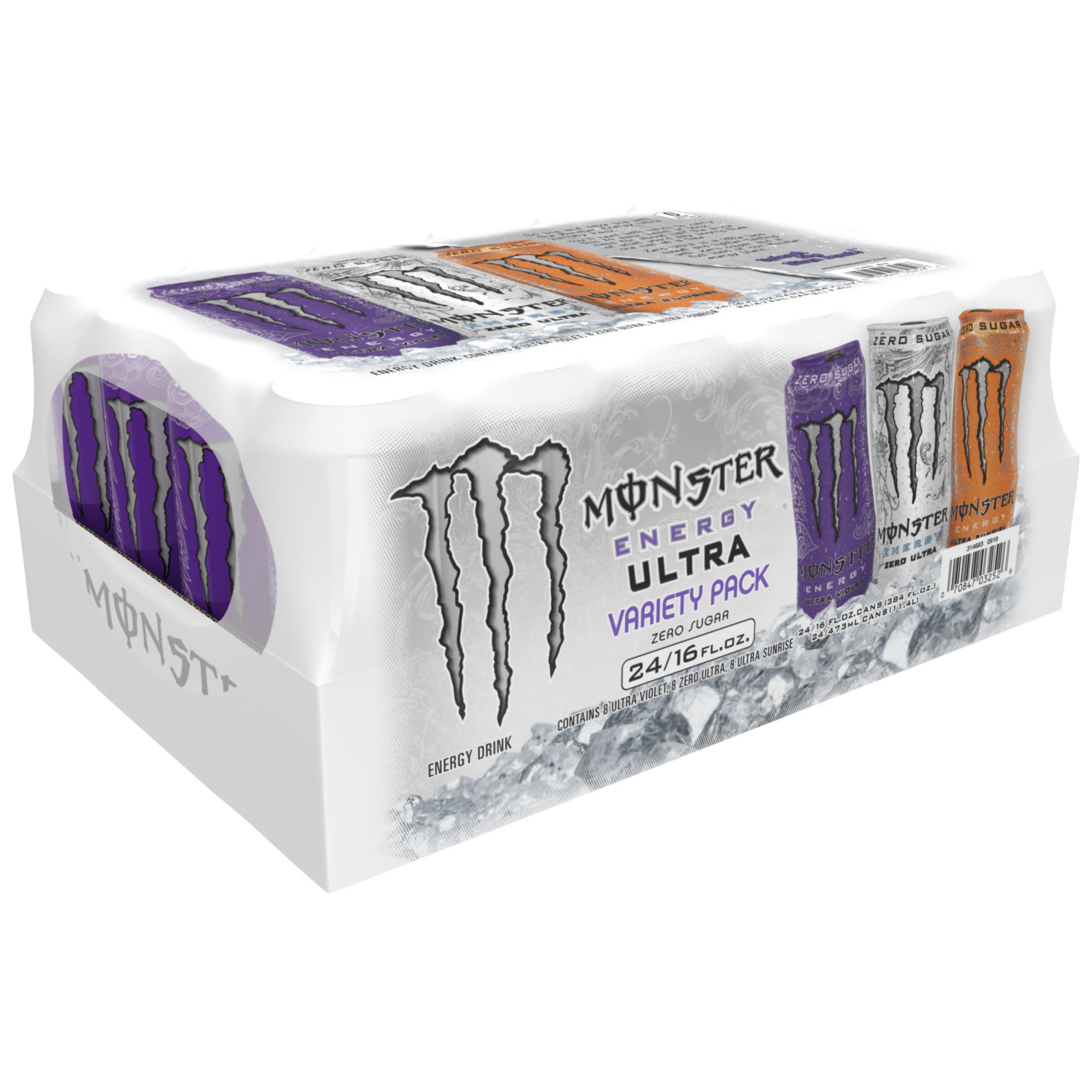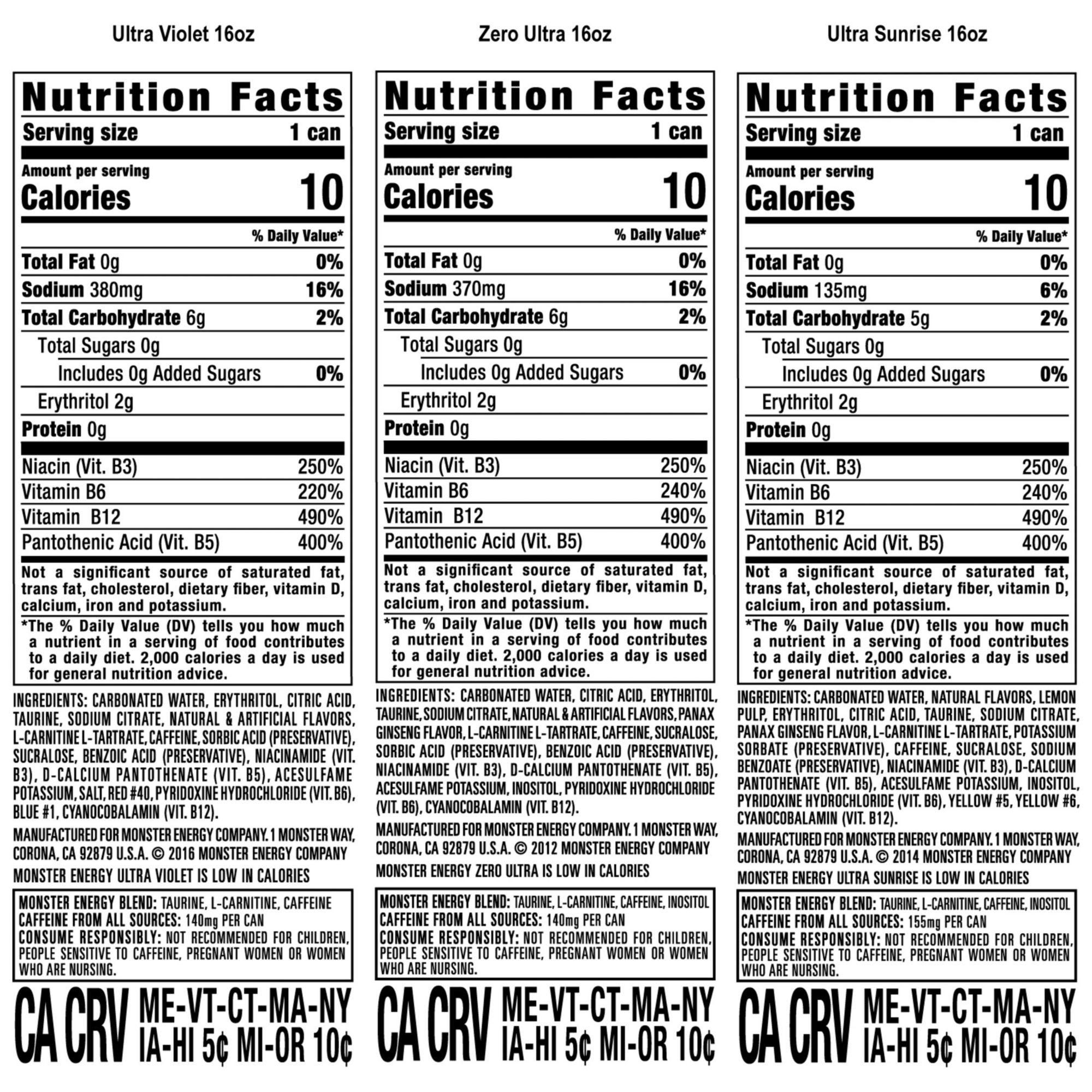 Monster Ultra Zero Sampler pack, with three flavors, Ultra Zero, Ultra Violet and Ultra Sunrise. Hop on this white, purple and orange Monster for the ride! Made with zero sugar and zero calories for an energy drink with out the crash.