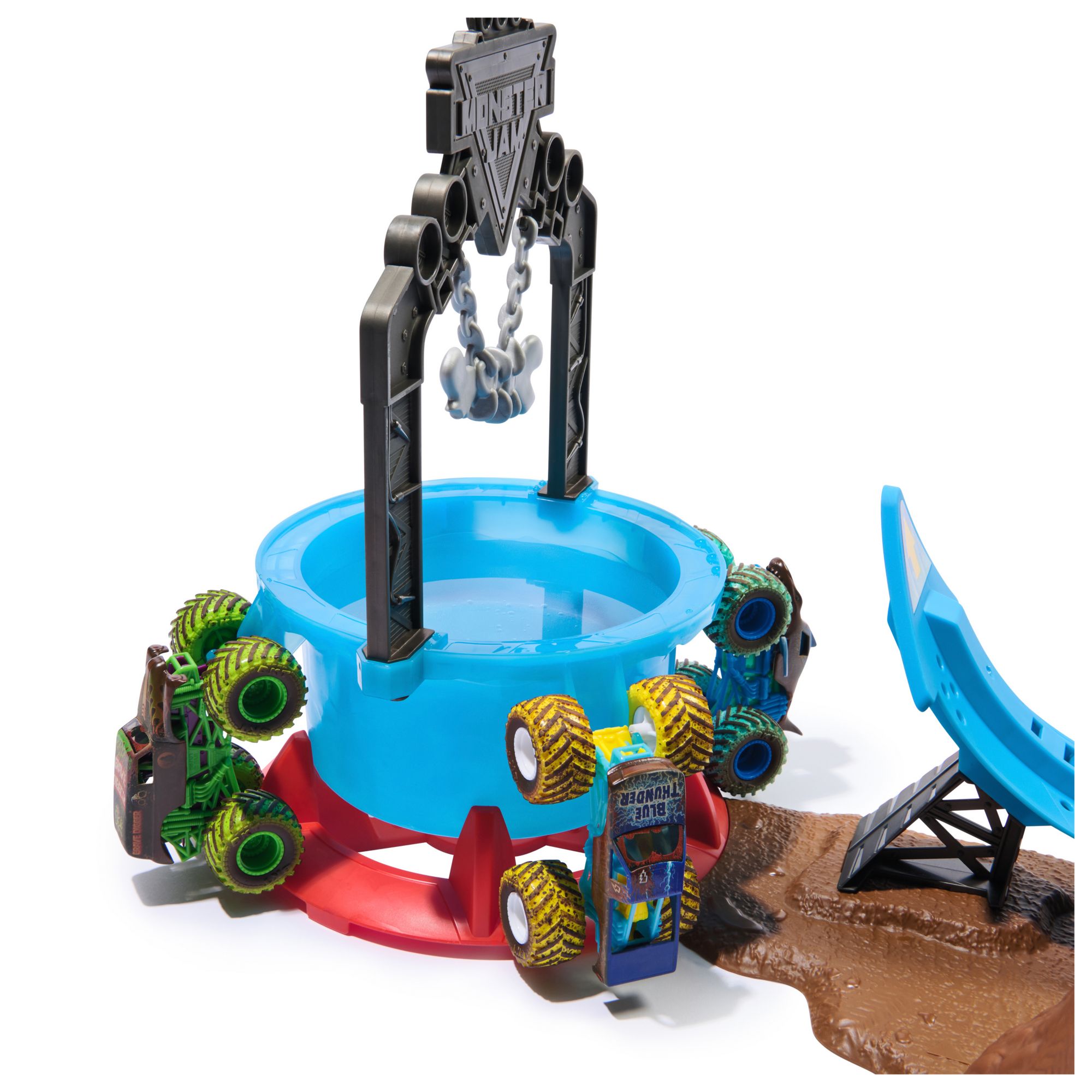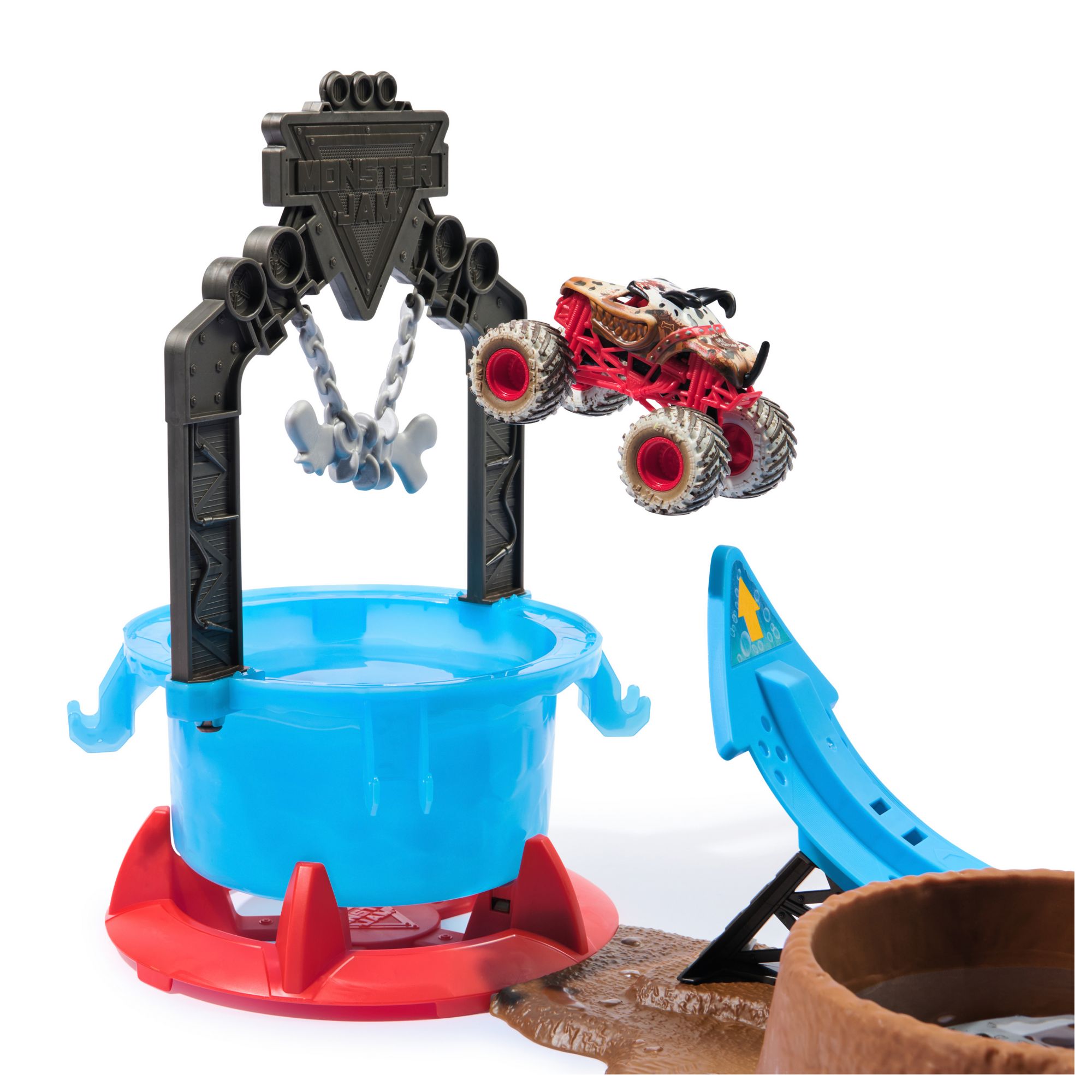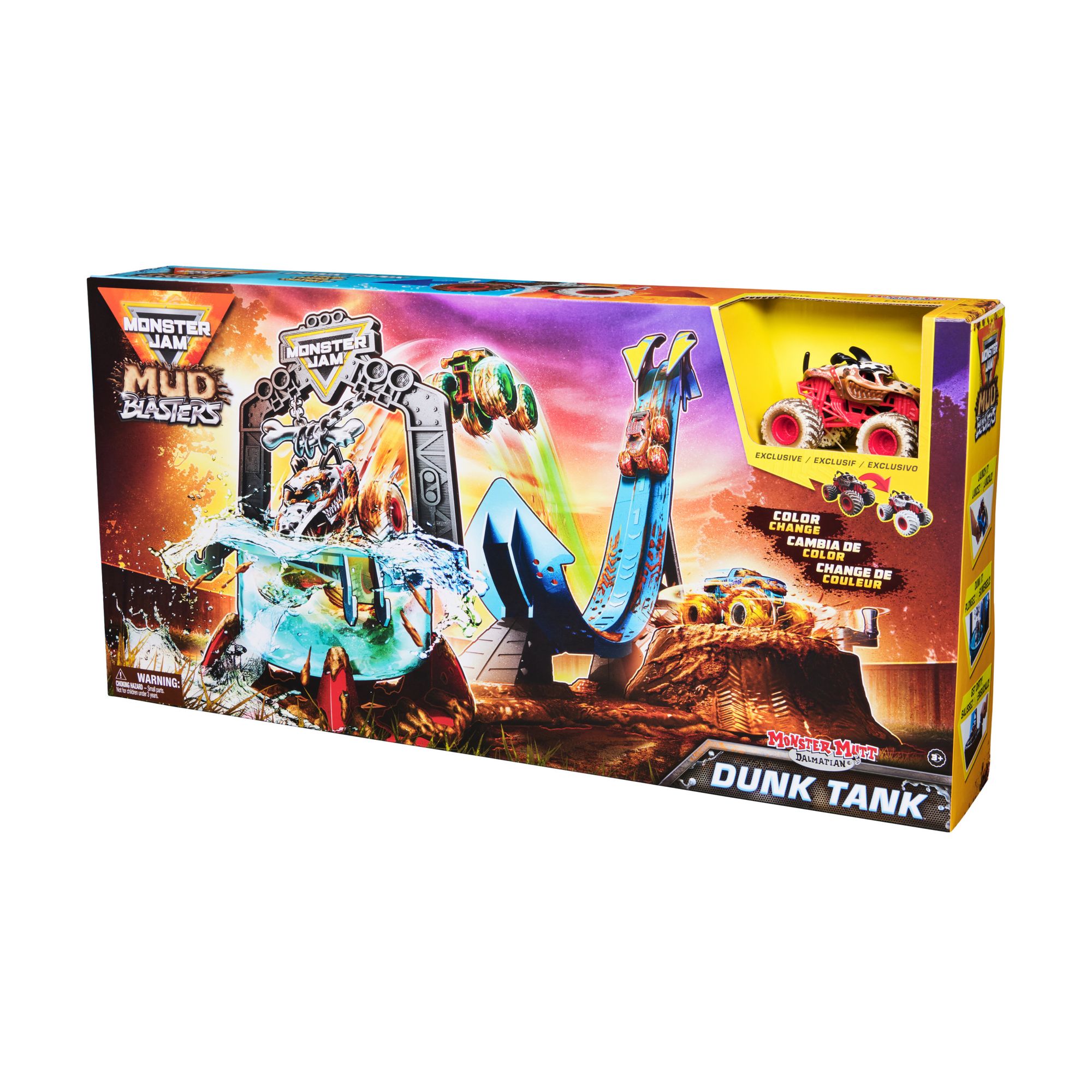All-in-one Monster Jam Playset: Launch and dunk to color change your 1:64 scale exclusive mud blasters monster mutt Dalmatian truck with the full stunt mud blasters playset