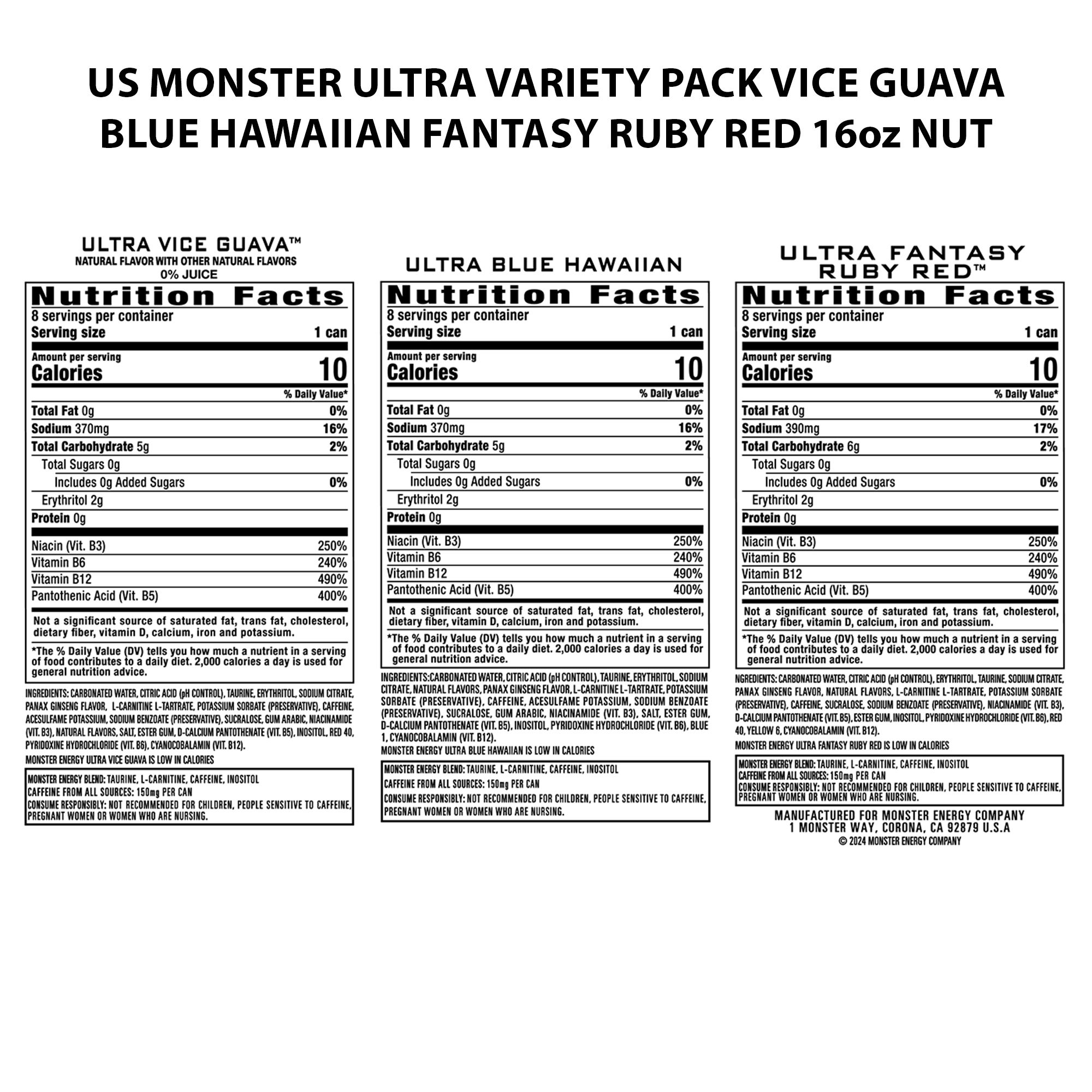Full flavor, zero sugar. Monster Energy Ultra has all the flavor you’re accustomed to and packed with their sugar-free Monster Energy blend. Three fantastic flavors will keep you energized and ready for all that life can throw at you. Ultra Vice Guava: a refreshing guava berry blend. Ultra Blue Hawaiian: Light and easy-drinking tropical blend. Ultra Fantasy Ruby Red is not too sweet, not too tart, it’s got a fresh citrus taste that’ll blow your mind. Unleash the Beast. The Monster Energy Ultra Variety Pack keeps your mind and body energized with its light and delicious zero-sugar flavors. At just 10 calories and 150 mg of caffeine, Monster Energy Ultra carries the full energy blend you'd expect - great for any time of day for the perfect pick-me-up.