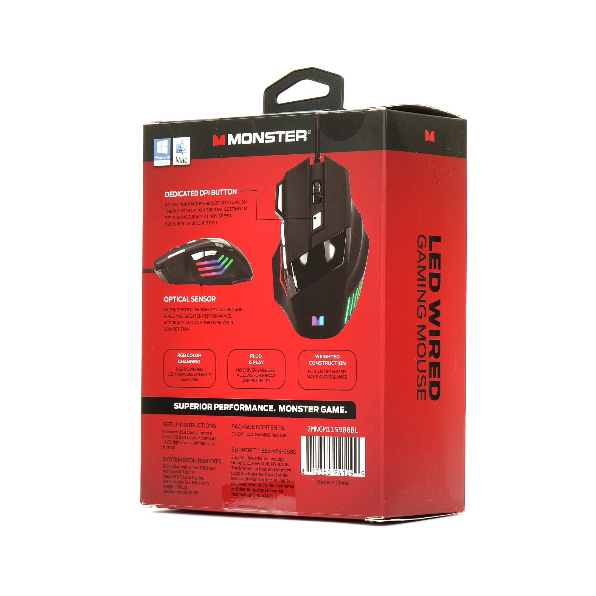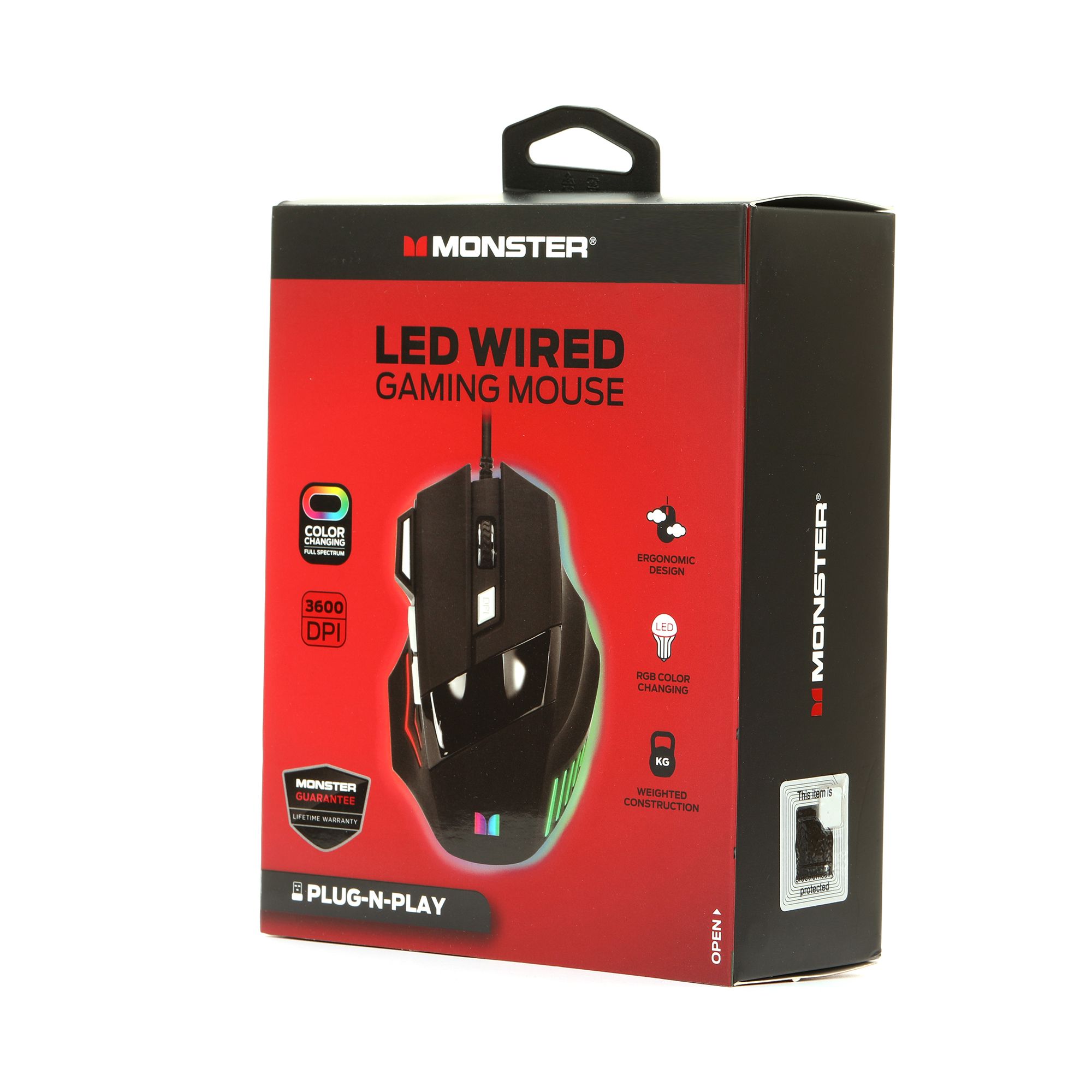 Game in style with this wired mouse from Monster. The ergonomic design features a weighted construction and full spectrum color-changing LEDs for added detail. Simply plug it into your computer and play in a sleek fashion.