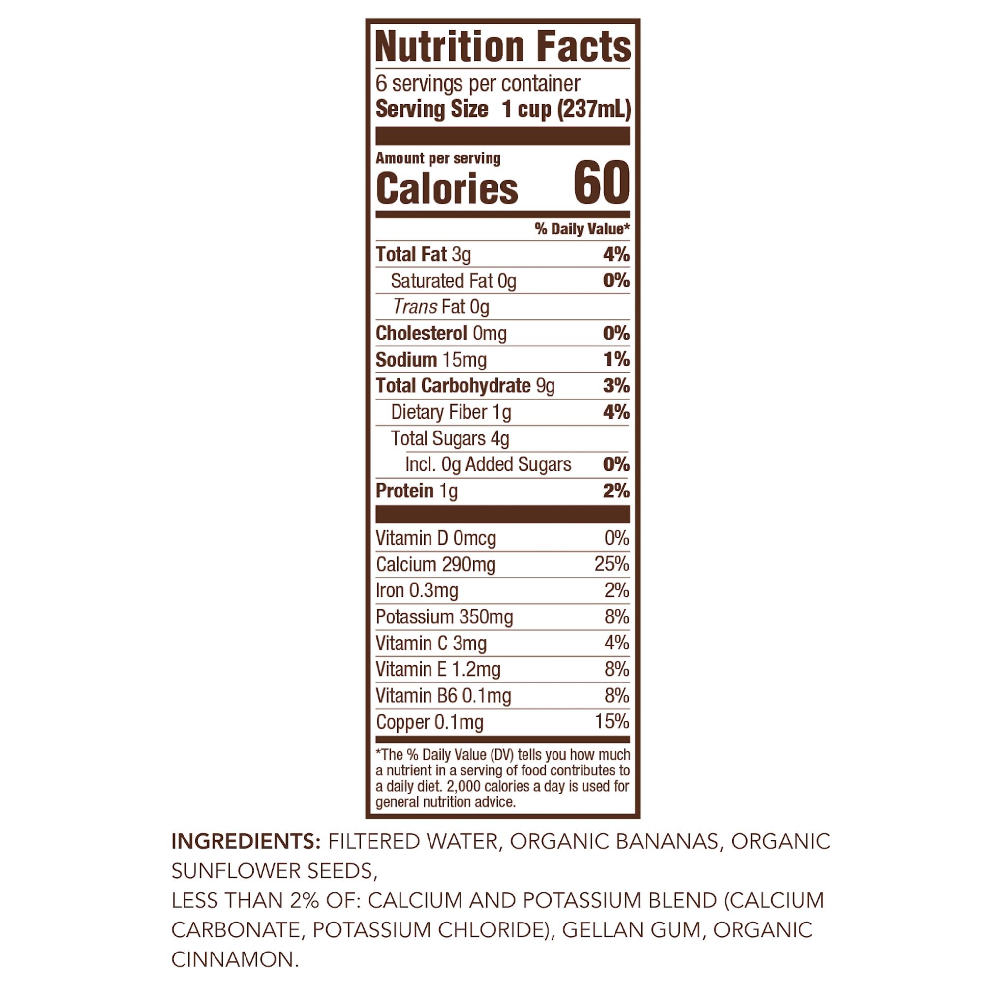 Filtered Water, Organic Bananas, Organic Sunflower Seeds, Less than 2% of: Calcium and Potassium Blend (Calcium Carbonate and Potassium Chloride), Gellan Gum, Organic Cinnamon