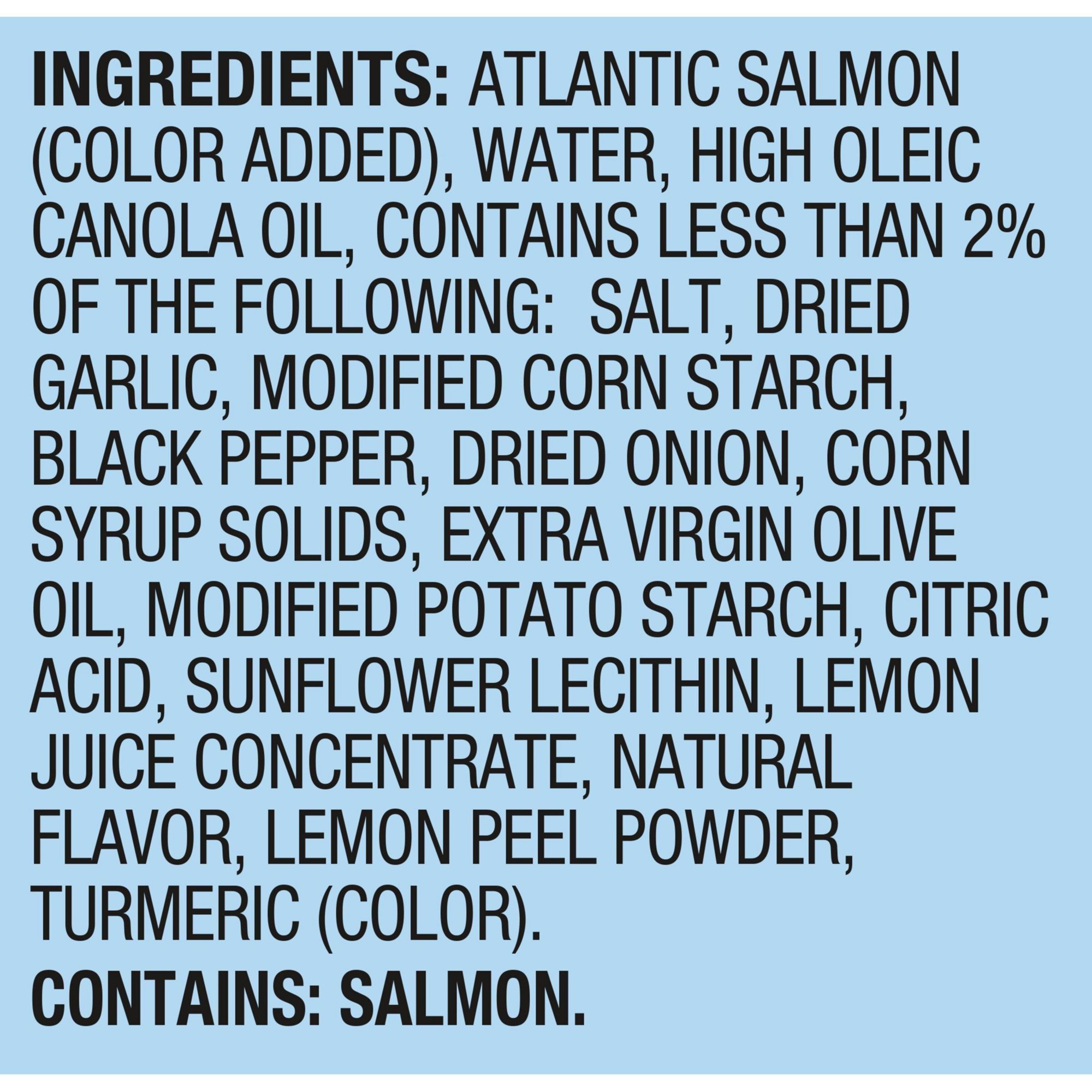 Ingredients: Atlantic Salmon (Color Added), Water, High Oleic Canola Oil, Contains Less Than 2% Of The Following: Salt, Dried Garlic, Modified Corn Starch, Black Pepper, Dried Onion, Corn Syrup Solids, Extra Virgin Olive Oil, Modified Potato Starch, Citric Acid, Sunflower Lecithin, Lemon Juice Concentrate, Natural Flavor, Lemon Peel Powder, Turmeric (Color).