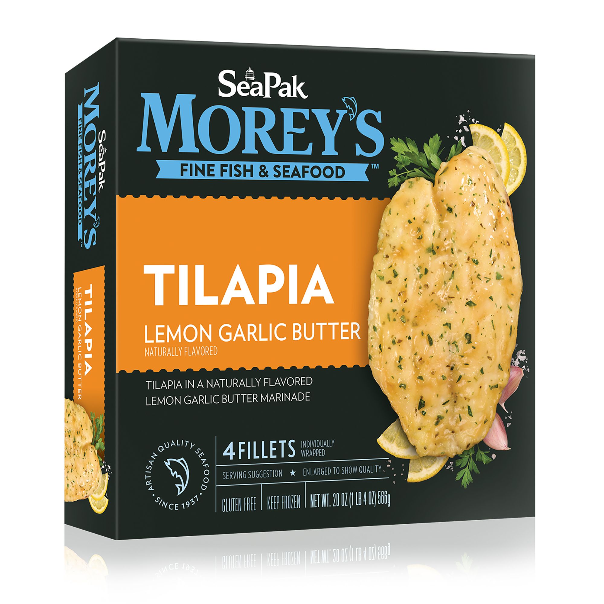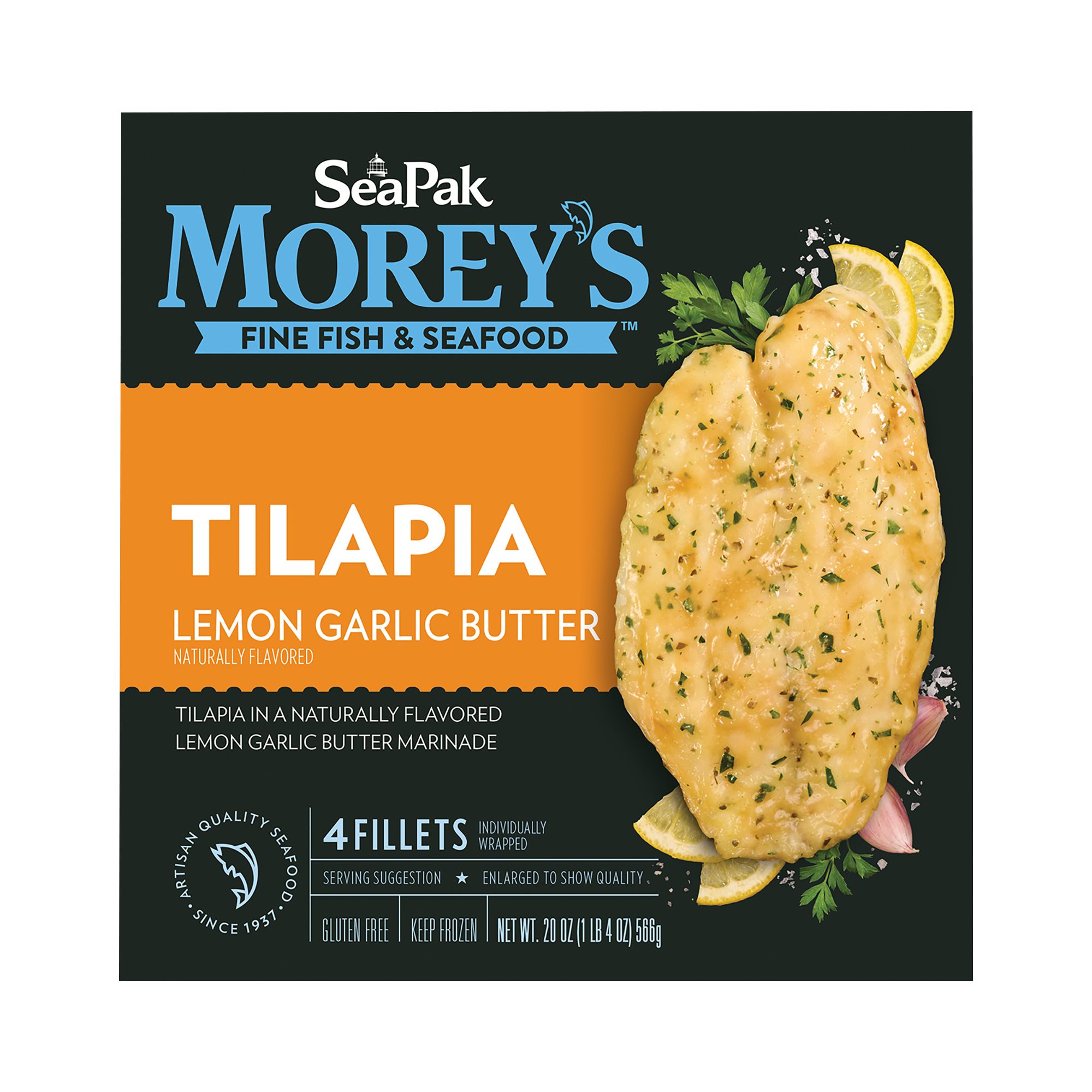 SeaPak Morey's Lemon Garlic Butter Tilapia is a naturally flavored tilapia fillet in a lemon garlic butter marinade. This product includes four individually wrapped portions that can be prepared from thawed or frozen in a conventional oven or on the grill. In 1937, a truck loaded with fresh fish broke down in Ed Morey’s hometown in the heart of Minnesota lake country. Ed traded a load of sweet corn for the load of fish, cured the fish in his smokehouse, and sold it to delighted friends and neighbors. Today, SeaPak Morey's is proud of their ability to deliver the highest quality seafood products available, conserve natural resources and drive positive change in the industry to ensure that this perfectly crafted, delicious seafood can be enjoyed for generations to come.