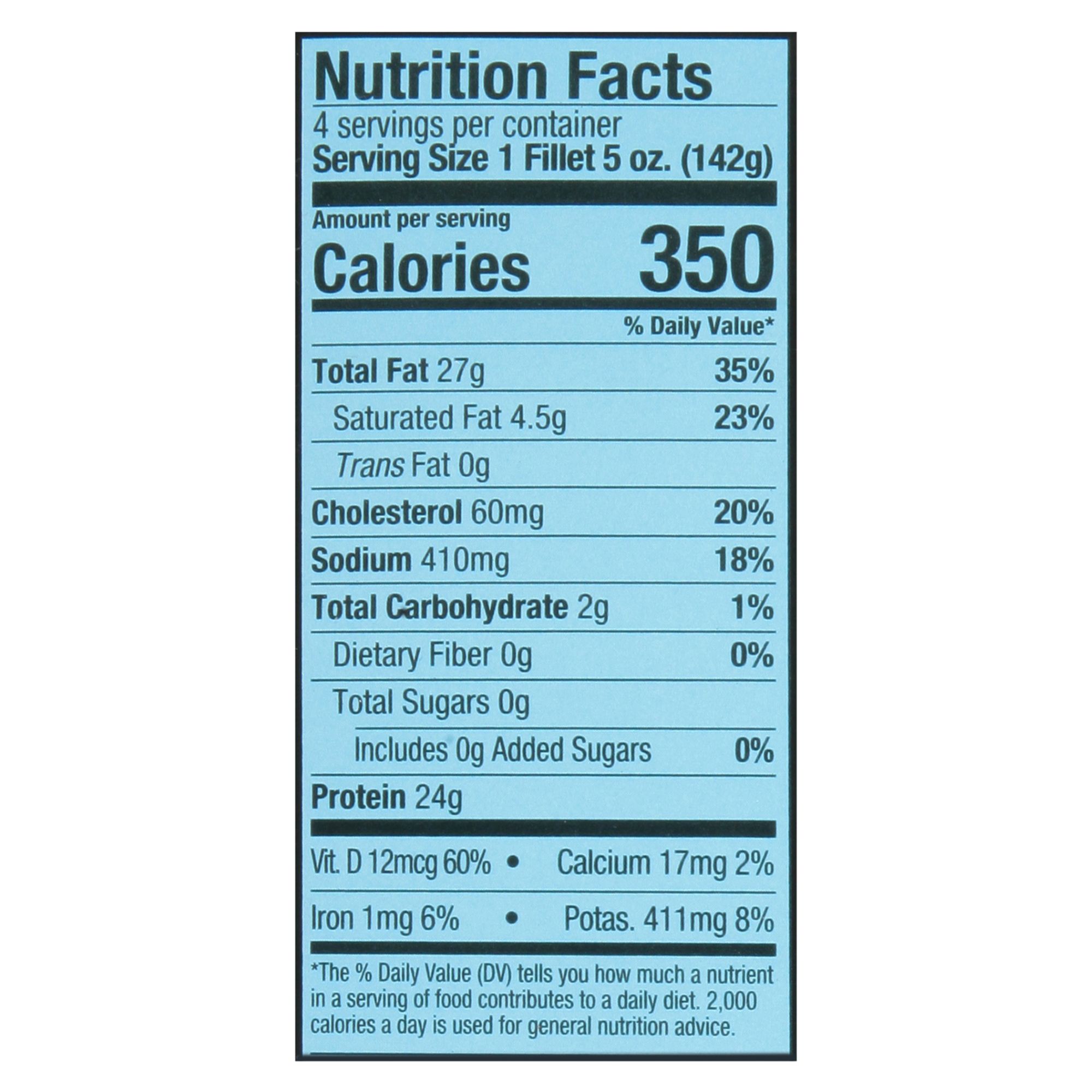Ingredients: Atlantic Salmon (Color Added), Water, Olive Oil Blend (Canola Oil and Olive Oil), Salt, Natural Flavors (with Smoke and Grill Flavor), Spices, Dehydrated Garlic, Paprika, Dehydrated Onion, Red Bell Pepper, Citric Acid.