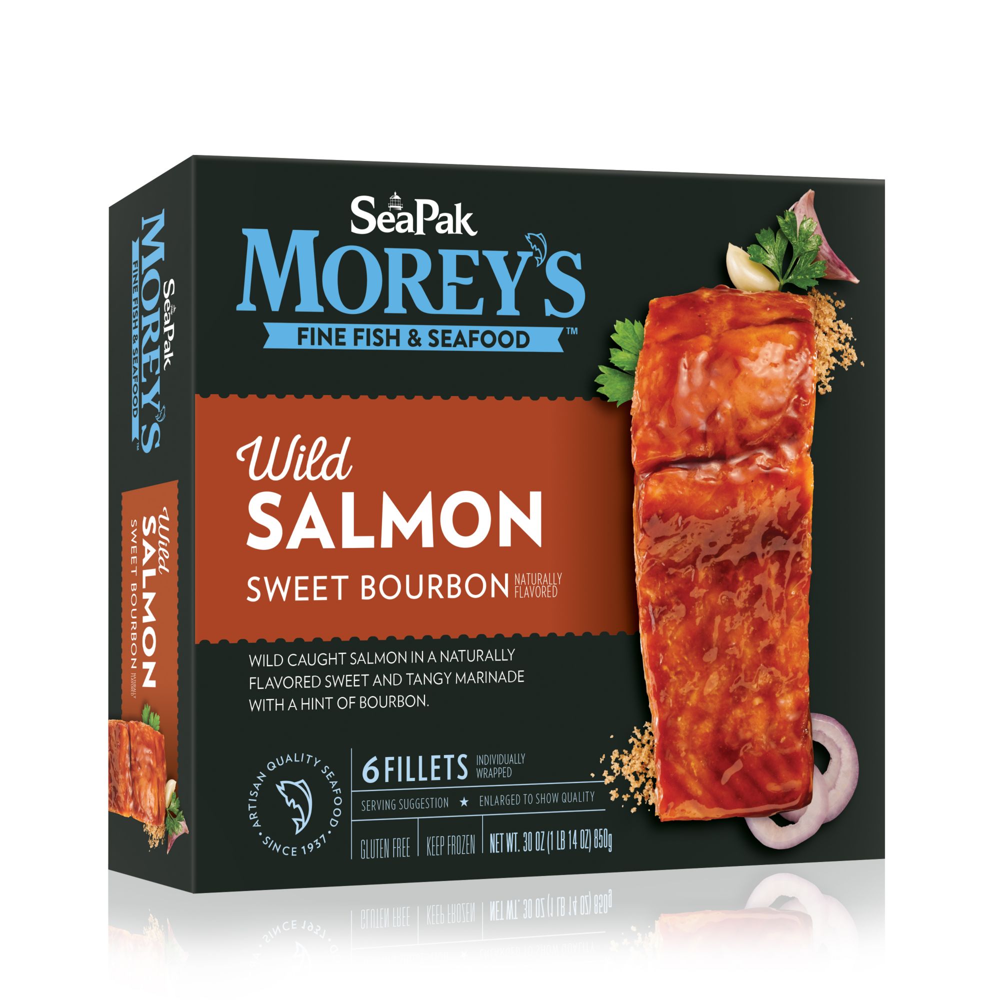SeaPak Morey's Sweet Bourbon Wild Salmon has a naturally flavored sweet and tangy marinade, with a hint of bourbon. This product includes six individually wrapped portions that can be prepared from thawed or frozen state in a conventional oven or on the grill. In 1937, a truck loaded with fresh fish broke down in Ed Morey’s hometown in the heart of Minnesota lake country. Ed traded a load of sweet corn for the load of fish, cured the fish in his smokehouse, and sold it to delighted friends and neighbors. Today, SeaPak Morey's is proud of their ability to deliver the highest quality seafood products available, conserve natural resources and drive positive change in the industry to ensure that this perfectly crafted, delicious seafood can be enjoyed for generations to come.