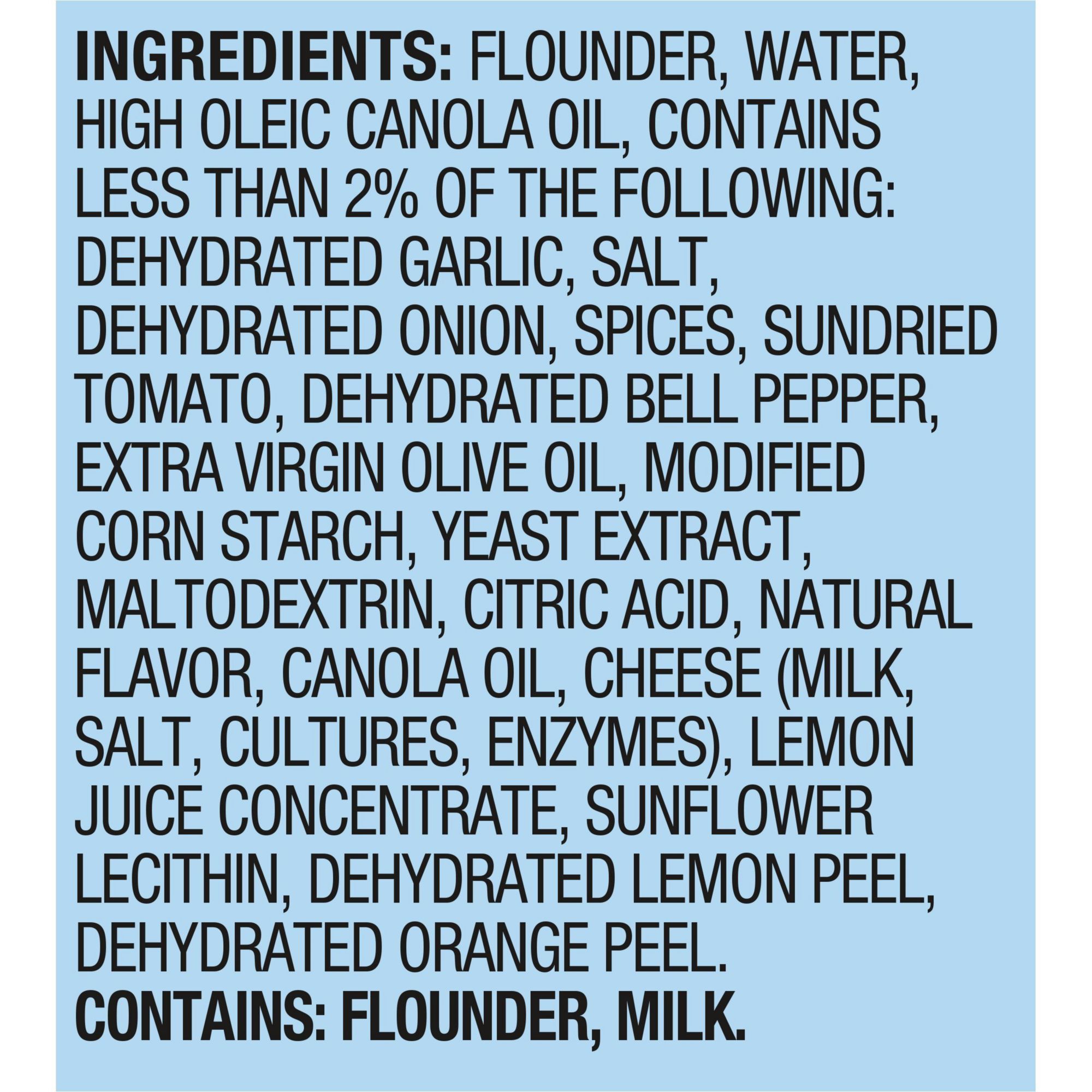 Ingredients: Flounder, Water, High Oleic Canola Oil, Contains Less Than 2% Of The Following: Dehydrated Garlic, Salt, Dehydrated Onion, Spices, Sundried Tomato, Dehydrated Bell Pepper, Extra Virgin Olive Oil, Modified Corn Starch, Yeast Extract, Maltodextrin, Citric Acid, Natural Flavor, Canola Oil, Cheese (Milk, Salt, Cultures, Enzymes), Lemon Juice Concentrate, Sunflower Lecithin, Dehydrated Lemon Peel, Dehydrated Orange Peel.