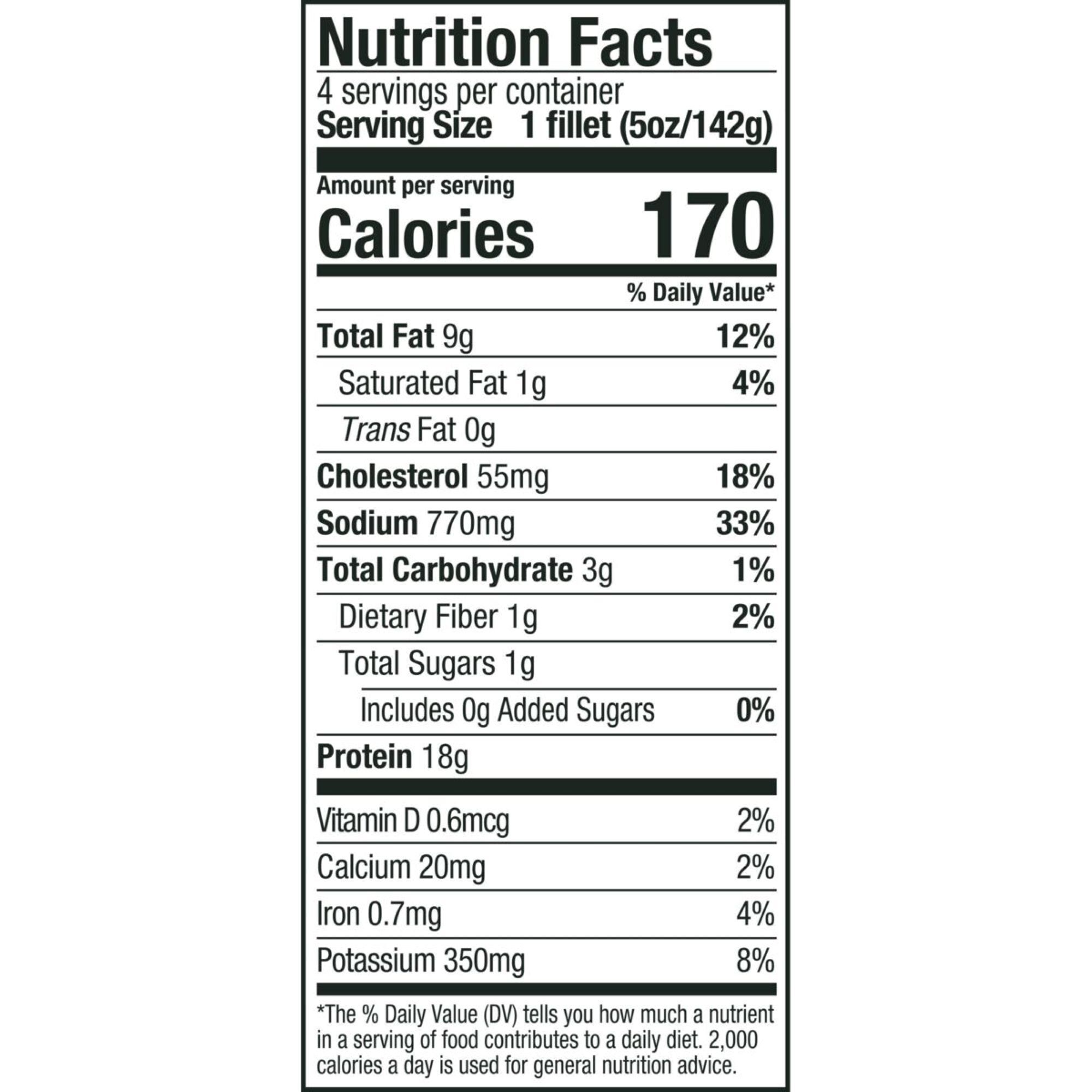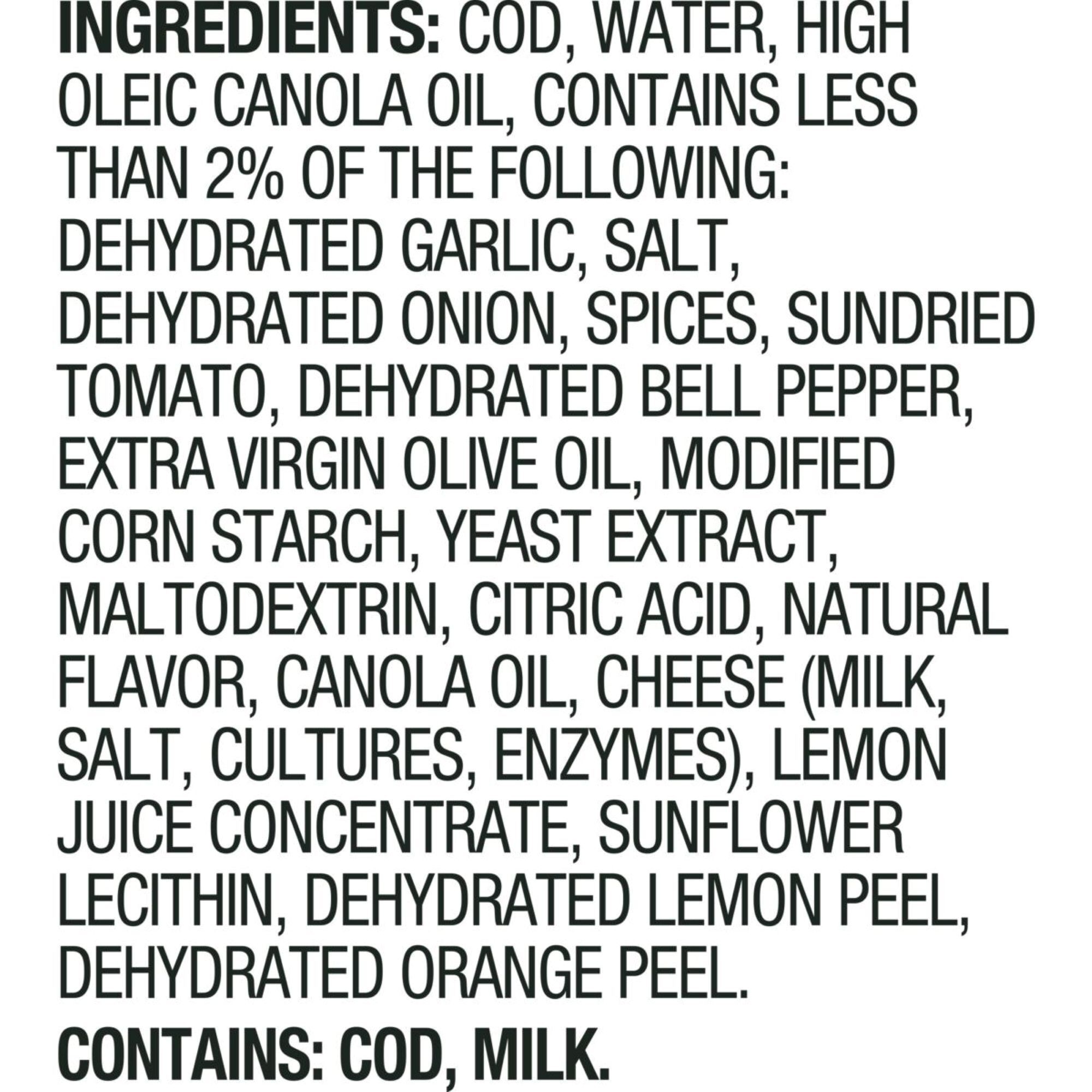 Ingredients: Cod, Water, High Oleic Canola Oil, Contains Less Than 2% Of The Following: Dehydrated Garlic, Salt, Dehydrated Onion, Spices, Sundried Tomato, Dehydrated Bell Pepper, Extra Virgin Olive Oil, Modified Corn Starch, Yeast Extract, Maltodextrin, Citric Acid, Natural Flavor, Canola Oil, Cheese (Milk, Salt, Cultures, Enzymes), Lemon Juice Concentrate, Sunflower Lecithin, Dehydrated Lemon Peel, Dehydrated Orange Peel.
